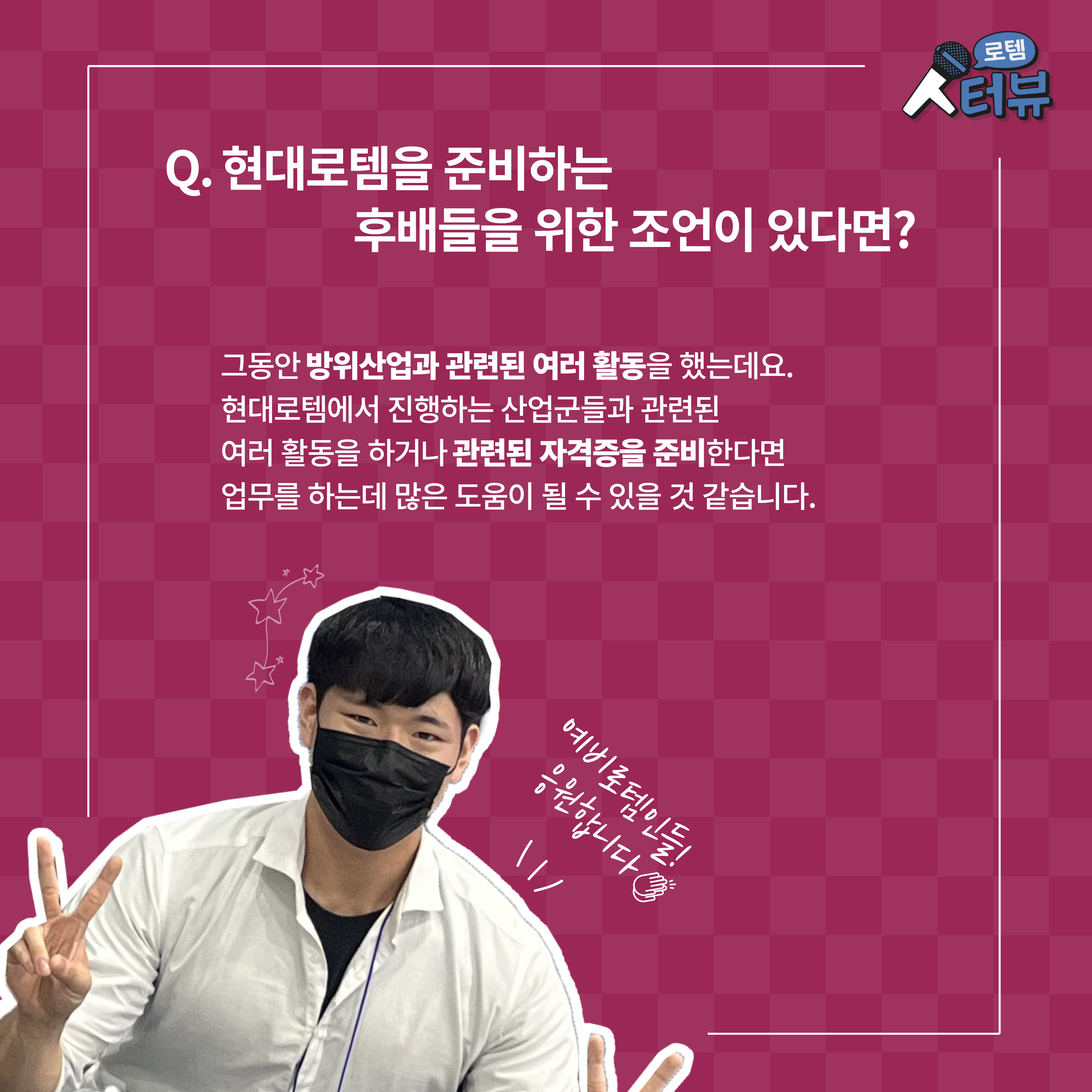 이어 윤 매니저는 현대로템을 준비하는 후배들을 위한 조언도 빼놓지 않았는데요. 그는 “그동안 방위산업과 관련된 여러 활동을 했다”며 “현대로템에서 진행하는 산업군들과 관련된 여러 활동을 하거나 관련된 자격증을 준비한다면 업무를 하는데 많은 도움이 될 수 있을 것 같습니다”고 말했습니다.