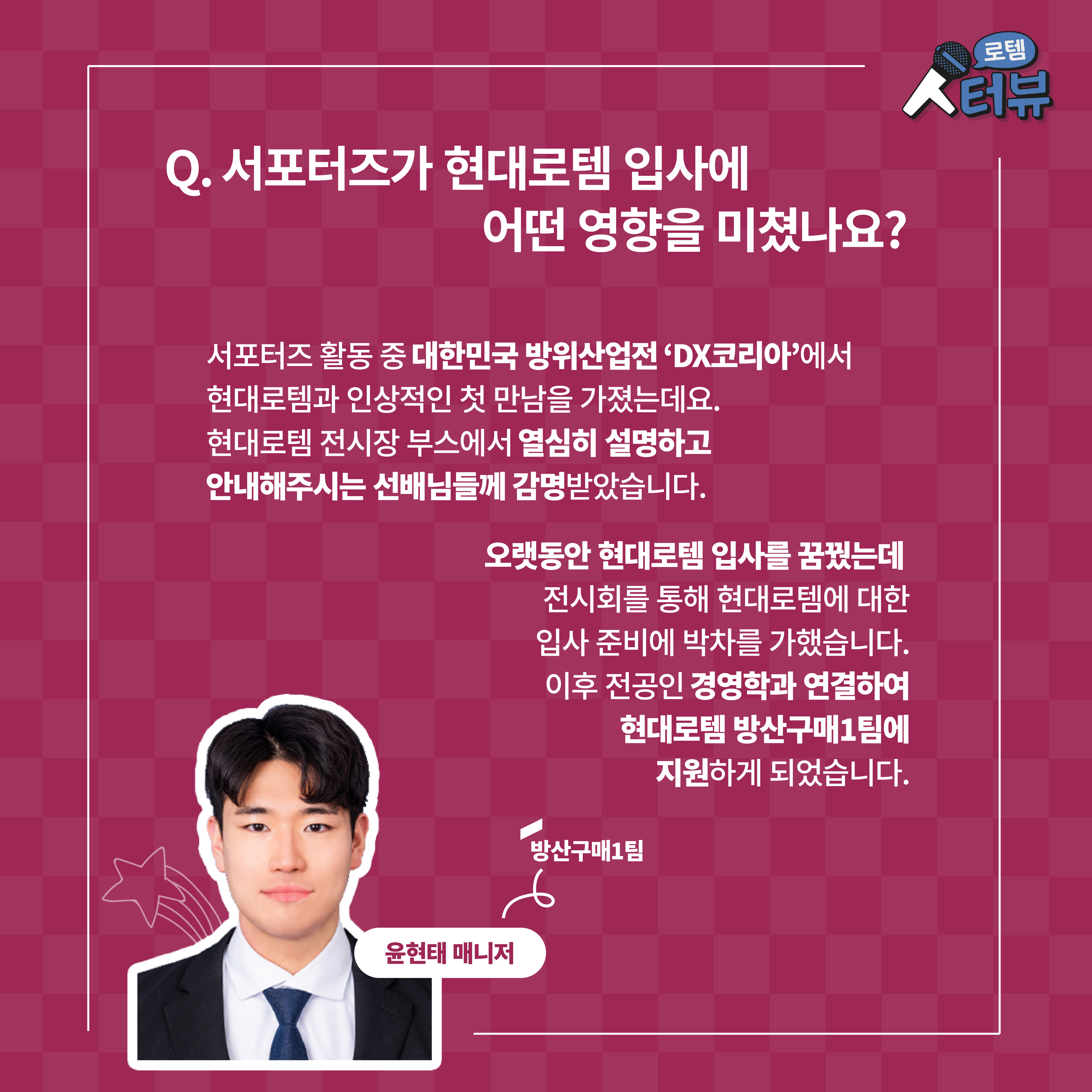 특히 현대로템과는 서포터즈 활동 중 대한민국 방위산업전 ‘DX코리아’에서 인상적인 첫 만남을 가졌다고 합니다. 윤현태 매니저는 “현대로템 전시장 부스에서 열심히 설명하고 안내해주시는 선배님들께 감명받았다”며 “오랫동안 현대로템 입사를 꿈꿨는데 전시회를 통해 현대로템에 대한 입사 준비에 박차를 가한 것 같다”고 밝혔습니다. 이후 전공인 경영학과 연결하여 현대로템 방산구매1팀에 지원하게 되었다고 합니다.