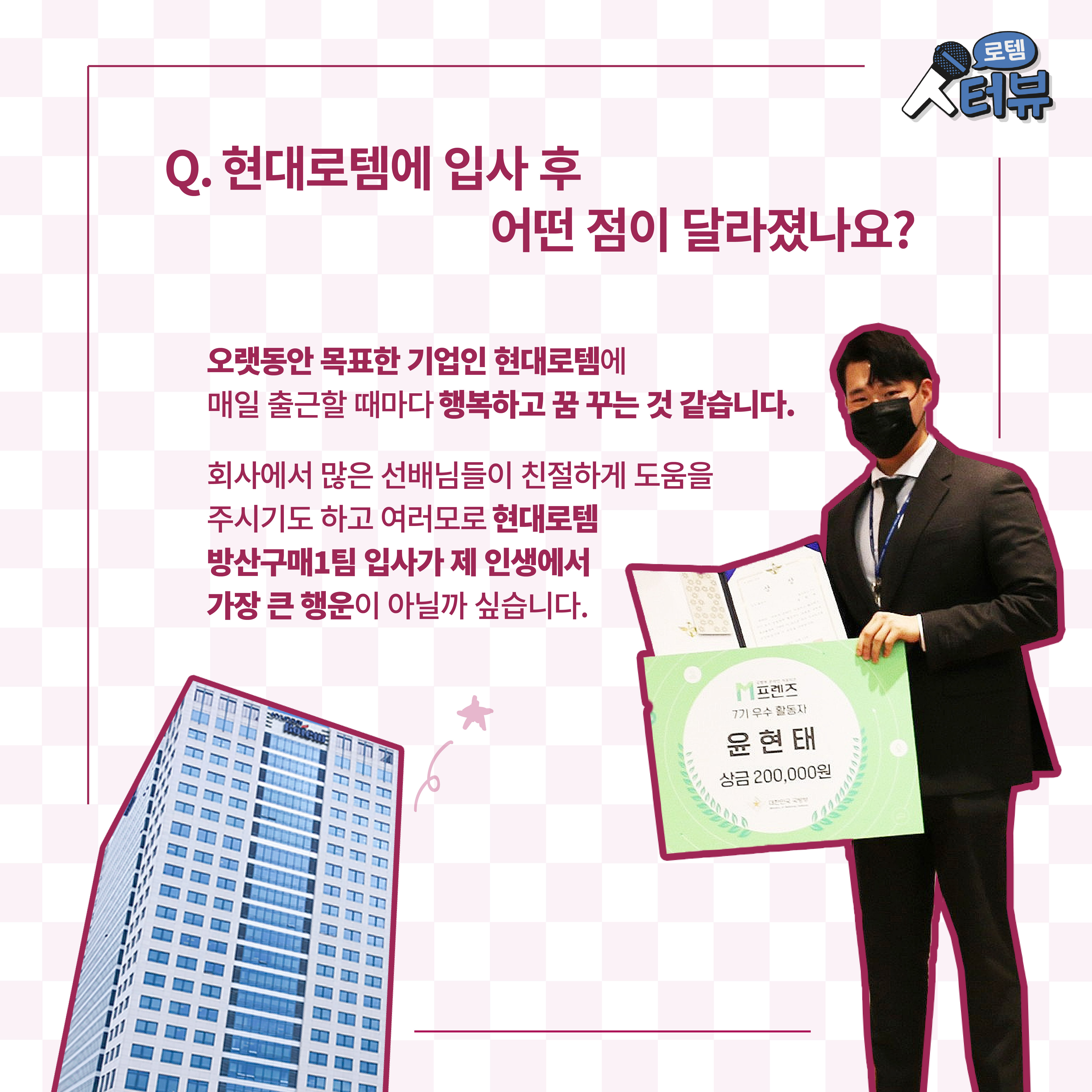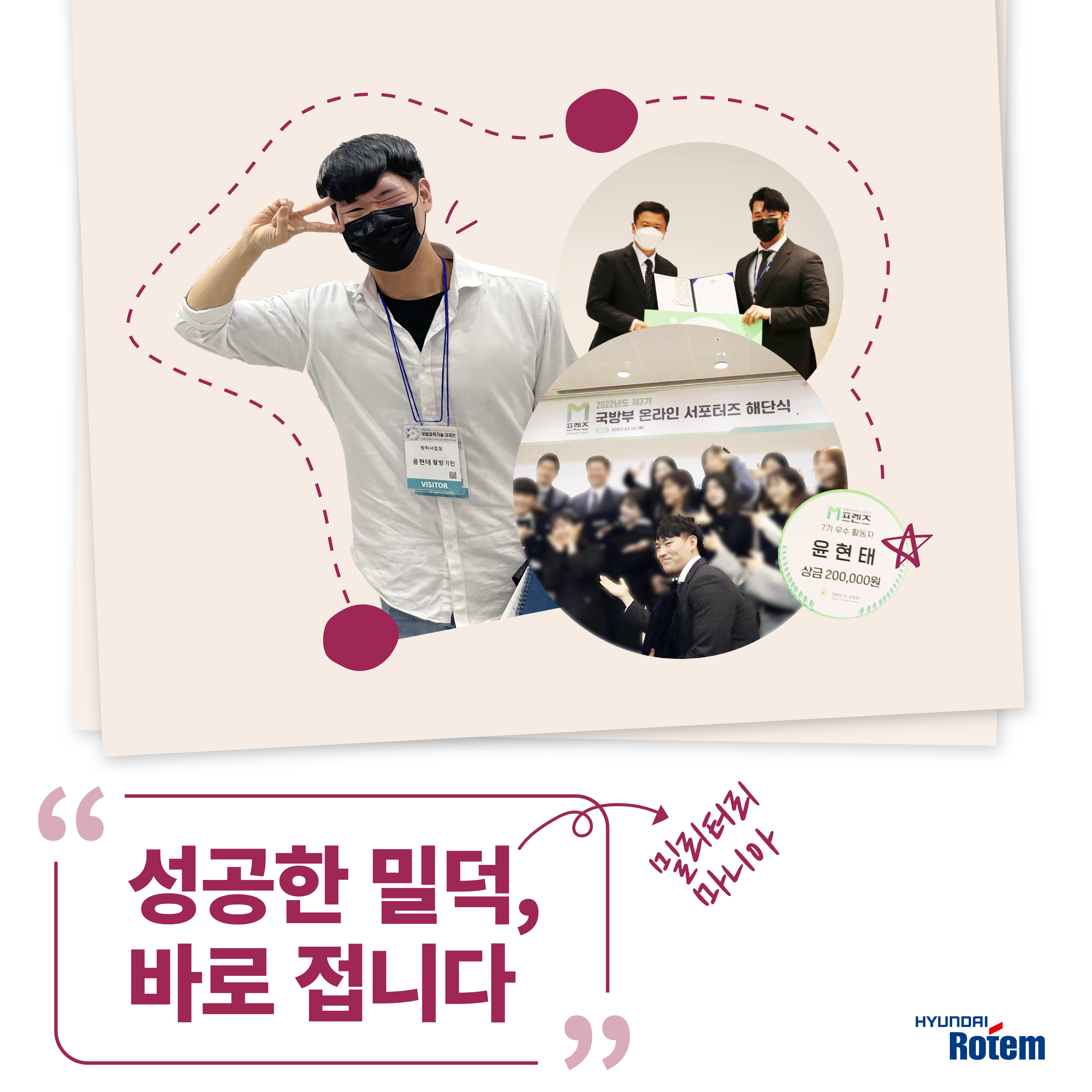 한주 내내 미세먼지가 기승을 부렸는데요. 다들 몸 관리 잘하고 계신가요. 취업을 준비하고 계신 분들은 몸 관리하랴, 다가올 취업 시즌을 위해 스펙 관리하랴 바쁜 한때를 보낼 거 같습니다. 현대로템에도 치열한 취준생 시절을 지나 2022년 11월에 입사한 신입사원이 있는데요. ‘국방부 대학생 서포터즈 M-프렌즈’ 활동으로 현대로템과 연을 맺은 방산구매팀 윤현태 매니저입니다.