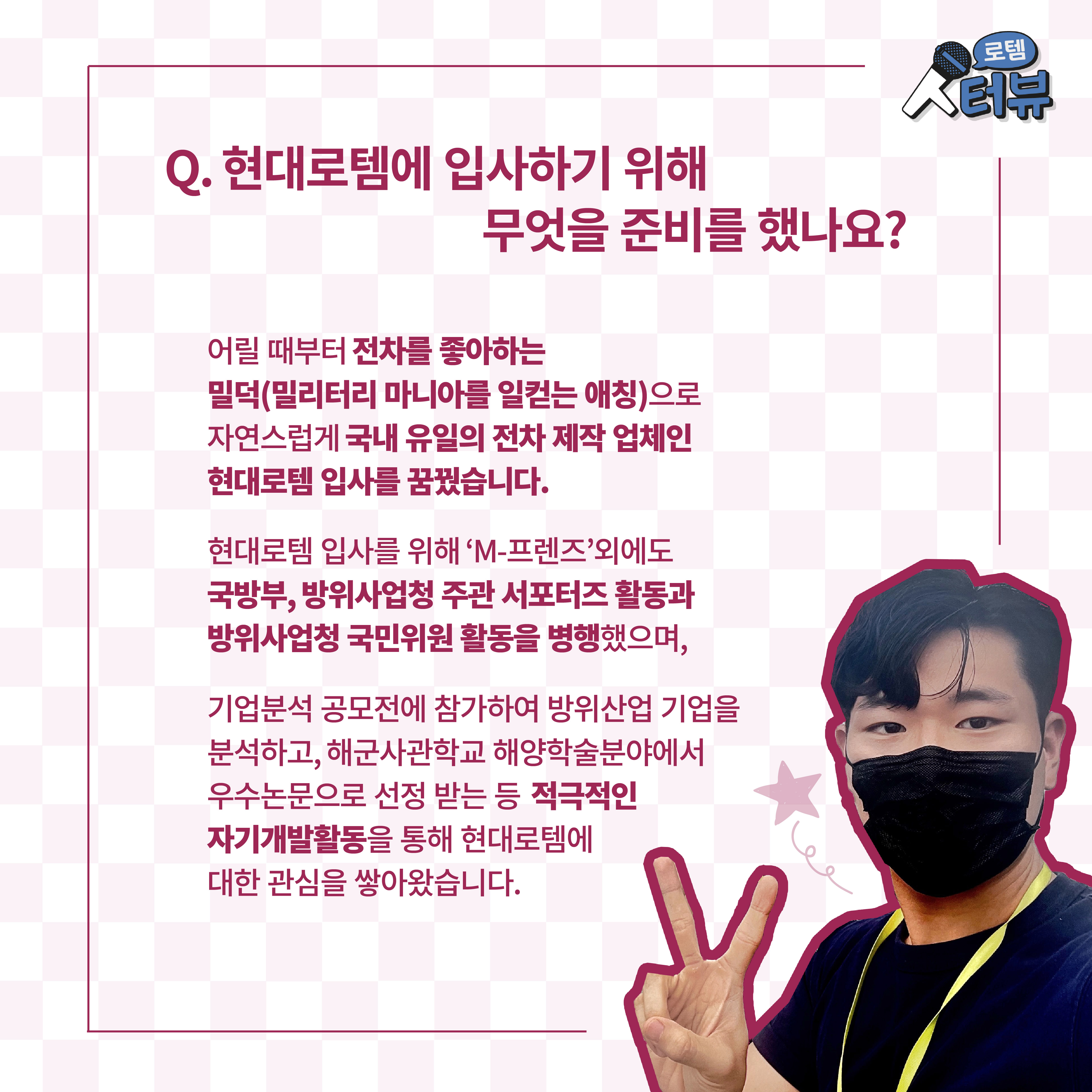 윤 매니저는 어릴 때부터 전차를 좋아하는 밀덕(밀리터리 마니아를 일컫는 애칭)으로 자연스럽게 국내 유일의 전차 제작 업체인 현대로템 입사를 꿈꿨다고 합니다. 현대로템 입사를 위해 ’국방부 대학생 서포터즈 M-프렌즈’외에도 국방부, 방위사업청 주관 서포터즈 활동과 방위사업청 국민위원 활동을 병행했으며, 기업분석 공모전에 참가하여 방위산업 기업을 분석하고, 해군사관학교 해양학술분야에서 우수논문으로 선정 받는 등 적극적인 자기개발활동을 통해 현대로템에 대한 관심을 쌓아왔습니다.