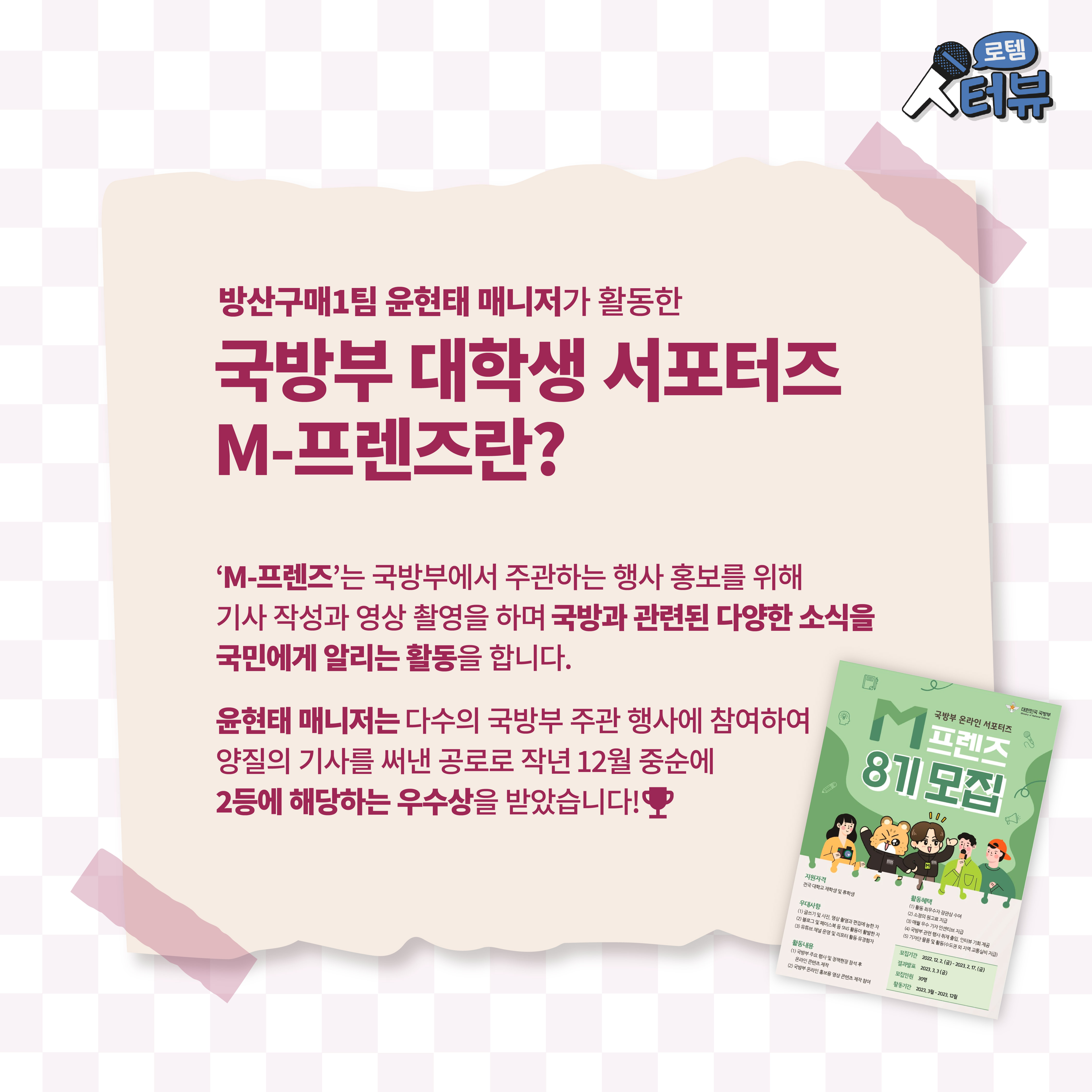 M-프렌즈는 국방부에서 주관하는 행사 홍보를 위해 기사 작성과 영상 촬영을 하며 국방과 관련된 다양한 소식을 국민에게 알리는 활동을 합니다. 윤현태 매니저는 다수의 국방부 주관 행사에 참여하여 양질의 기사를 써낸 공로로 작년 12월 중순에 2등에 해당하는 우수상을 받았는데요.