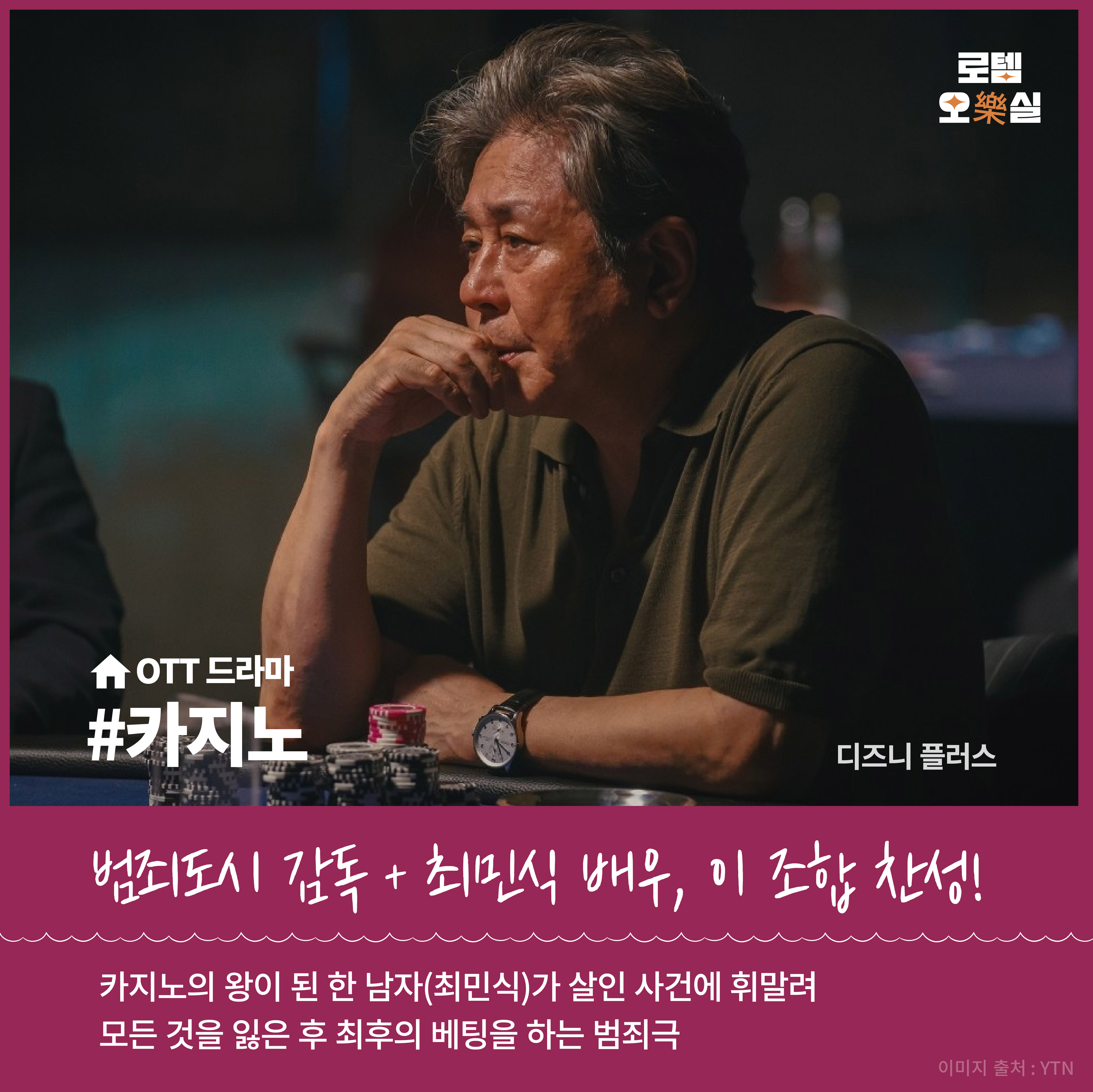 범죄 장르물을 좋아하는 분들이라면 이 드라마가 딱인데요. 매주 수요일마다 새로운 에피소드가 공개되고 있어요. 디즈니플러스 오리지널 드라마 ‘카지노’입니다. 카지노의 왕이 된 한 남자(최민식)가 살인 사건에 휘말려 모든 것을 잃은 후 최후의 베팅을 하는 범죄극입니다. 이 드라마는 영화 ‘범죄도시’의 강윤성 감독이 만들고, 드라마로 24년만에 복귀하는 최민식 배우가 출연해 공개 전부터 많은 관심을 받았는데요. 이 뜨거운 화제작과 함께 연휴 보내보면 거 어떨까요.