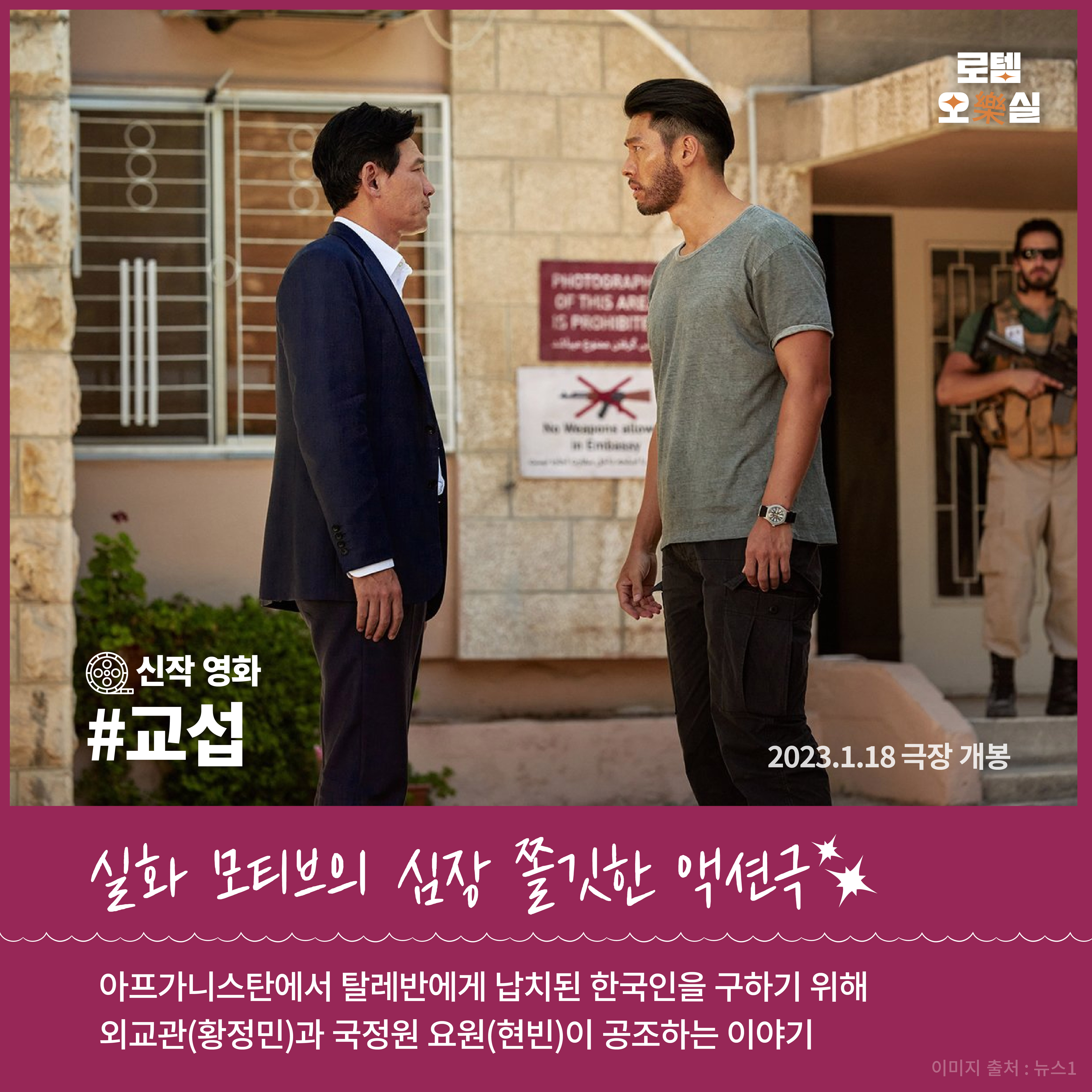 설 근처에 늘 쟁쟁한 작품들이 대거 나왔었는데요. 올해 설에는 액션 영화 ‘교섭’이 극장에서 상영됩니다. 1월 18일에 개봉 예정인 ‘교섭’은 2007년 샘물교회 선교단 아프가니스탄 피랍 사건을 모티브로 한 영화인데요. 아프가니스탄에서 탈레반에게 납치된 한국인을 구하기 위해 외교관(황정민)과 국정원 요원(현빈)이 공조하는 이야기입니다. 한국영화 최초로 요르단에서 촬영하여 광활하고 이국적인 풍경을 담아냈다고 합니다. 극장에서 ‘교섭’ 관람하며 가족들과 심장 쫄깃한 시간 보내시길 바랍니다.