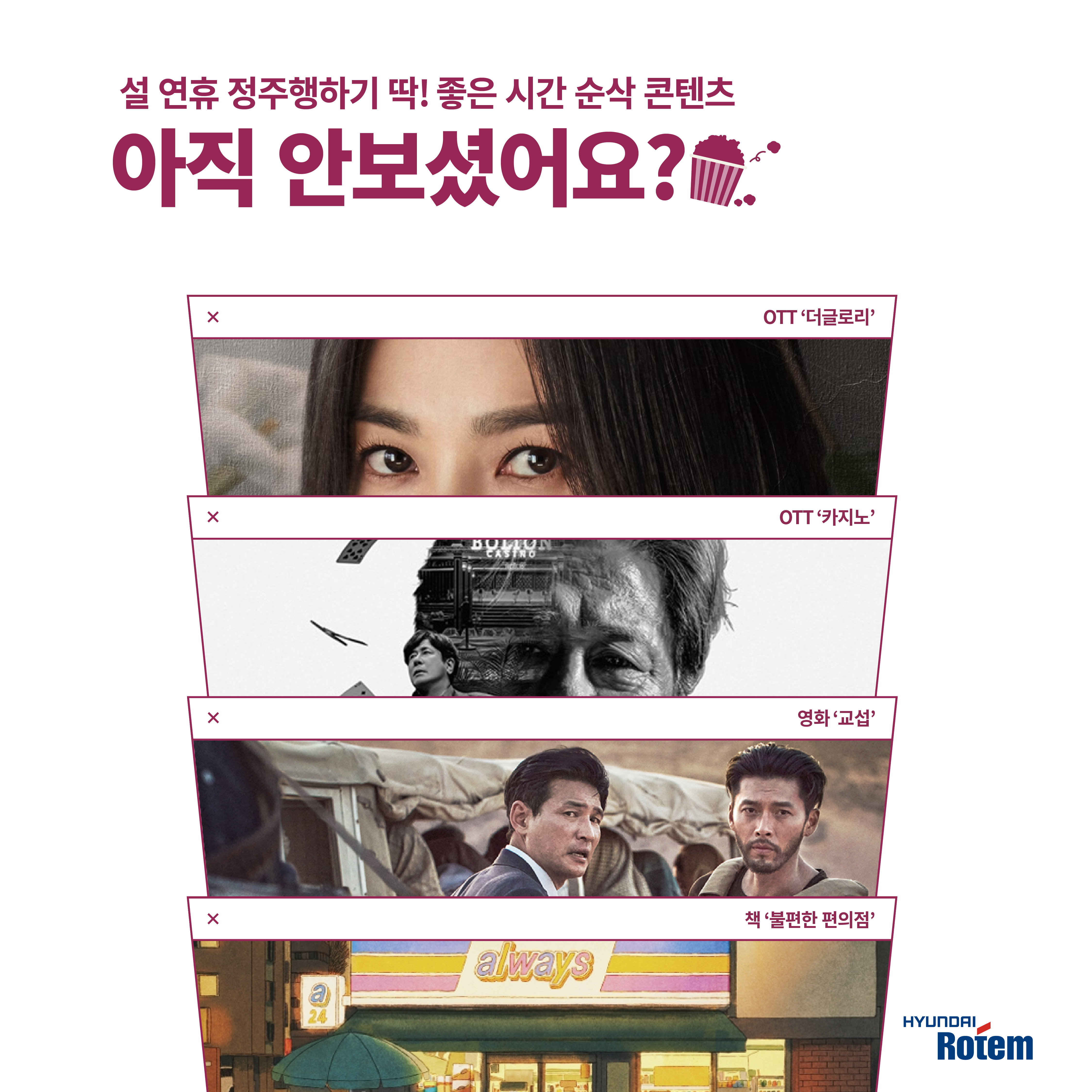 연휴 동안 어떻게 지낼 계획이세요. 오랜만에 해외여행을 가는 분도 있고, 고향집에 가족을 만나러 가는 분도 있겠죠. 또는 업무에 지친 일상을 재충전하며 푹 휴식을 취하는 분도 있을 것 같아요. 각자 본인만의 설을 잘 보내는게 중요하지요. 오늘 로템오락실에서는 정주행하기 좋은 드라마, 신작 영화, 읽을 만한 책까지 추천드려봅니다.