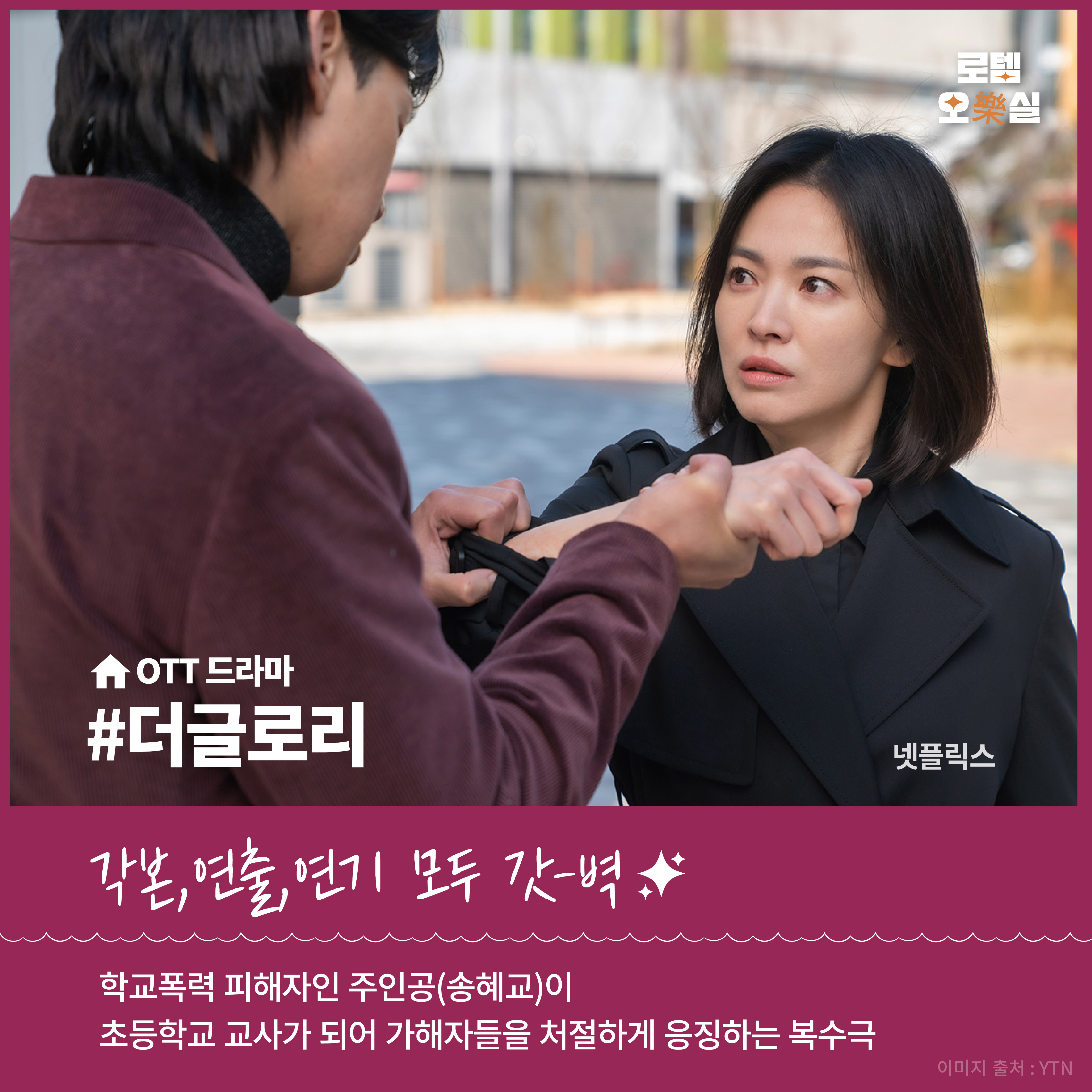 요즘 가장 뜨거운 넷플릭스 오리지널 드라마 ‘더 글로리’. 학교폭력 피해자인 주인공(송혜교)이 초등학교 교사가 되어 가해자들을 처절하게 응징하는 복수극입니다. ‘더 글로리’의 매력은 배우들의 연기력과 탄탄한 각본, 연출에 있는데요. 8회로 구성된 시즌 1을 이미 보신 분들은 시즌 2 나올 날만 기다리실 것 같습니다. 보기 시작하면 앉은 자리에서 모두 정주행한다는 ‘더 글로리’로 이번 설 연휴 한번 달려보실까요.
