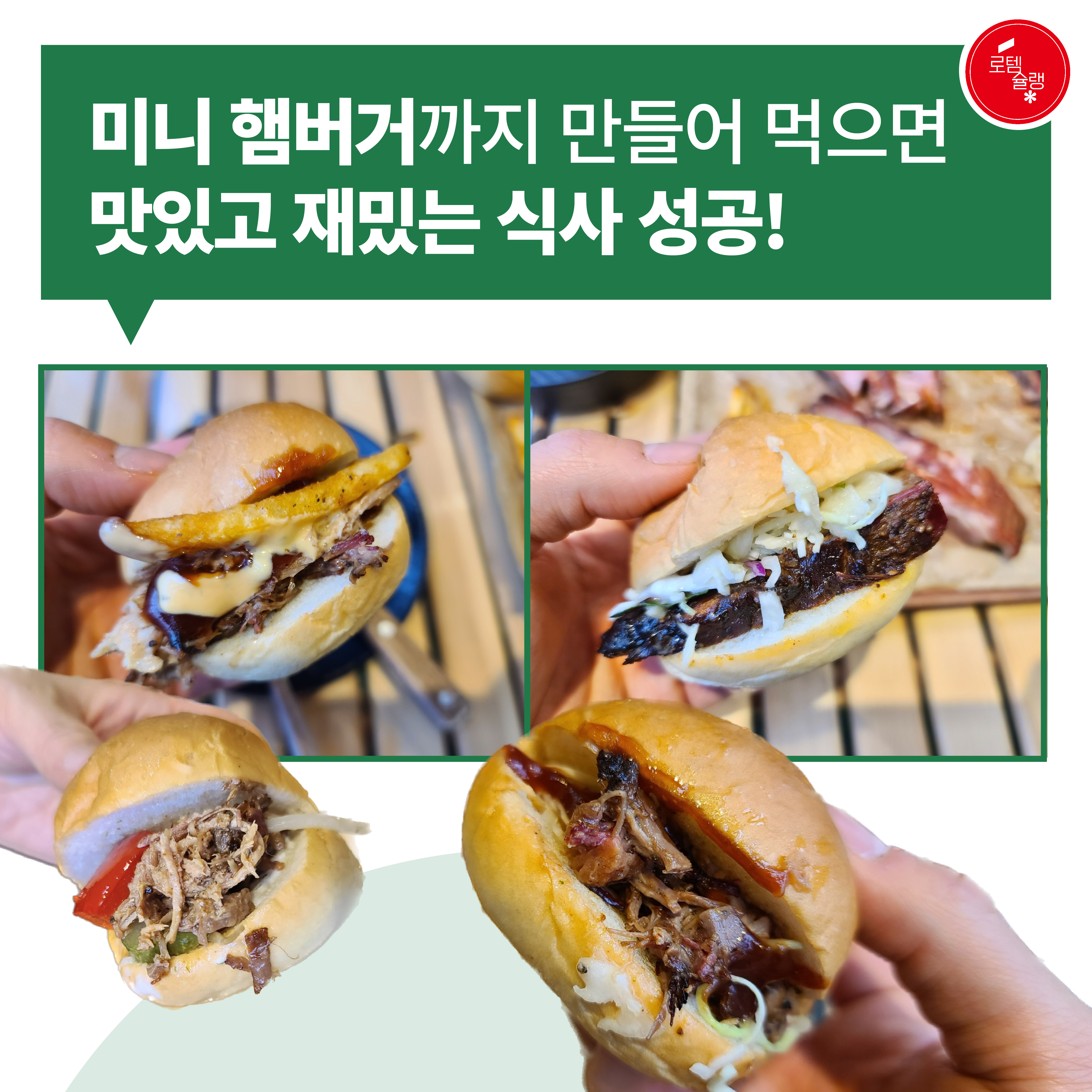 반을 가른 빵 사이에 메뉴를 섞어 미니 햄버거를 만들어 먹으면 더 맛있고 재밌어요. 입맛에 따라 달콤하게 또는 매콤하게 다양한 맛을 즐길 수 있어 입이 심심할 틈이 없습니다.