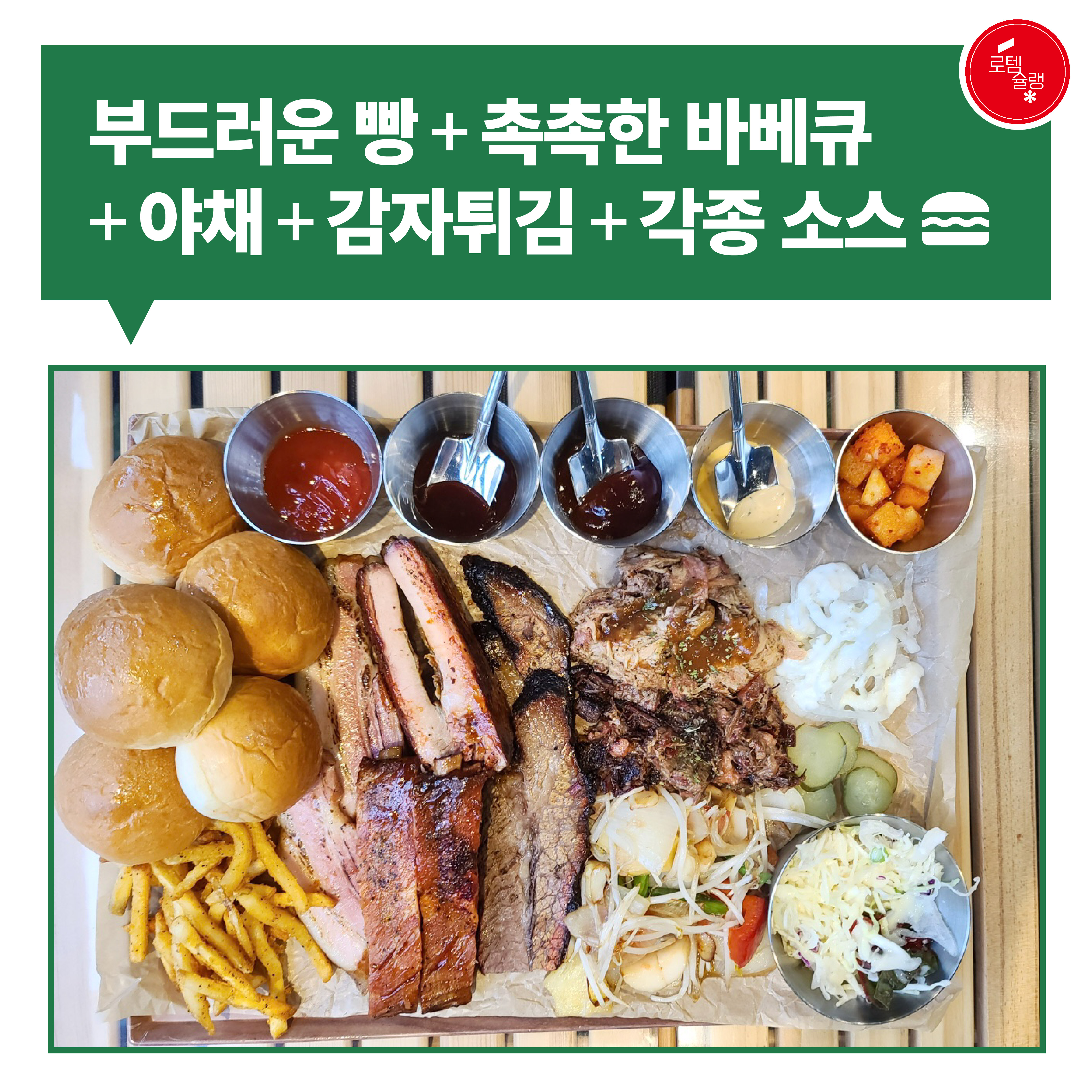 바베큐의왕은 요즘 인기인 텍사스 스타일의 BBQ에요. 부드러운 빵, 촉촉한 촉감의 바베큐, 야채, 감자튀김 등을 각종 소스와 함께 즐기는 요리인데요. 2인부터 사람수에 맞게 주문할 수 있어요. 사람수에 따라 양이 조금 달라질 뿐 플래터 구성은 같아요.