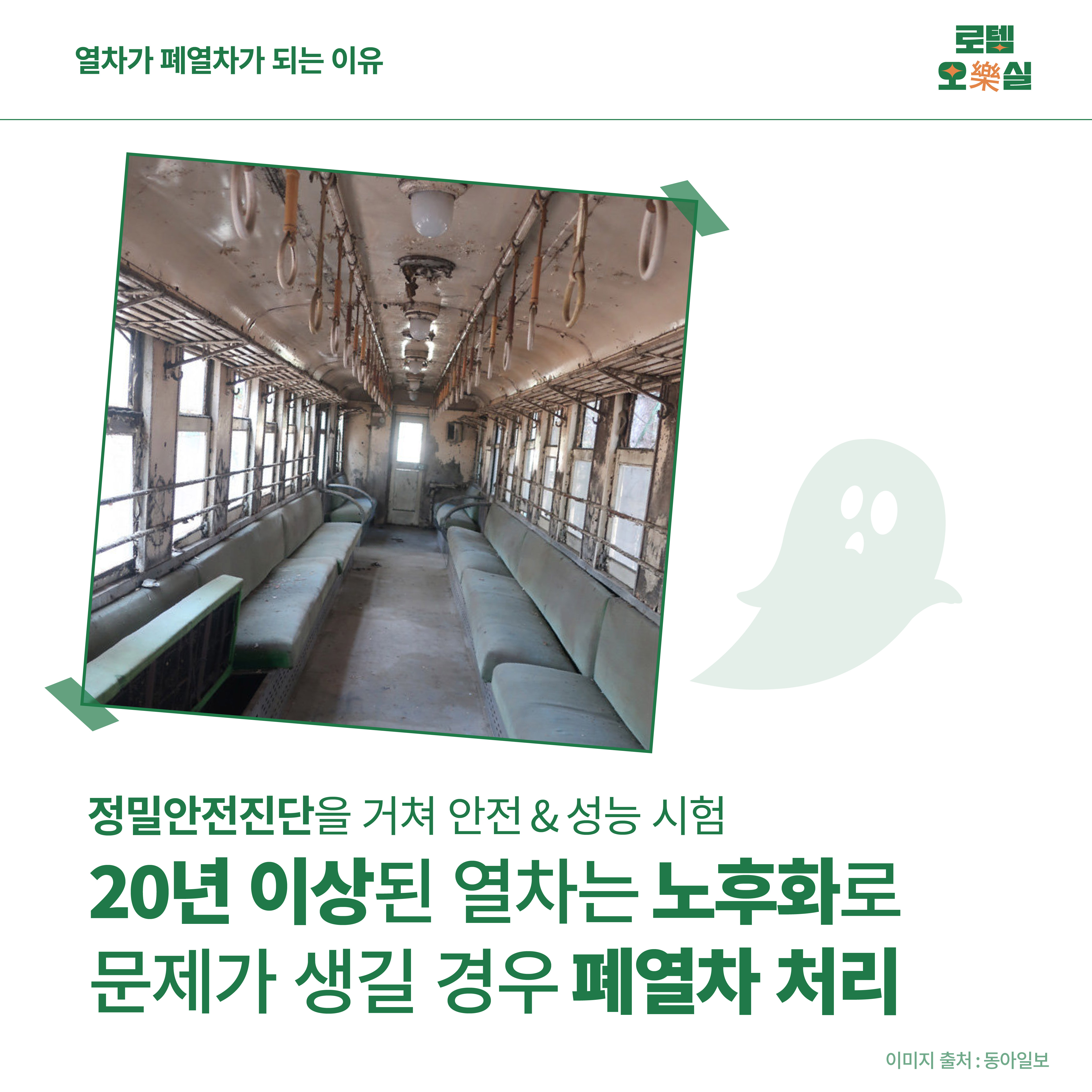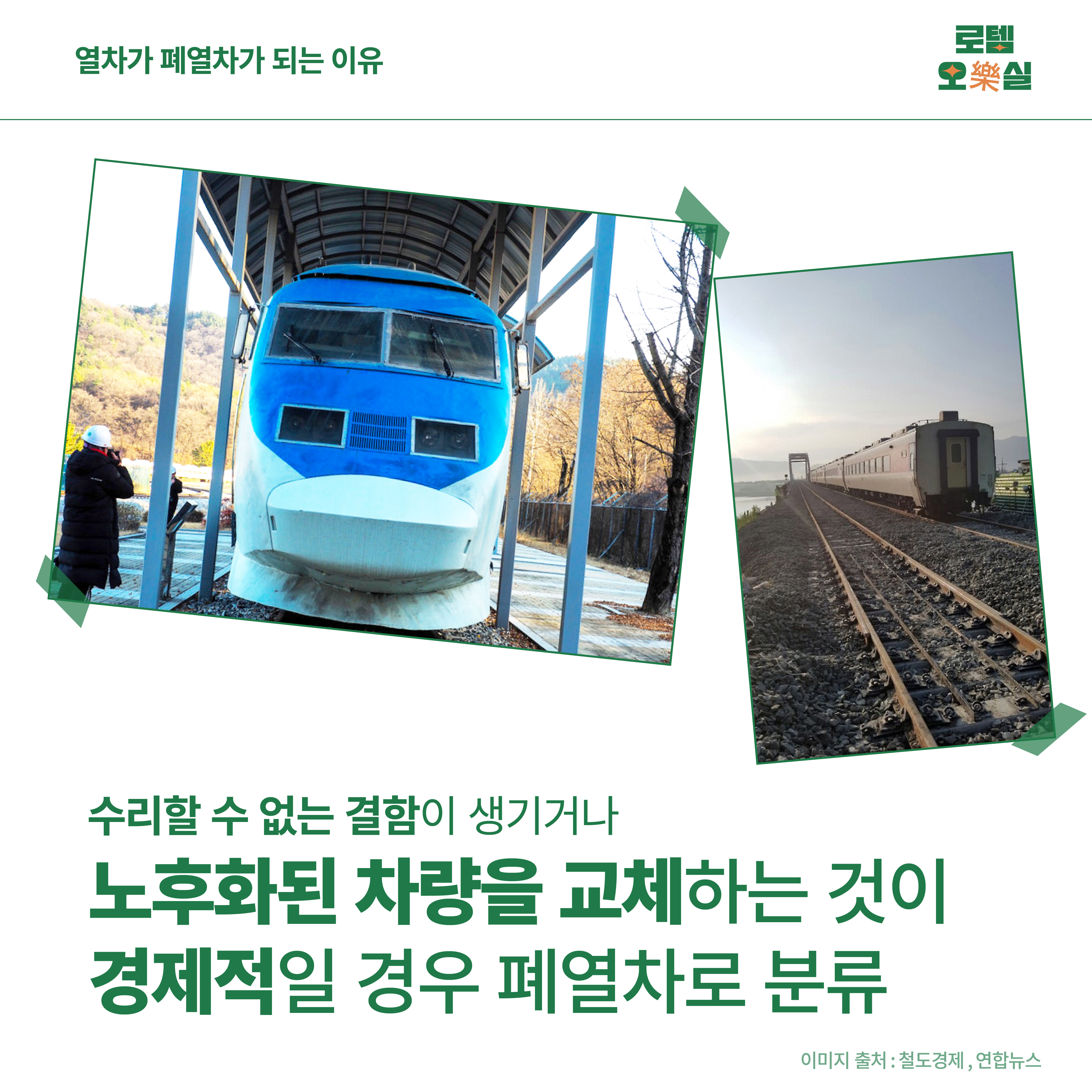 철도차량은 일반적인 차량과 마찬가지로 노후화가 진행되어 이상이 생길 경우 폐열차 처리가 될 수 있는데요. 현재는 기대수명제를 도입하여 철도차량이 20년이 경과한 시점부터는 정밀안전진단을 거쳐 안전과 성능에 문제가 있는 경우 폐열차 처리가 됩니다. 정밀안전진단은 철도차량의 변형유무, 결함유무, 전기특성 및 주행ㆍ제동성능 등 안전성능을 종합적으로 평가하는 제도에요.