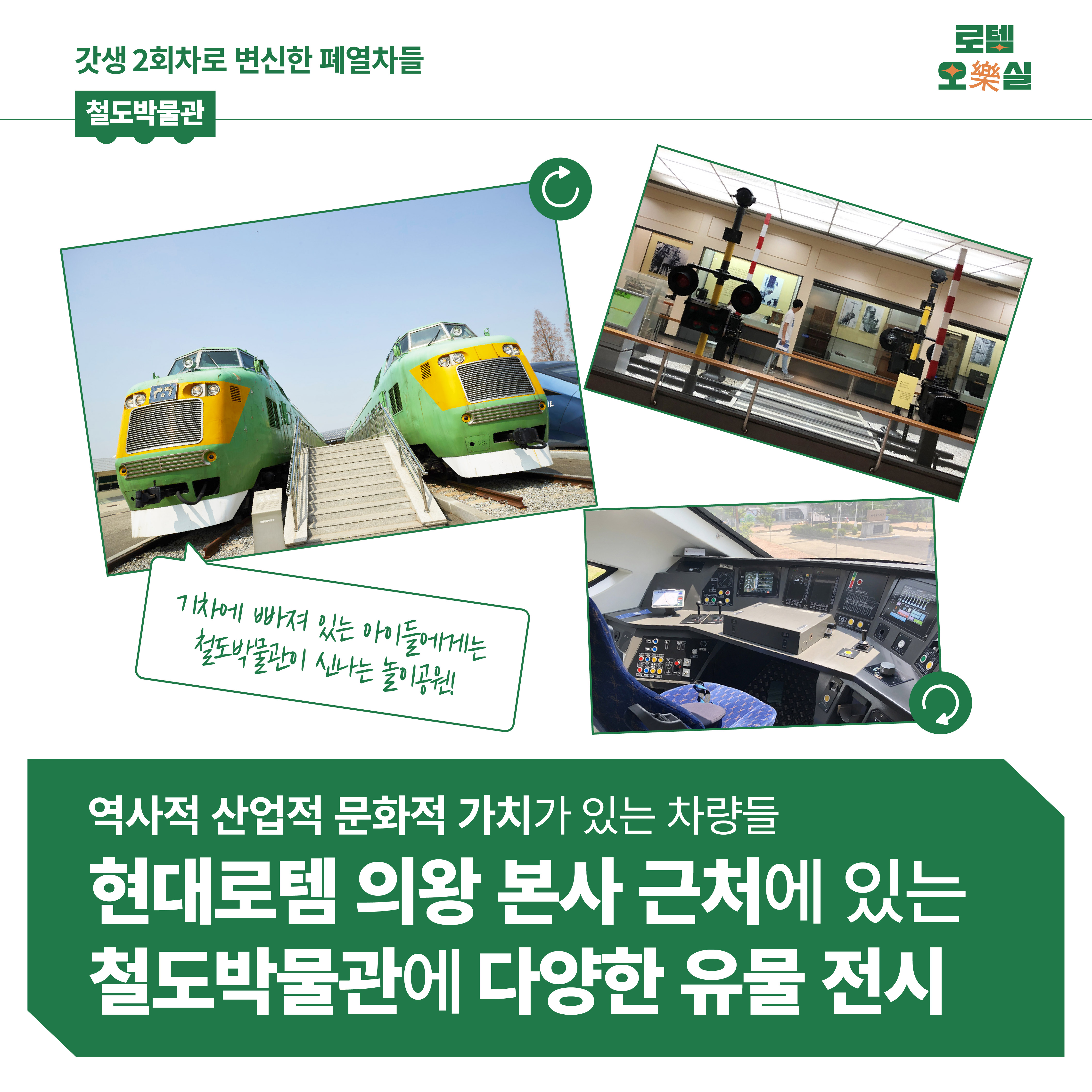 역사적 산업적 문화적으로 가치가 있는 차량들은 철도박물관에 전시되는데요. 현대로템 의왕 본사 근처에 있는 철도박물관에는 실물 차량과 등록문화재를 포함하여 약 2,700여 점의 유물이 전시돼 있어요. 기차에 빠져 있는 아이들에게는 철도박물관이 놀이공원처럼 신나게 느껴질 텐데요. 기차의 작동원리를 배우며 기차 신호등을 직접 조작해 보고, 철도의 역사와 미래를 배우는 등 다양한 체험을 할 수 있습니다.