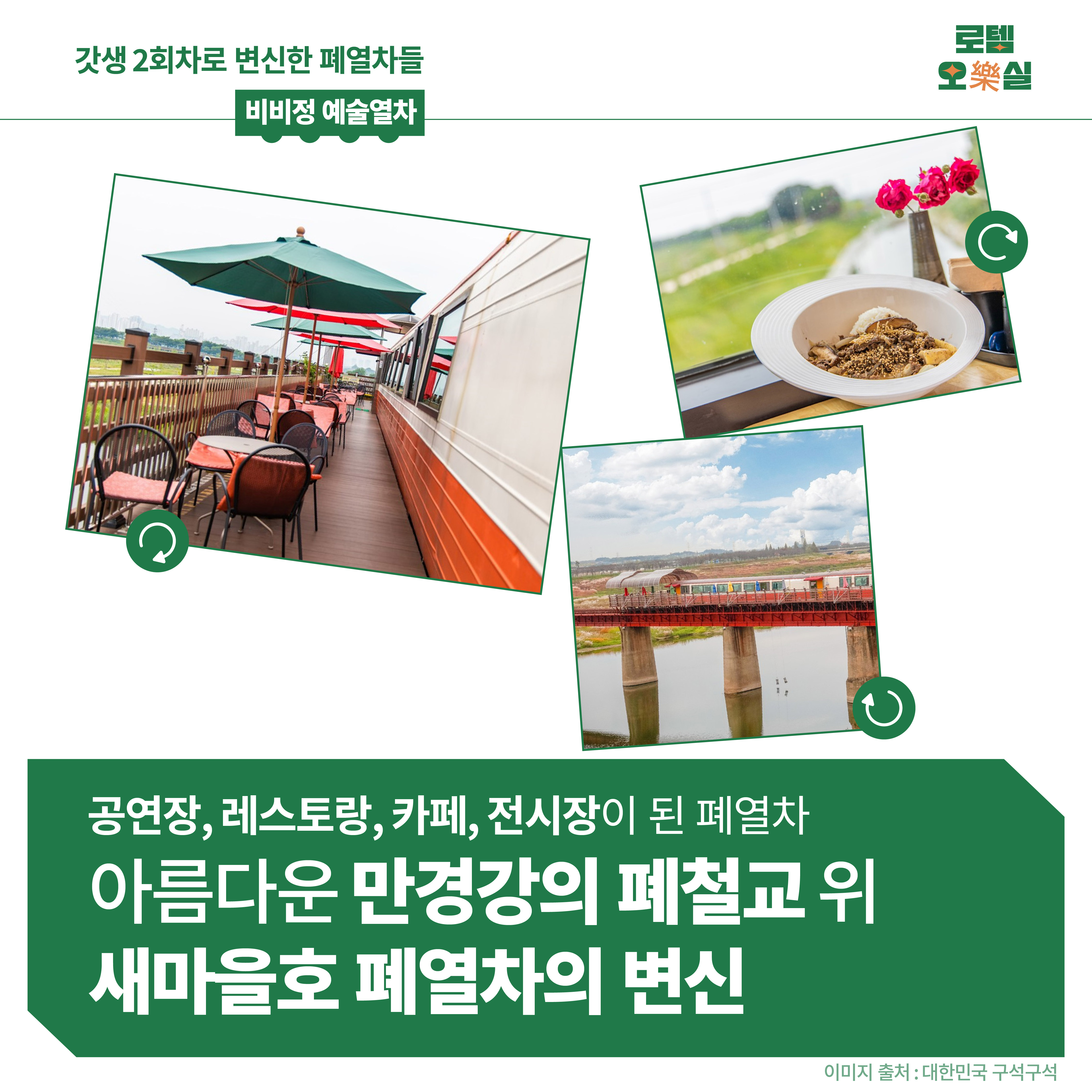 먼저 공연장, 레스토랑, 카페, 전시장이 된 폐열차 ‘비비정 예술열차’로 가보겠습니다. 전북 완주군에 있는 비비정 예술열차는 만경강을 가로지르는 폐철교 위에 어우러져 있어요. 근대문화유산 문화재로 등록될 정도로 역사적이고 풍경이 아름다운 곳인데요. 비비정 예술열차는 4량의 새마을호 폐열차로 레스토랑, 음악 공연장, 특산품 판매점, 편의점, 갤러리, 카페가 있어요. 만경강의 시원한 풍경이 함께 하는 특별한 추억을 만들 수 있습니다.