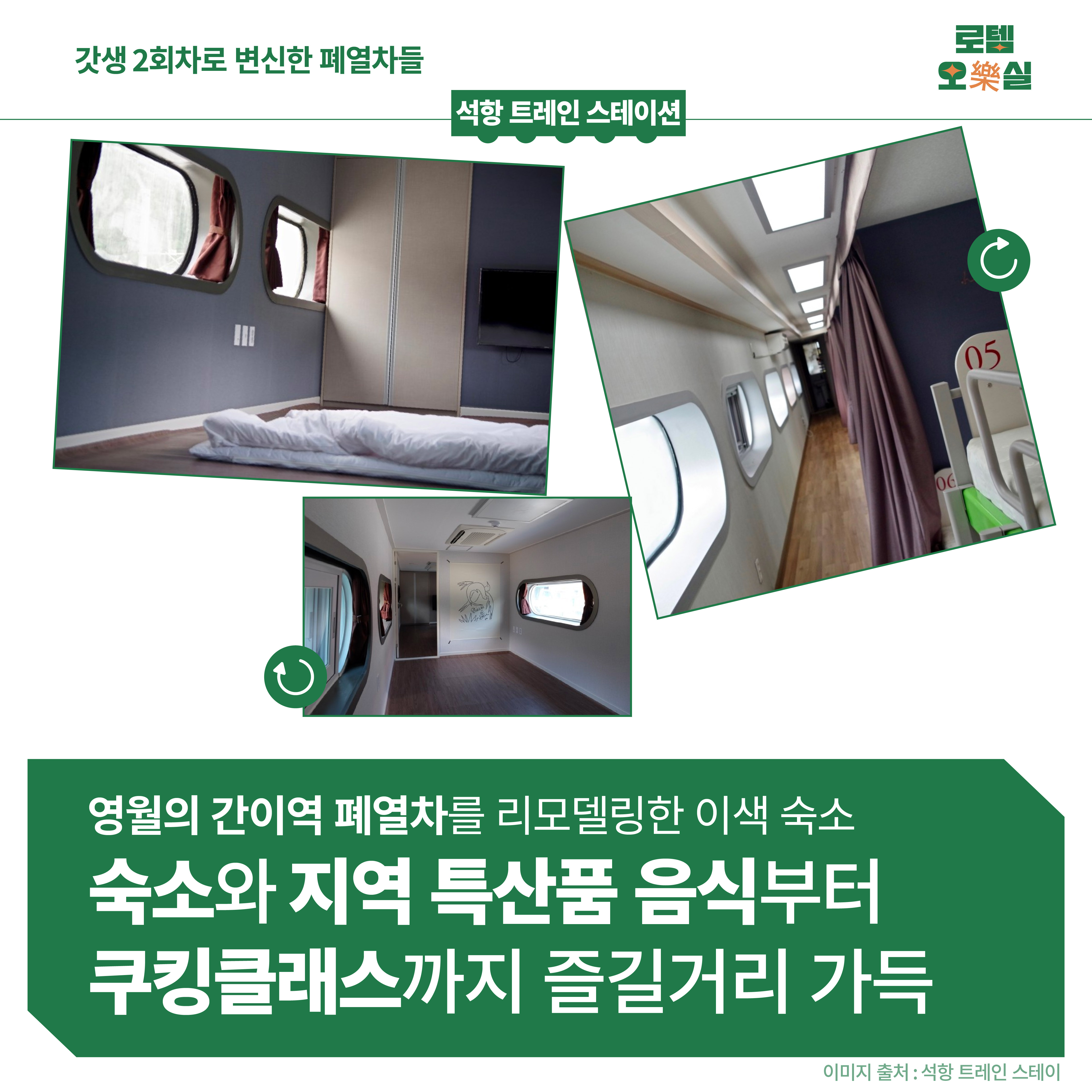 마지막으로 폐열차를 재활용하는 것인데요. 새롭게 개조된 폐열차는 카페, 미술관, 숙소 등으로 다시 태어나, 빛나는 2회차 인생을 살게 됩니다.