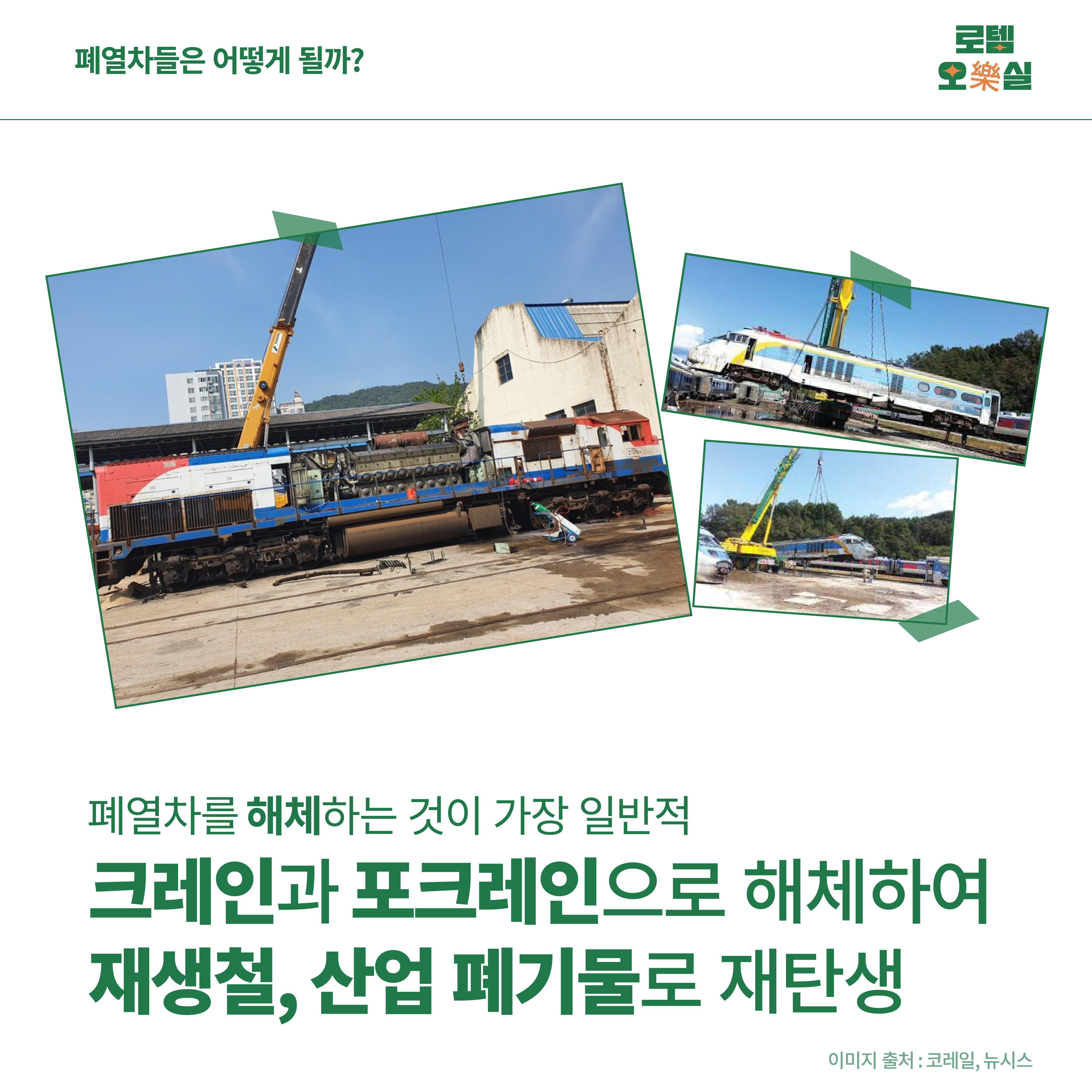 폐열차를 해체하는 것이 가장 일반적이에요. 크레인으로 대차와 차체를 분리하고 포크레인으로 차량을 세밀하게 해체하여 재질에 따라 고철 매각을 거쳐 재생철, 산업 폐기물로 처리됩니다.