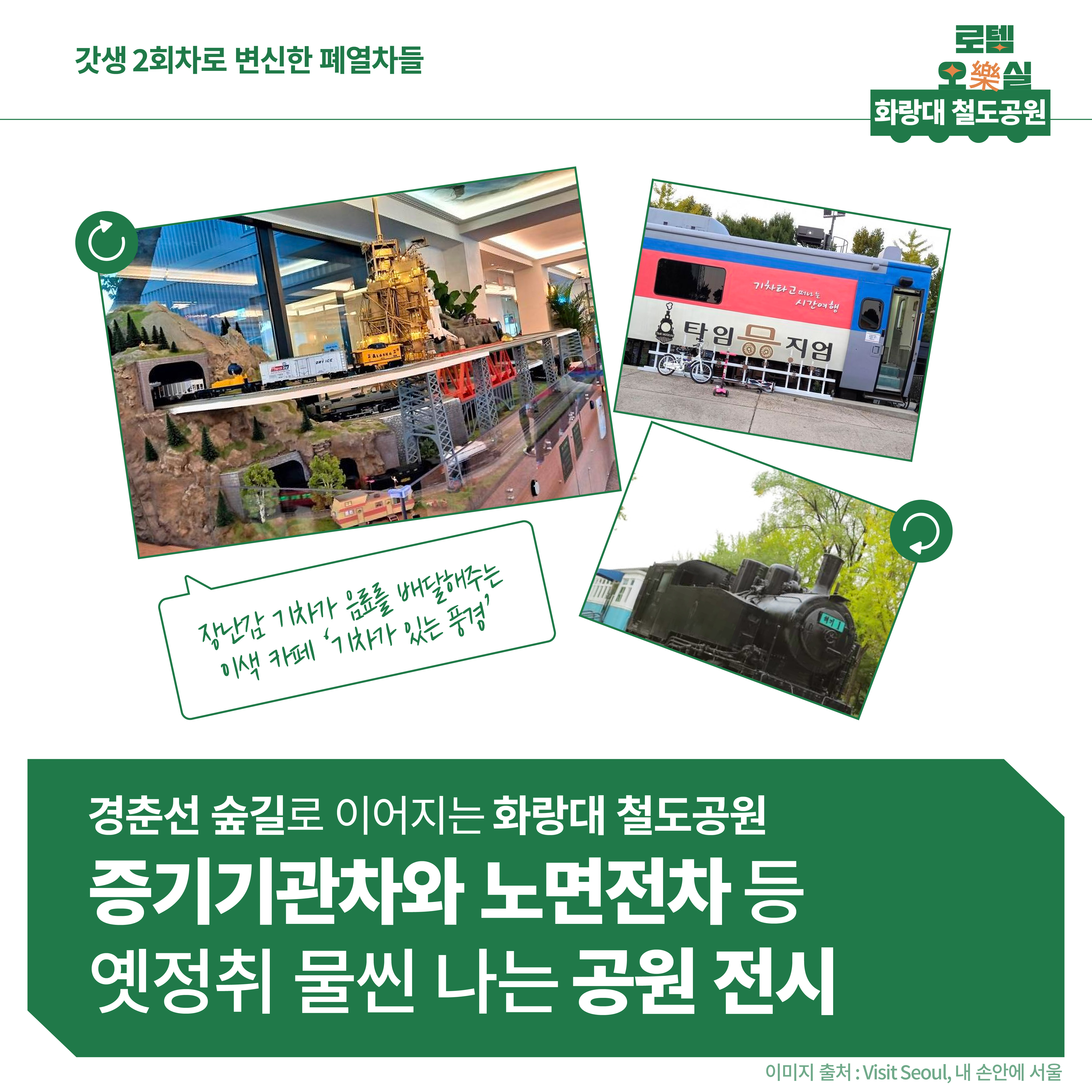 서울 안에도 폐열차를 활용한 곳이 있어요. 서울 노원구의 ‘화랑대 철도공원’입니다. 폐쇄된 경춘선 숲길로 이어지는 화랑대 철도공원은 증기기관차와 노면전차 등이 전시돼 있어 옛 정취를 물씬 느낄 수 있어요. 옆에는 무궁화호 6량을 활용해 만든 역사 전시관 ‘타임뮤지엄’도 있습니다.