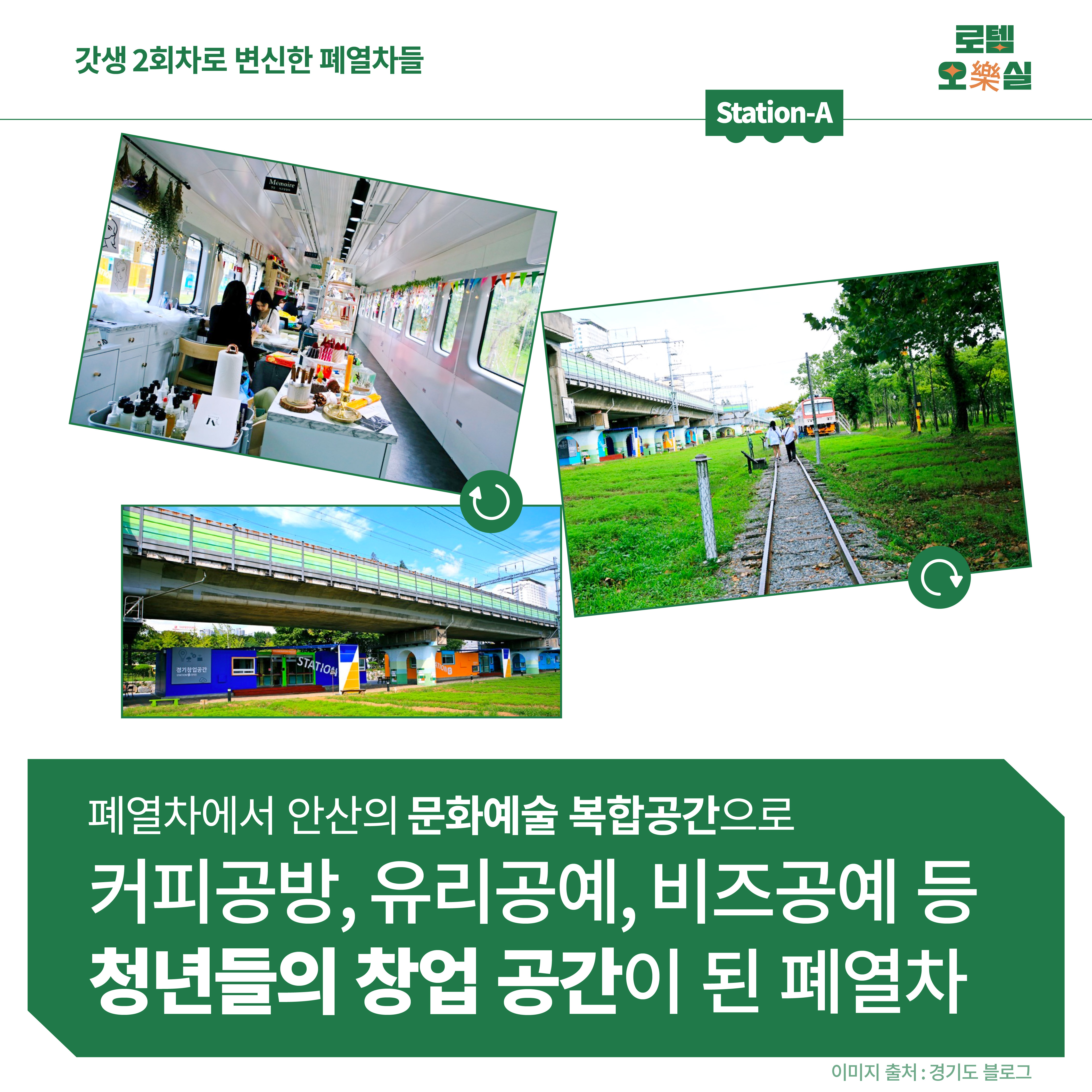 폐열차가 청년들의 일자리와 문화 예술에 활력을 불어넣는 곳도 있습니다. 경기도 안산의 ‘Station-A(스테이션에이)’인데요. 서울 4호선 고잔역 인근 협궤철길에 무궁화호 3량을 개조해 문화예술 복합공간으로 바뀌었어요. 이 공간은 커피공방, 유리공예, 비즈공예, 가죽공예 등 청년들의 창업 공간으로 아기자기하게 채워져 있어요. 봄이 되면 철로를 따라 ‘Station-A’로 가는 길이 더욱 아름다워져요. 이번 봄 나들이 1호는 여기로 가는 거예요.