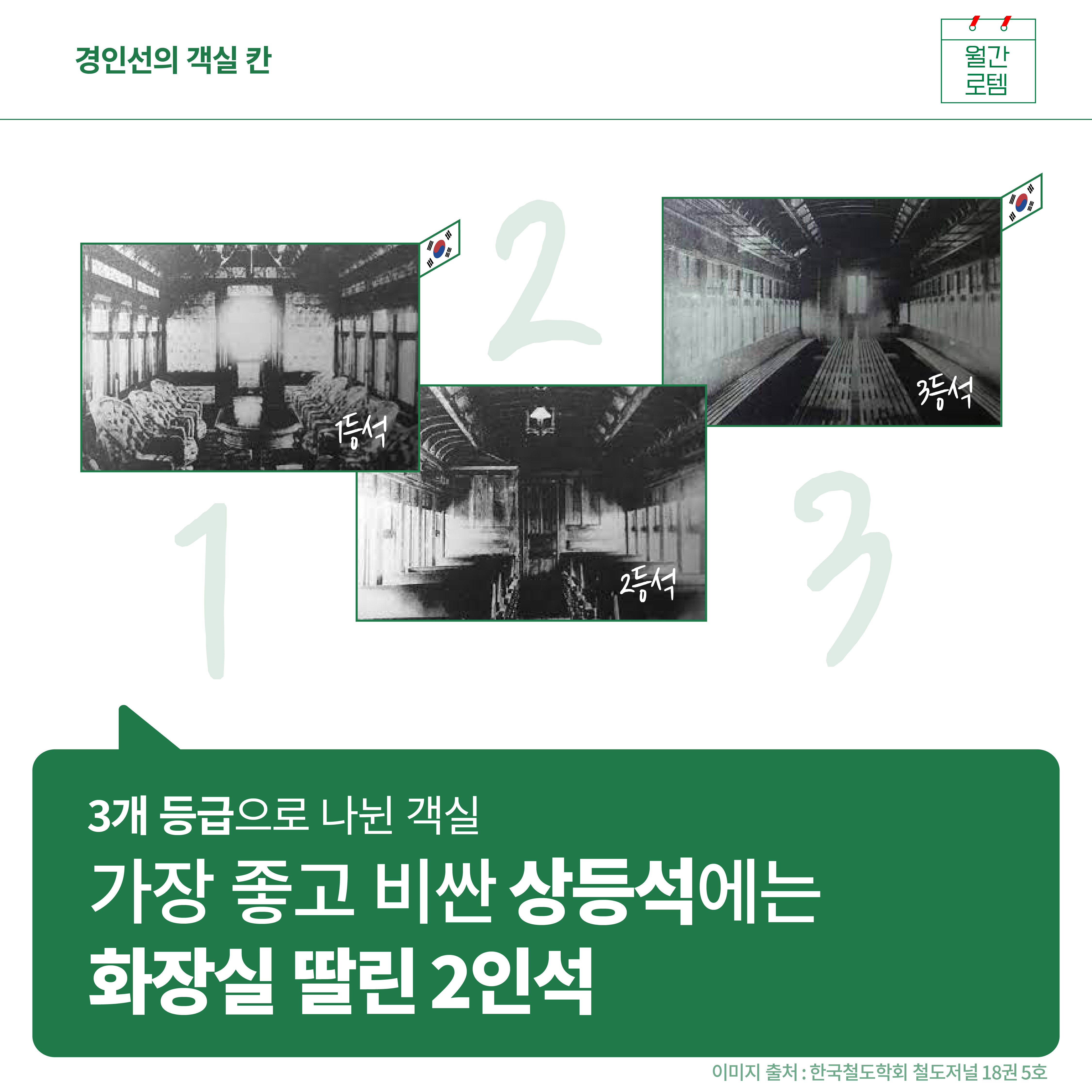 지금은 특석(우등석), 일반석으로 나뉘지만 당시에는 3개의 등급으로 객실을 나눴어요. 가장 좋은 상등석에는 화장실이 딸린 2인석이었다고 합니다. 가격도 가장 낮은 등급의 4배나 됐다고 해요.