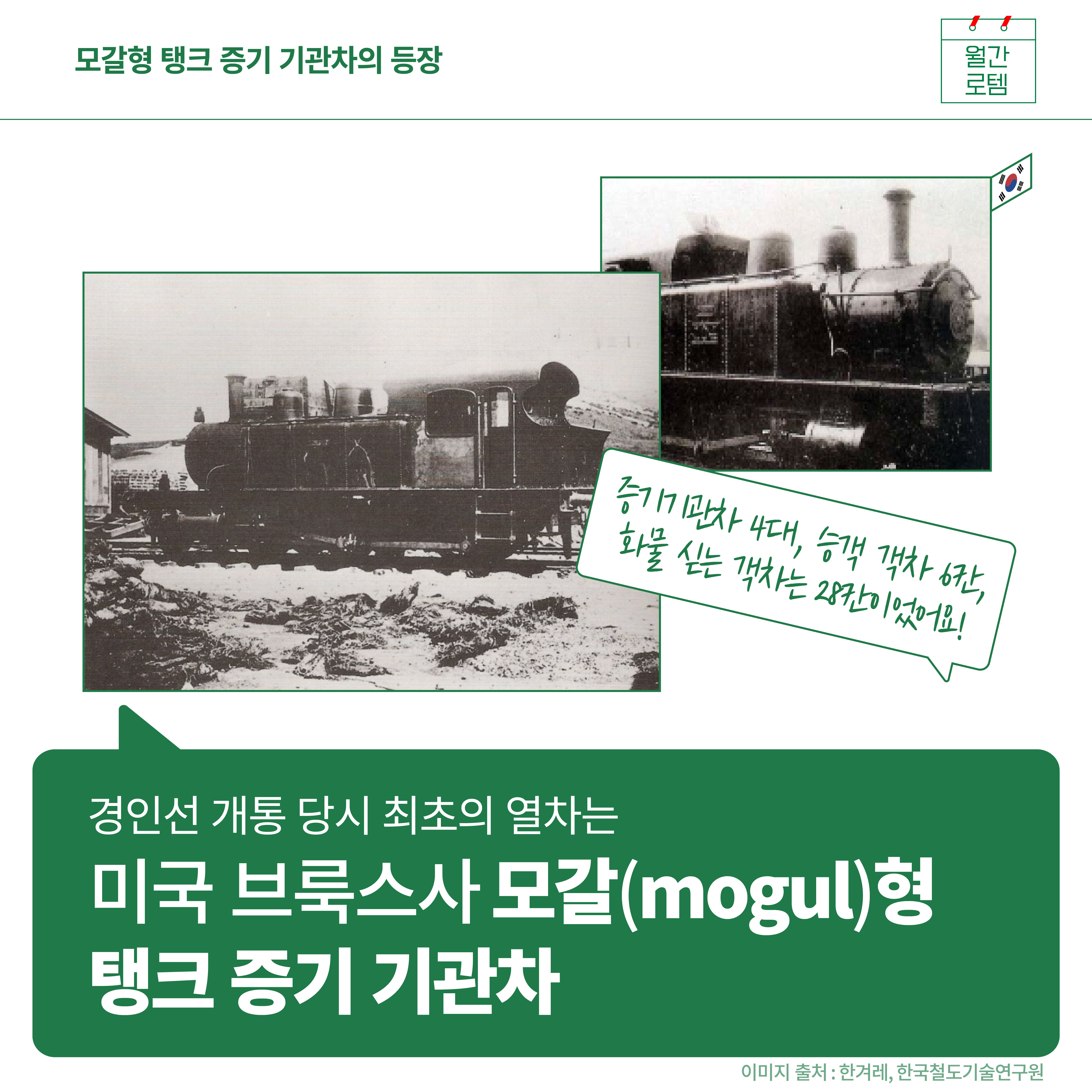 경인선 개통 당시 최초의 열차는 미국 브룩스사의 ‘모갈(mogul)’형 탱크 증기 기관차였습니다. 하루 상·하행 각 1회씩 운행했는데요. 총 7개의 역을 달렸고 4대의 증기기관차와 승객이 타는 객차는 황실전용 1칸을 포함해 6칸이 있었다고 해요. 화물을 싣는 화차는 28칸이 있었습니다.
