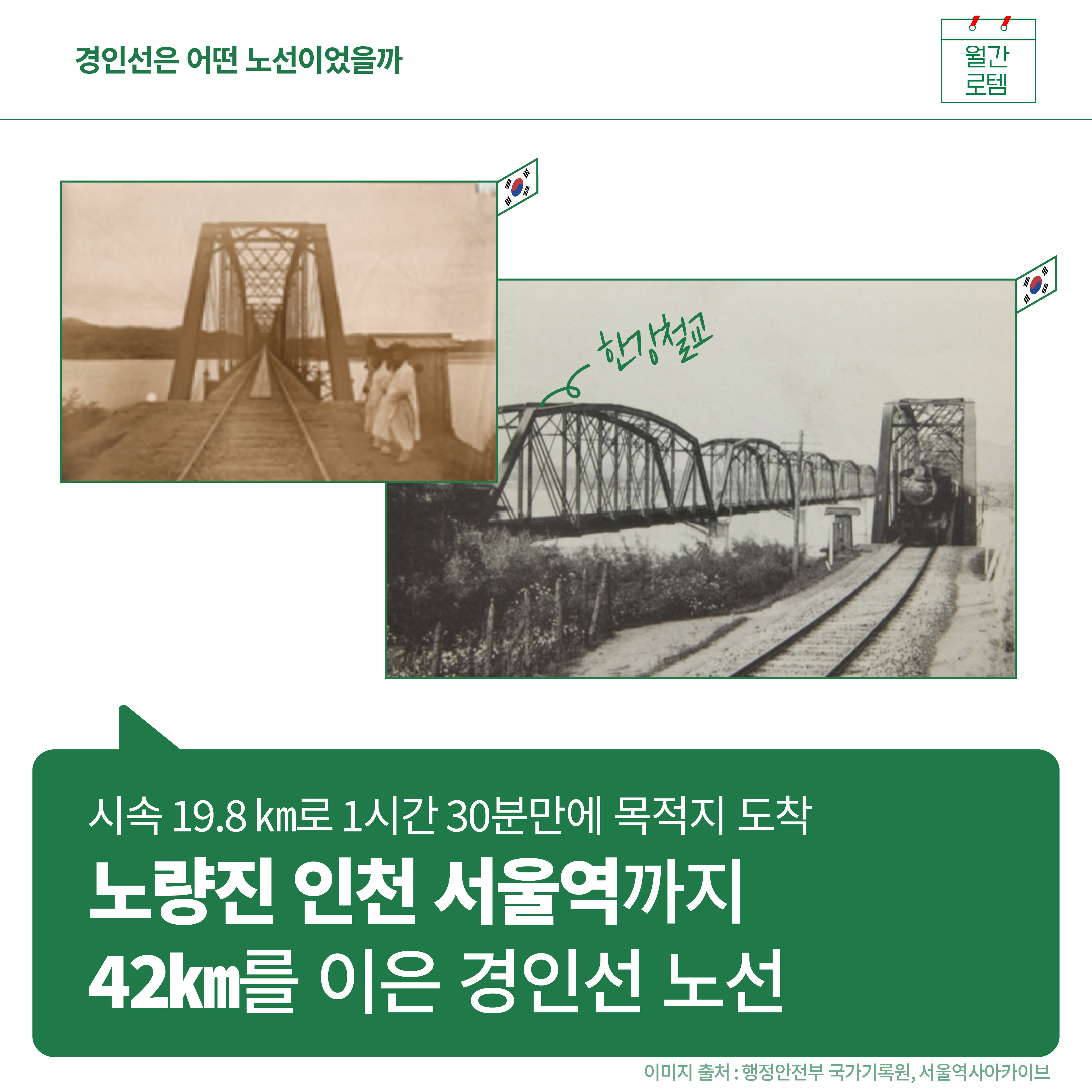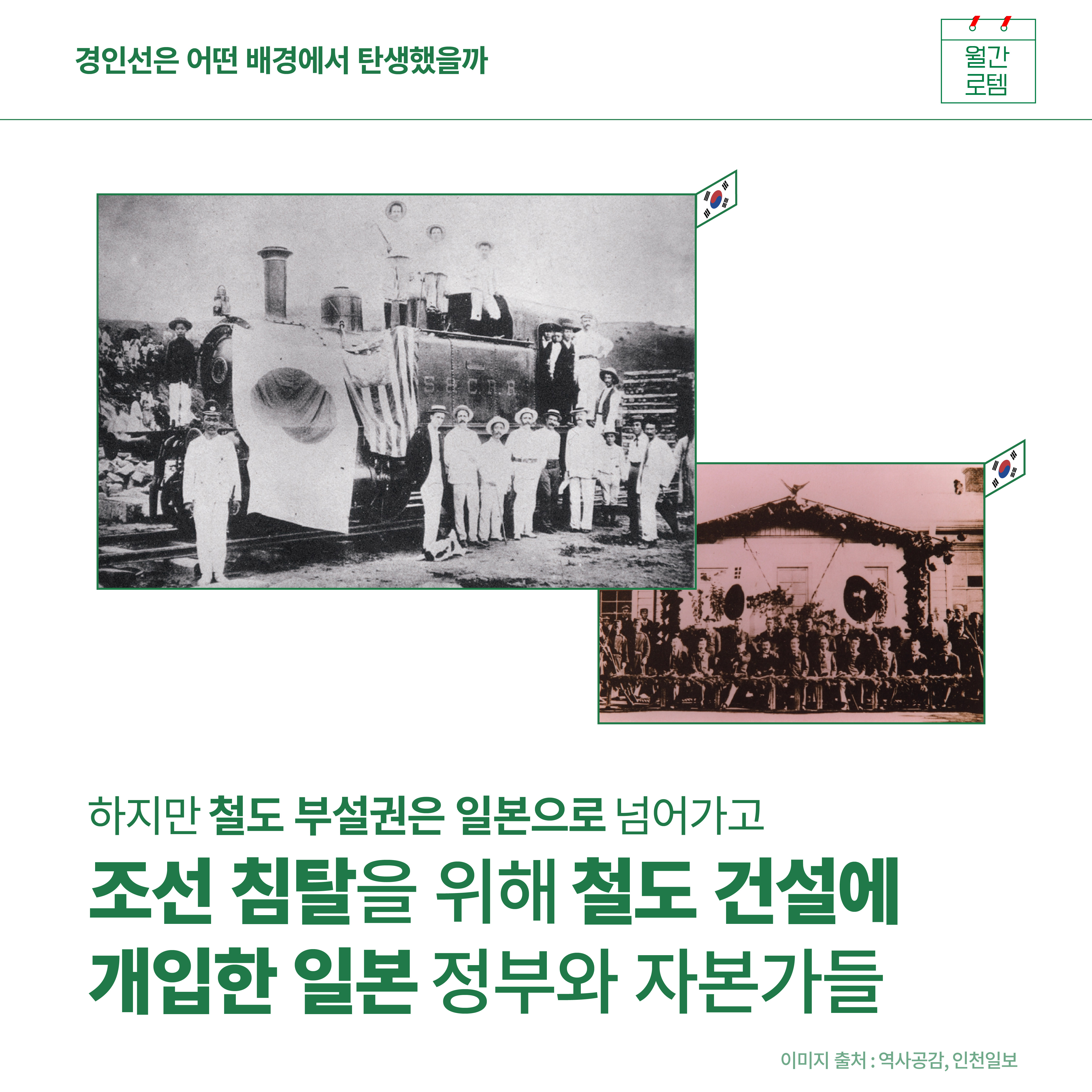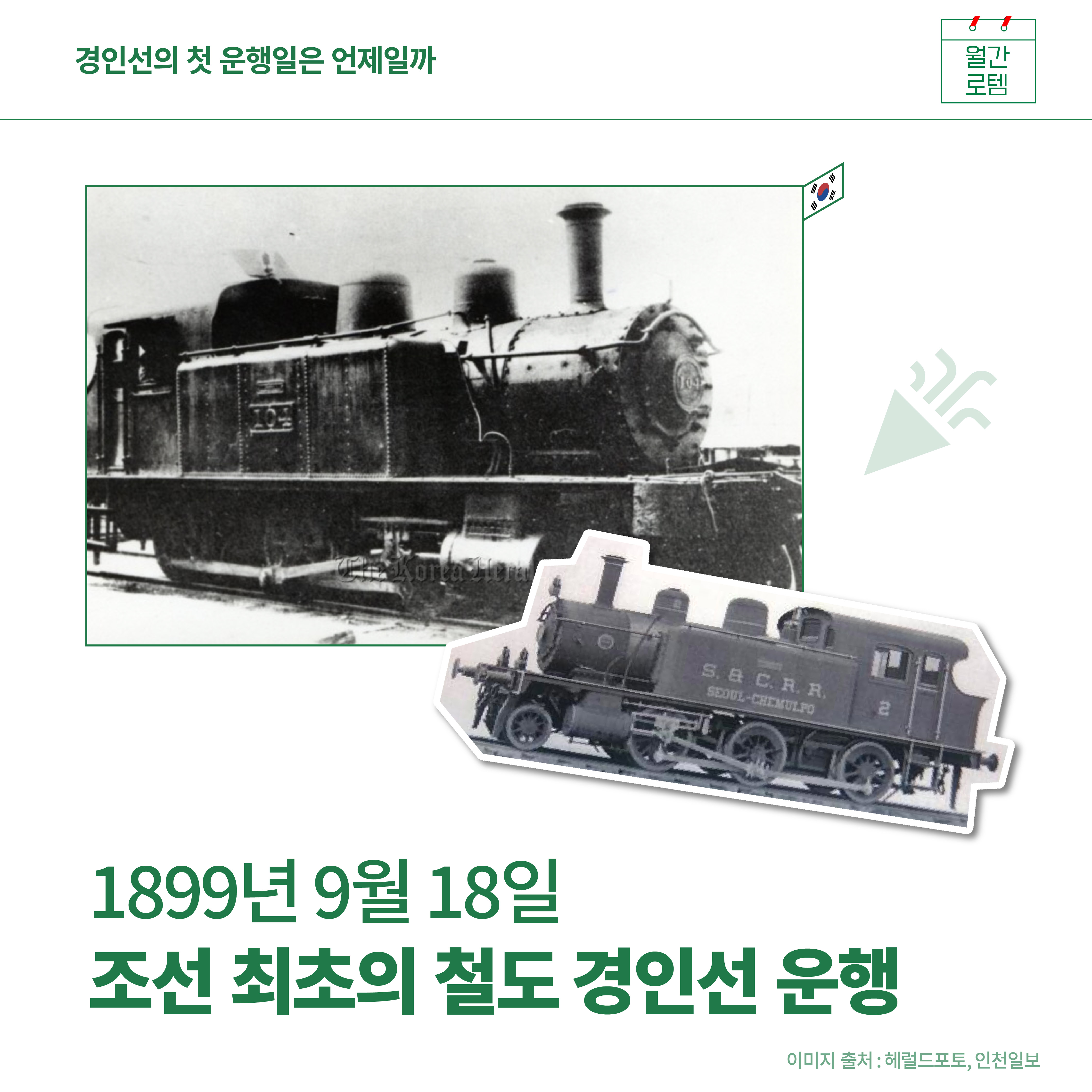 고이 넣어두었던 태극기 다들 꺼내셨나요. 내일은 우리나라의 5대 국경일 중 하나인 삼일절입니다. 대한독립만세를 외치며 독립선언서를 낭독한 날이지요. 여러분들과 오늘은 역사이야기를 간단히 나눠볼까해요. 1900년대 초반을 배경으로 하는 드라마, 영화를 보면 하얀 증기를 내뿜는 증기열차가 간혹 등장하곤 하는데요. 그 주인공, 조선 최초의 철도인 경인선 이야기를 준비했습니다.
