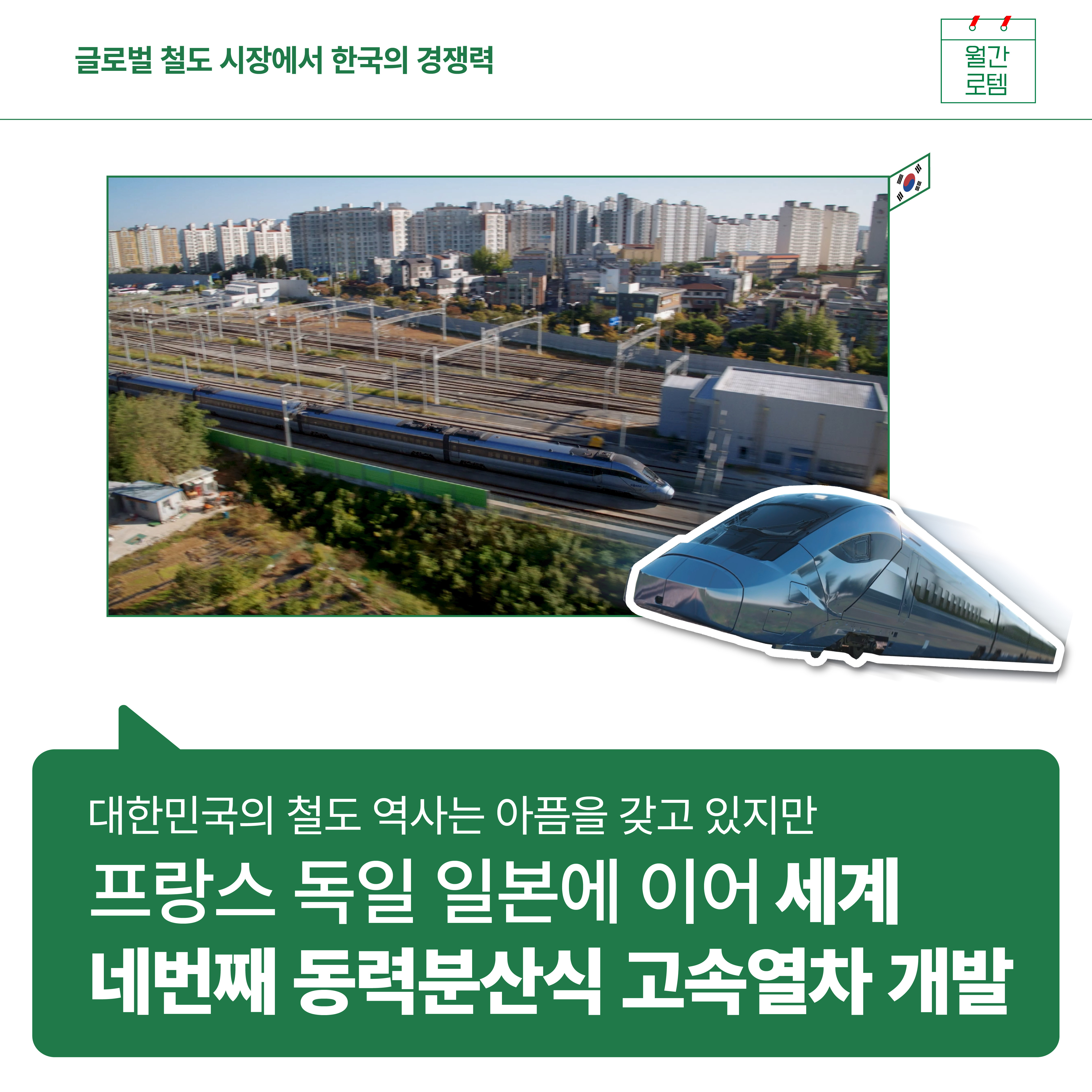 대한민국의 철도 역사는 아픔을 갖고 있지만 오늘날 프랑스, 독일, 일본에 이어 세계 네번째 동력분산식 고속열차를 개발하며 글로벌 철도 시장에서 경쟁력을 갖게 되었는데요.