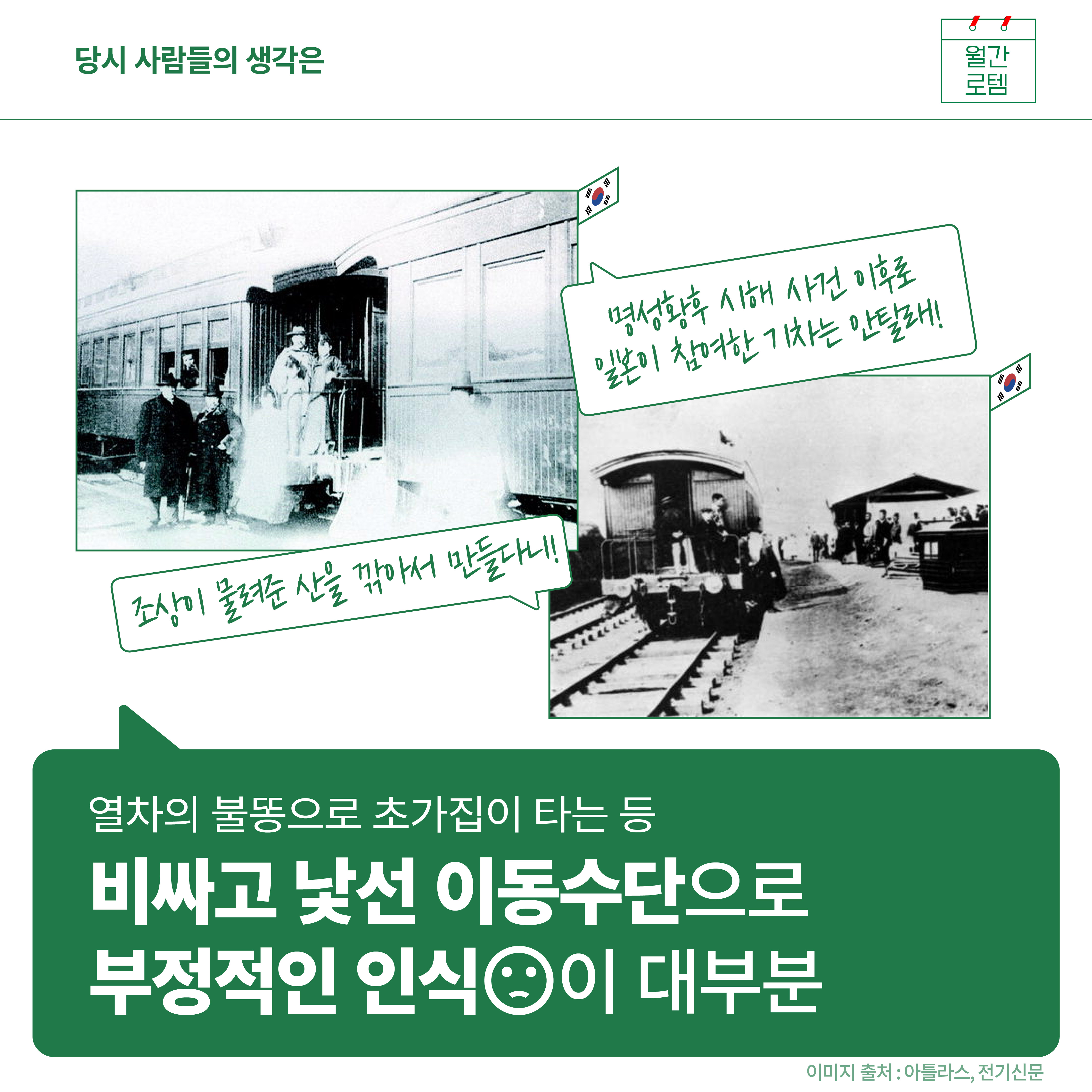 새로 등장한 낯선 이동수단인 열차는 당시 짜장면의 10배에 이르는 비싼 요금으로 부정적인 인식이 강했습니다. 특히 명성황후 시해사건 이후 대중들은 조상들이 물려준 땅과 산을 깎아 만든 선로와 열차에 더 부정적인 인식을 가졌습니다. 실제로 열차에서 불똥이 튀며 주변 초가집을 태우는 일도 많았고요.