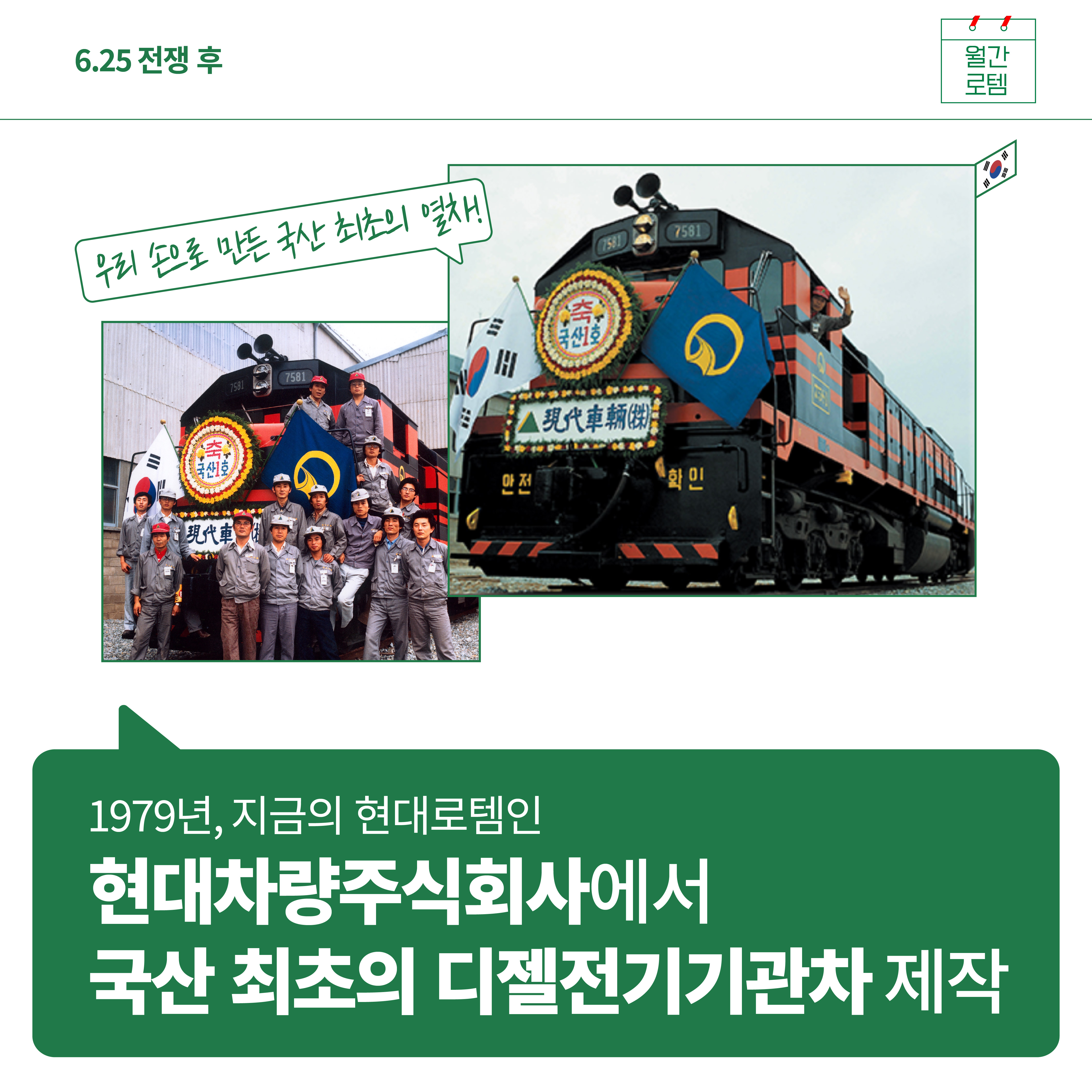 이후 6.25 전쟁 무렵 UN군에 의해 증기 열차 대신 디젤 전기 기관차가 들어오게 되었고 전쟁 후 외산 기관차를 수입에 의존하던 우리나라는 1979년 당시 현대차량주식회사(현 현대로템)에서 국산 최초의 디젤전기기관차를 제작합니다. 대한민국 철도 개통 80여 년 만에 우리 손으로 만든 최초의 열차로 그 의미가 매우 컸습니다.