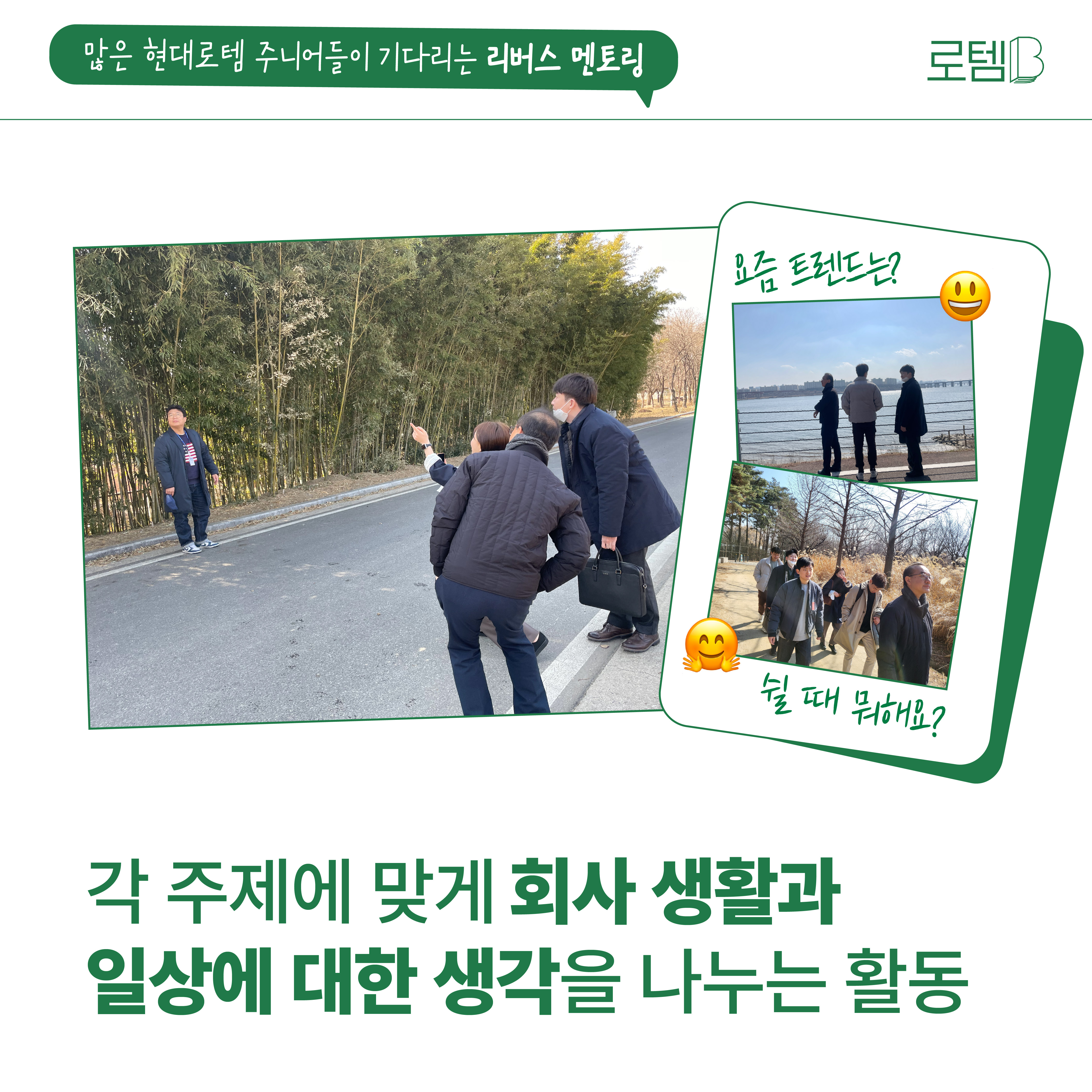 어느덧 봄이 성큼 다가왔습니다. 마음도, 옷차림도 한결 가벼워지고 기분도 괜히 좋아지는 요즘입니다. 따듯한 봄이 찾아온 만큼 현대로템 경영지원사업부에서는 조금은 독특한 소통 활동을 진행하였는데요. 바로 ‘리버스 멘토링(Reverse Mentoring)’ 프로그램을 소개합니다!