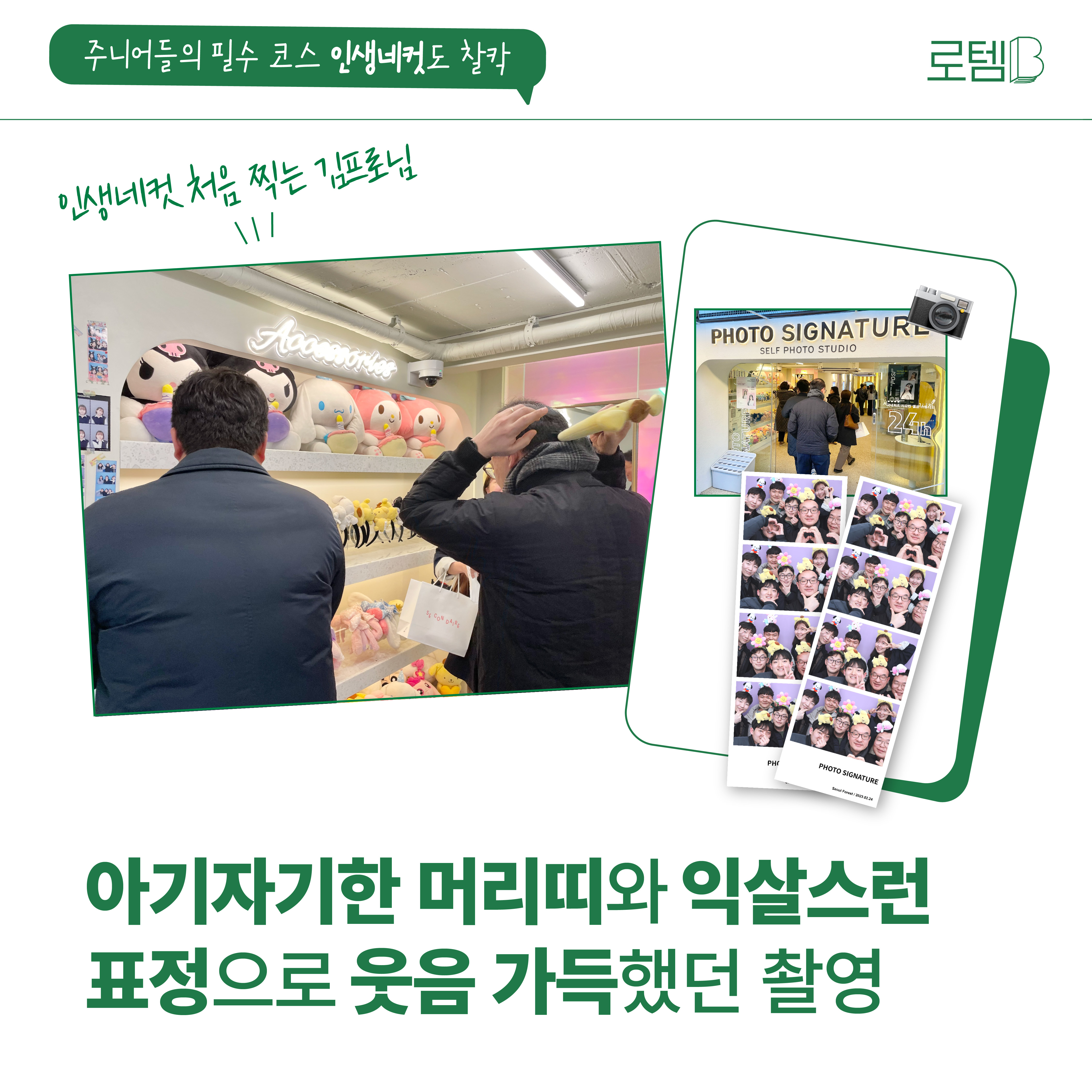 이렇게 여럿이 모이면 사진을 빼놓을 수 없죠? 인생네컷도 함께 했는데요. 이날 처음 찍어보신다는 김프로님이 가장 즐거워하셨어요. 아기자기한 머리띠를 하고 평소에 보기 힘든 익살스러운 표정들 덕에 배가 아플 정도로 웃었던 시간이에요.