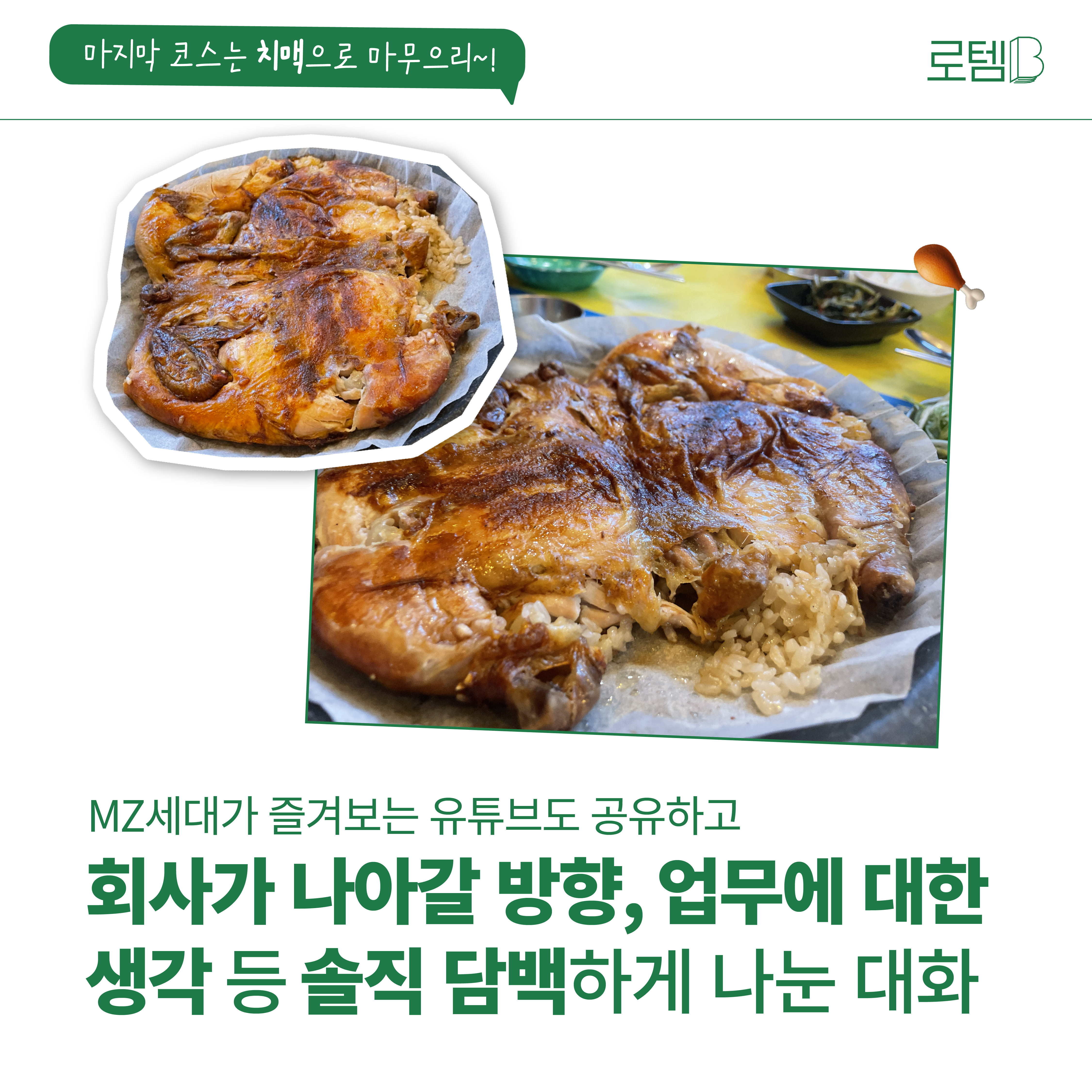 인화된 사진을 각자 들고 마지막 코스인 누룽지 통닭구이로 향했습니다. 어느덧 치맥과 함께 MZ세대들이 즐겨보는 유튜브 채널을 공유하기도 하고 회사가 나아가는 방향, 업무에 대한 생각 등 솔직 담백하게 이야기를 나눌 수 있었습니다.