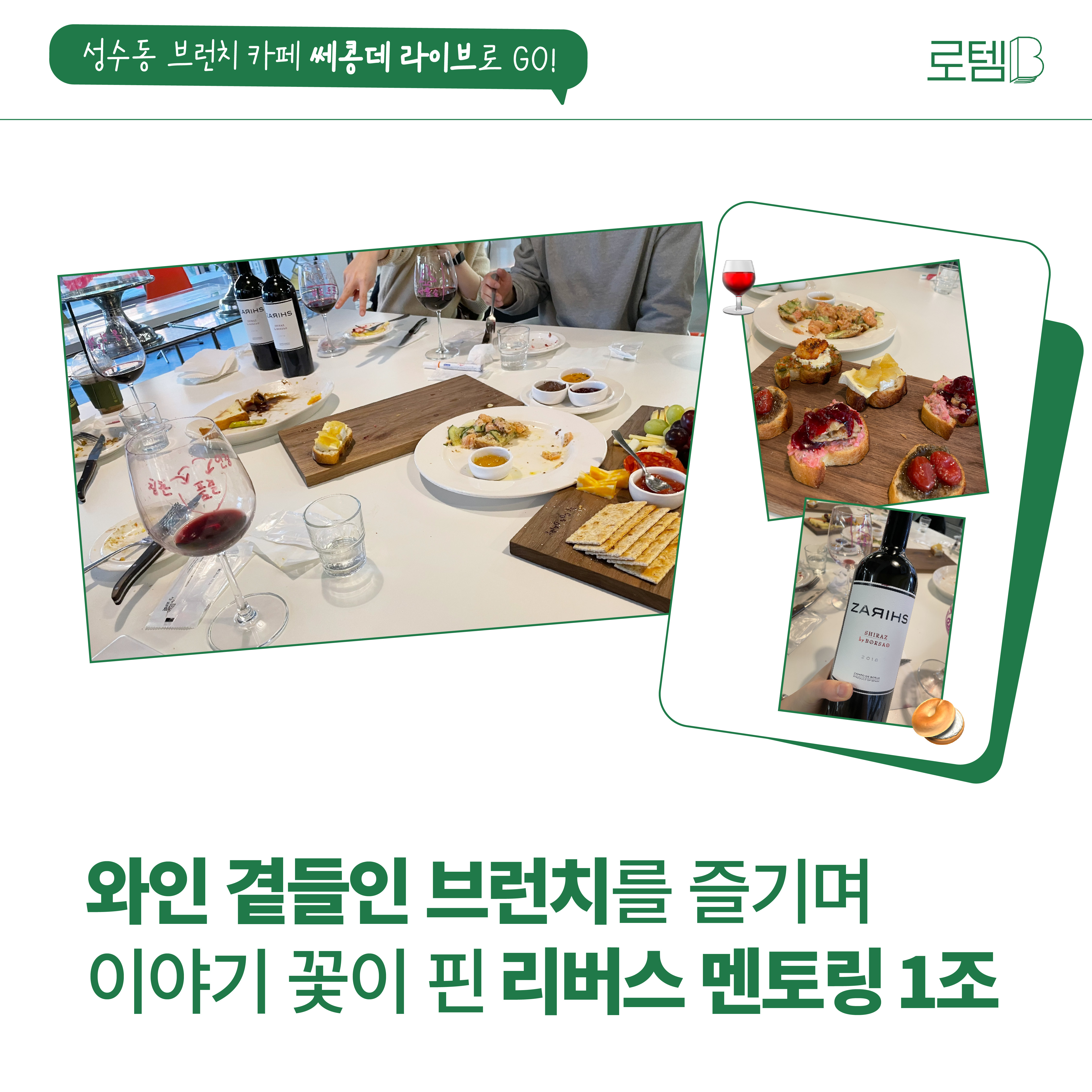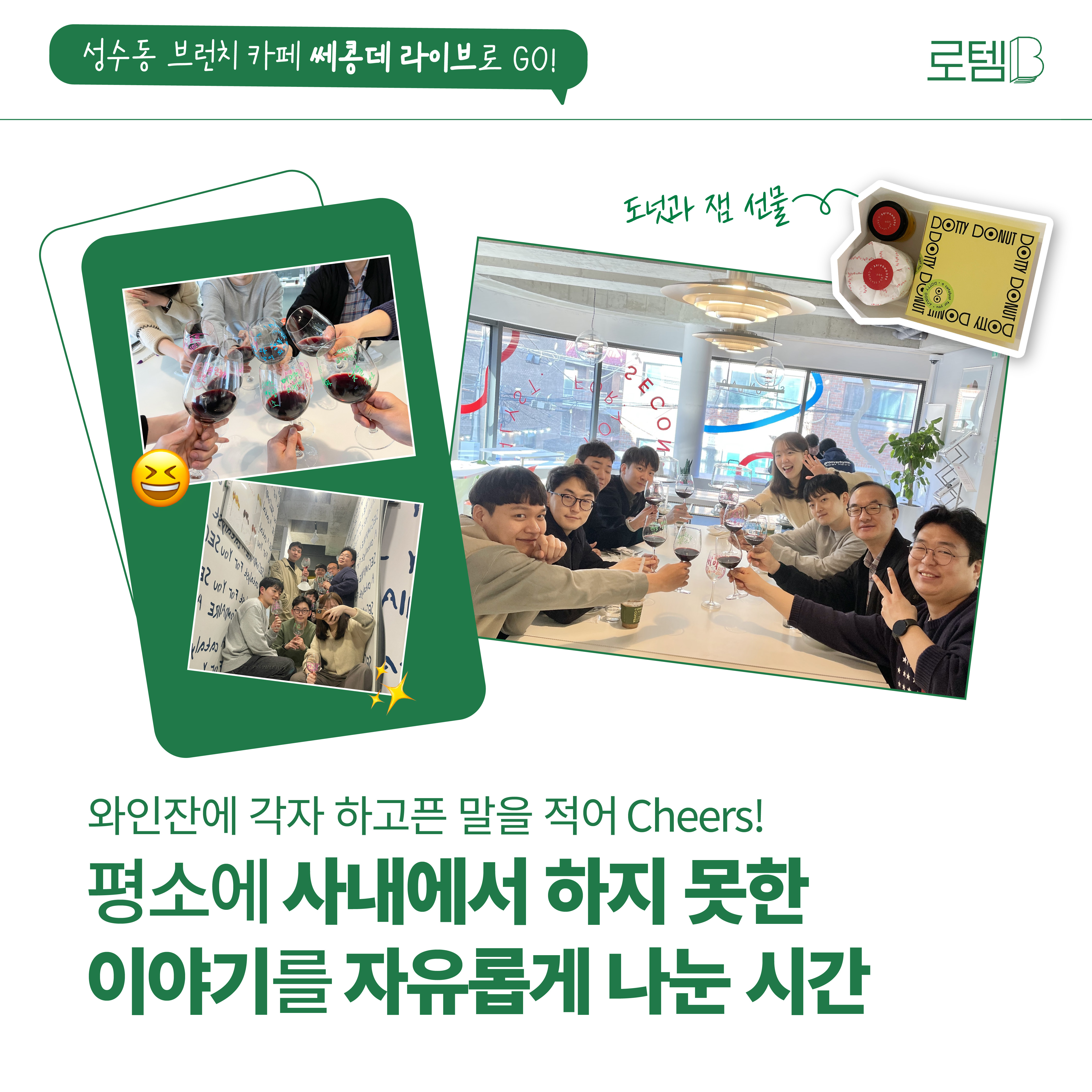 성수동에서 유명한 브런치 카페 쎄콩데 라이브에 방문했어요. 와인을 곁들인 브런치를 즐기며 이야기 꽃이 피기 시작했어요. 평소에 사내에서 하지 못한 이야기를 자유롭게 나눈 시간이었습니다.