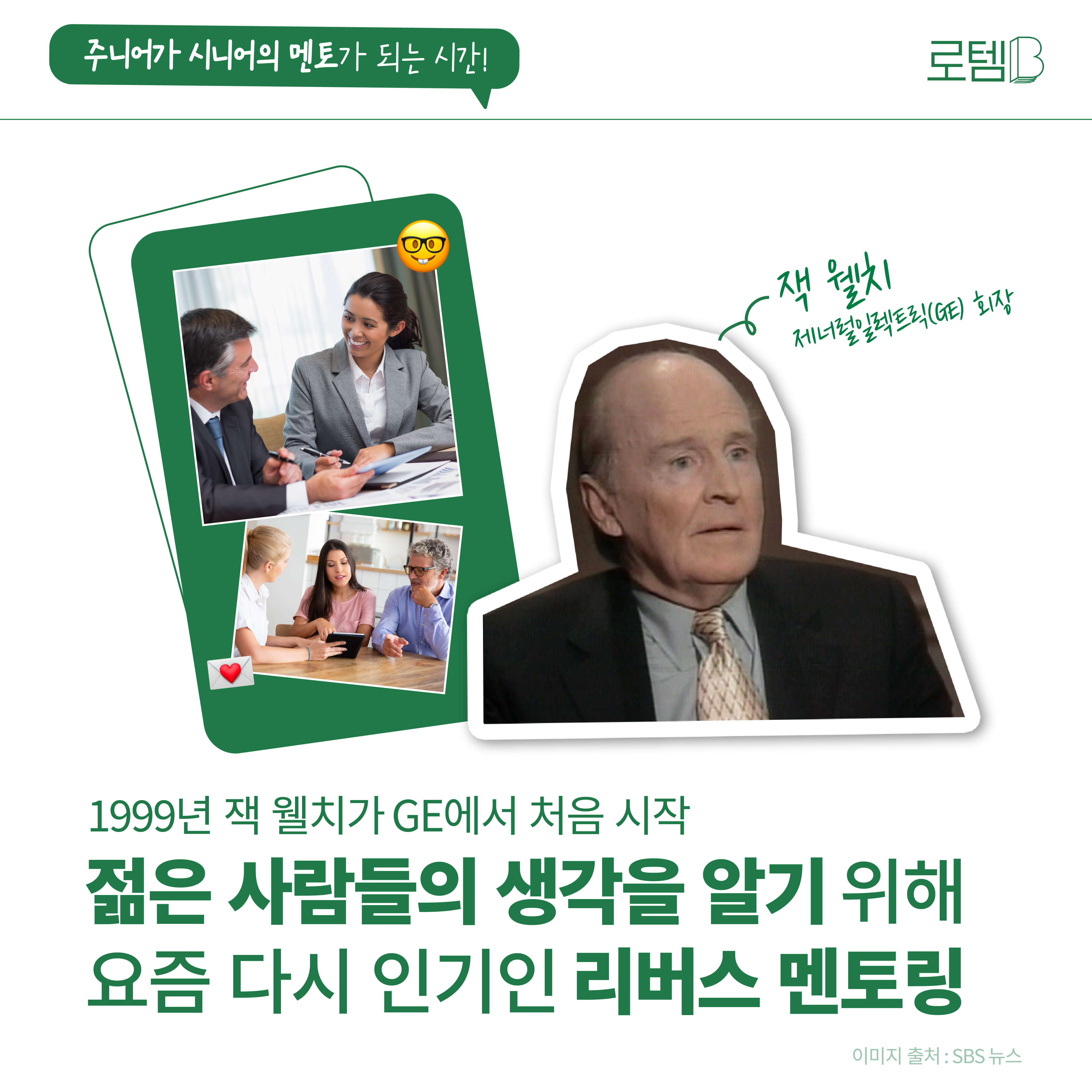 리버스 멘토링이 뭔지 다소 생소할 수 있는데요. 멘토링의 반대 개념으로 주니어가 시니어의 멘토가 되는 것이에요. 리버스 멘토링은 1999년 제너럴일렉트릭(GE) 회장이던 잭 웰치가 최고경영자 시절 젊은 소비자들의 트렌드를 익히기 위해 시작했는데요. 이후 기업들 사이에서 꾸준히 도입되다가 최근 다시 활성화되고 있어요.