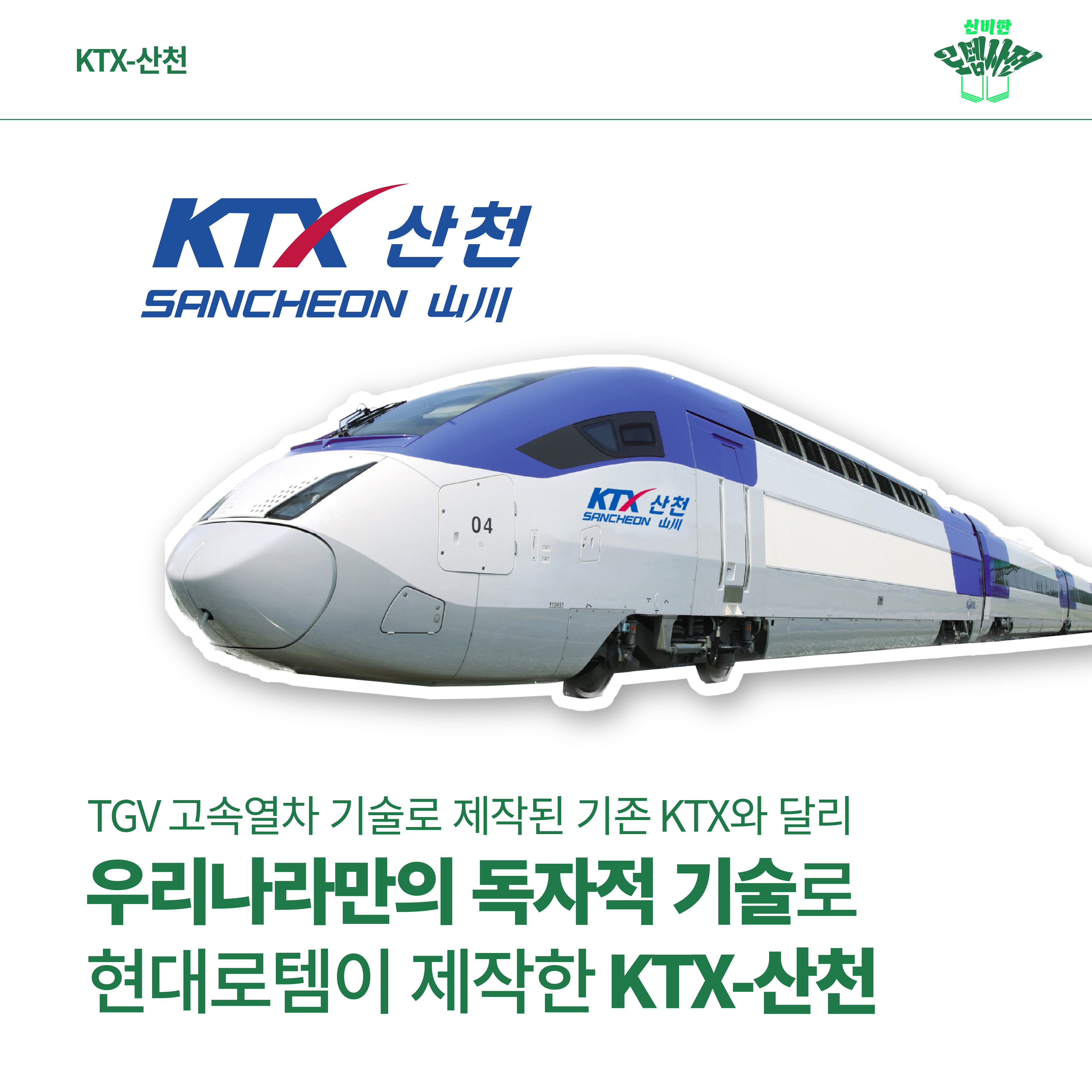 기존 KTX가 프랑스 TGV 고속열차의 기술로 제작됐다면 KTX-산천은 우리나라만의 독자적 기술로 현대로템이 제작한 모델이에요. 처음 이름은 KTX-II였다가 한국철도공사의 공모 결과에 따라 ‘KTX-산천’으로 바뀌었습니다.