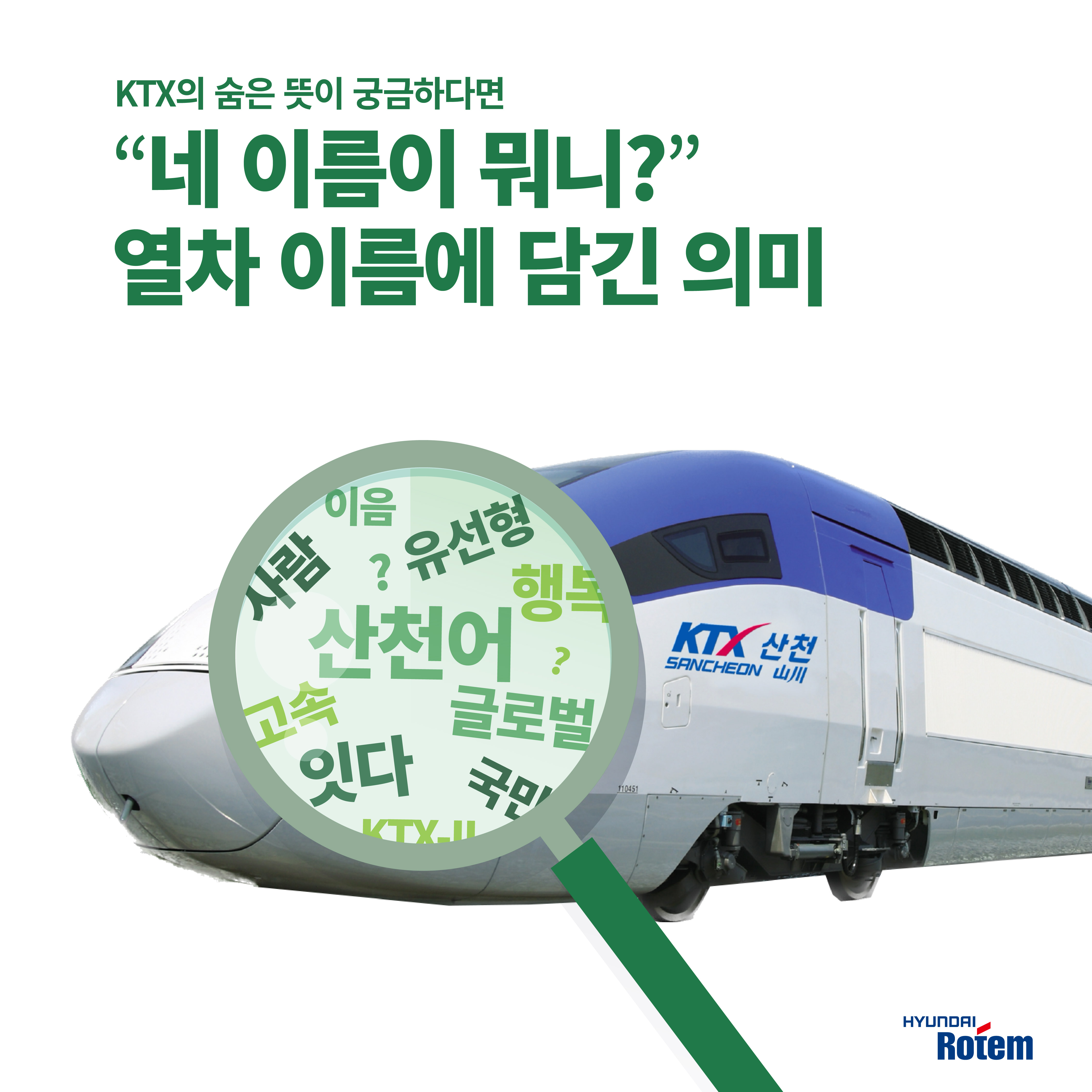 세상에서 가장 힘든 일을 하나 고르라면 이름을 짓는 것이에요. 아이를 낳았을 때 이름을 짓는 것이나 반려견·반려묘를 입양했을 때 이름을 짓는 것, 또는 회사 이름을 결정하는 것 모두 굉장히 고민이 많이 되죠. 공통점은 있어요. 좋은 의미를 담아 부를 수 있는 이름을 짓는 것이지요. 열차도 역할이나 특징에 맞는 이름을 지어준답니다. 언젠가 타 본 열차의 이름, 무슨 뜻일까 궁금하셨죠. 신비한 로템사전에서 풀어드리겠습니다.