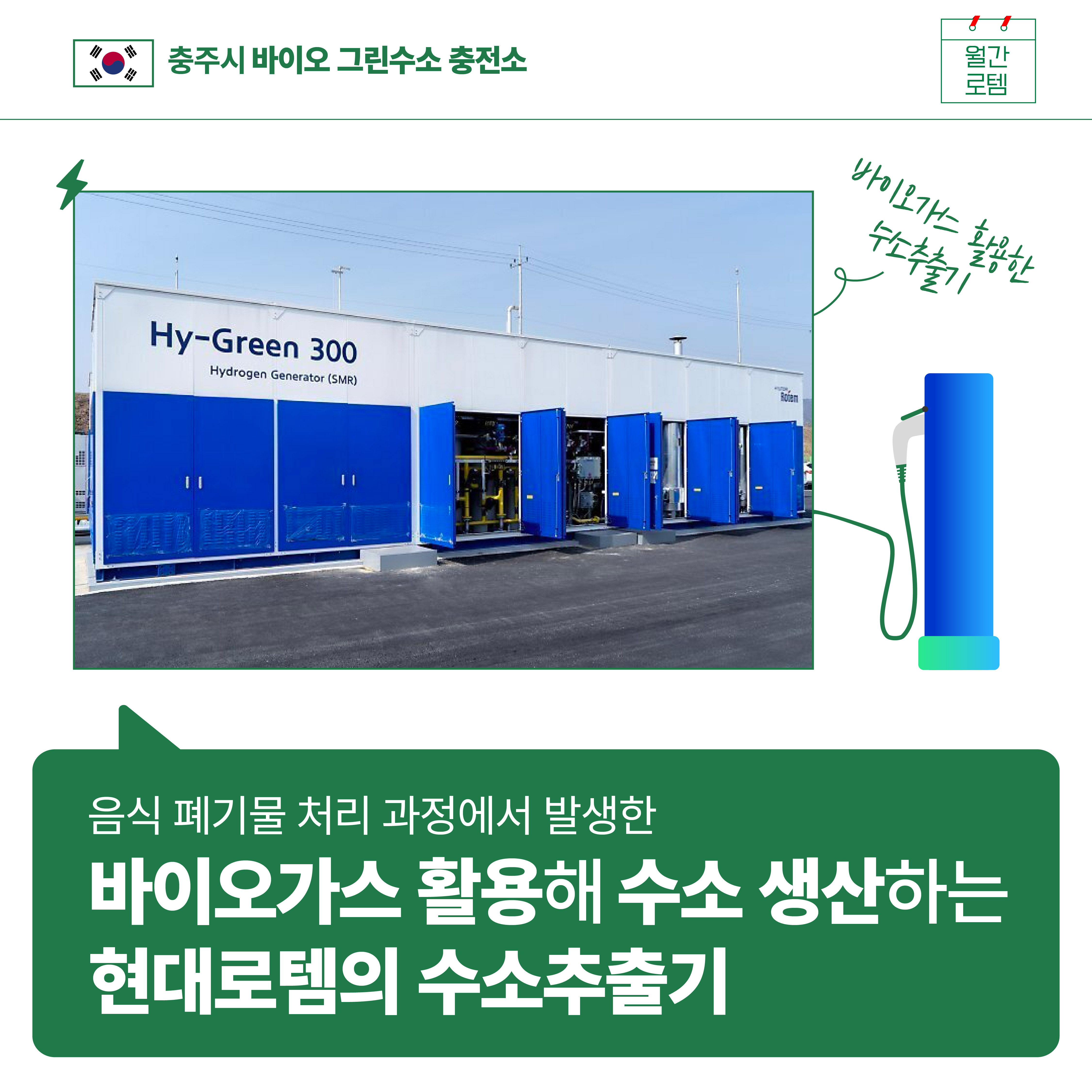 충주시의 바이오 그린수소 충전소는 국내 최초의 음식 폐기물 처리과정에서 발생하는 메탄가스 등의 바이오가스를 활용해 수소를 생산하고 저장, 운반, 충전, 판매까지 가능한 온사이트형 수소충전소입니다.