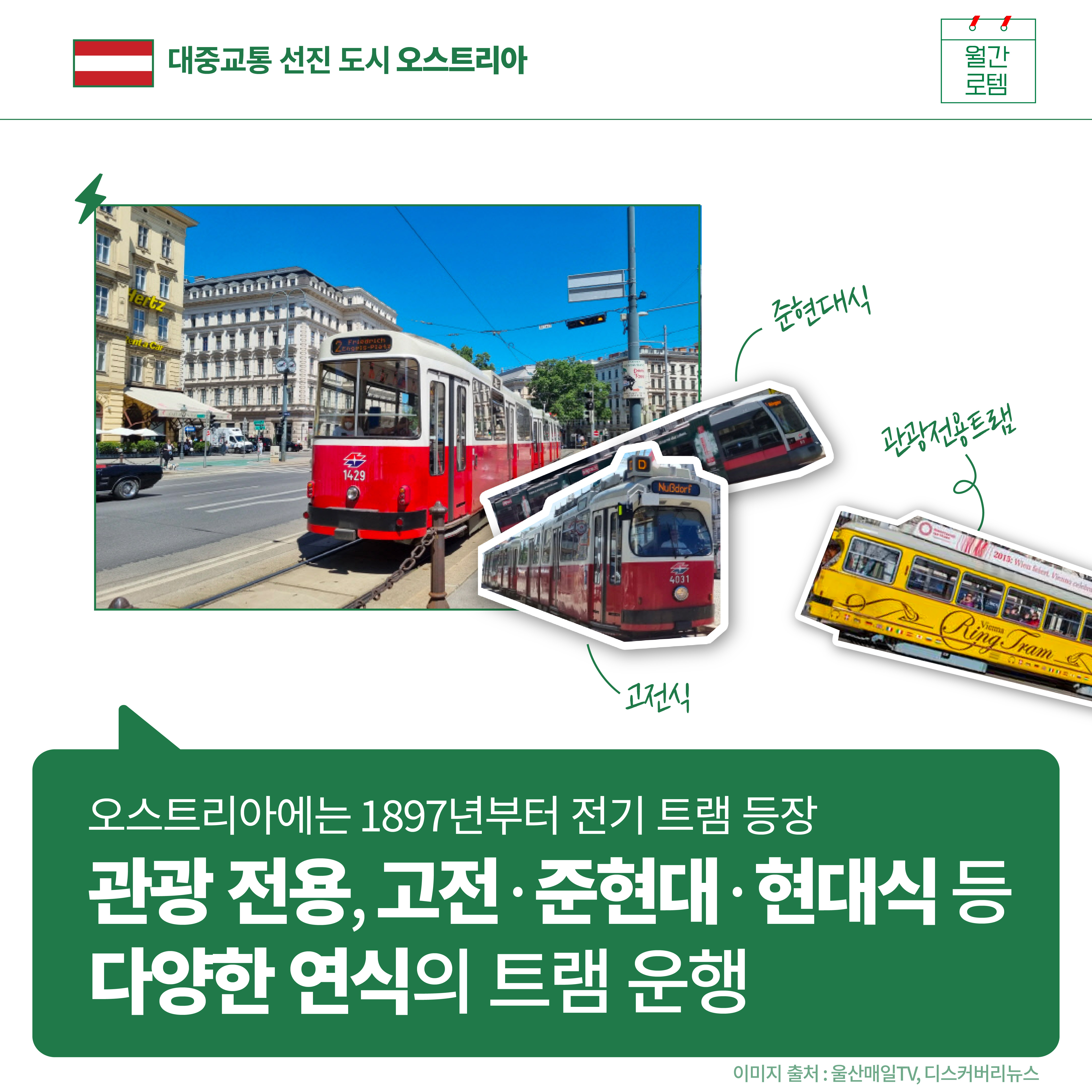 오스트리아 빈은 ‘트램 관광지’답게 트램을 주요 관광 자원으로 활용하고 있는데요. 약 5km의 링 슈트라세(Ringstrasse)대로를 돌며 명소를 주행하는 관광 전용 트램도 운행 중이에요. 오스트리아에는 1897년부터 전기 트램이 등장한 덕에, 빈에 가면 고전 트램과 준현대식, 현대식 트램 등 다양한 연식의 트램을 볼 수 있어요.