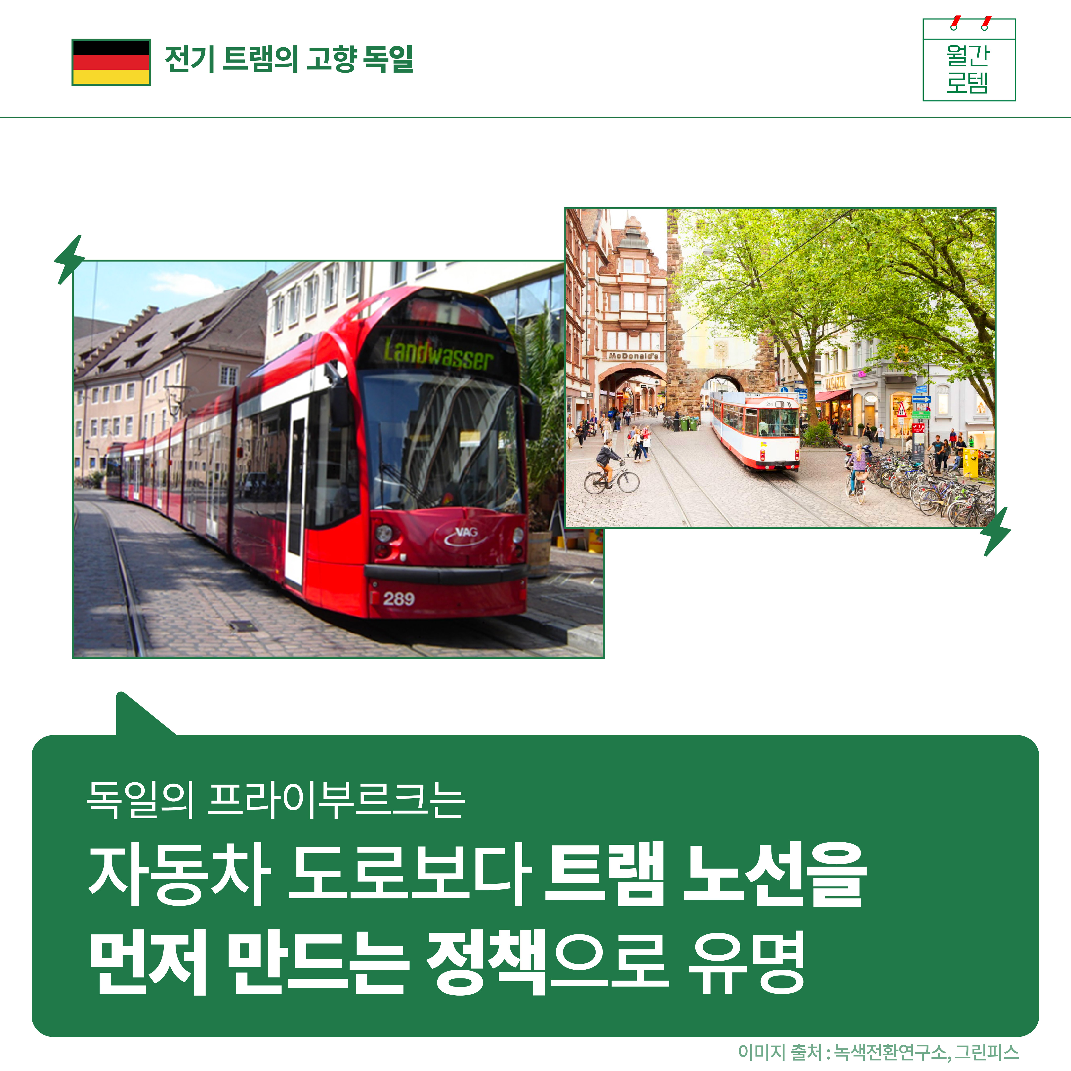 독일의 프라이부르크에서 찾기 힘든 것 중 하나가 바로 자동차인데요. 프라이부르크는 교통과 대기오염 문제를 해결하기 위한 정책으로 자동차 도로보다 트램 노선을 확충하여 시민들이 자가용보다 대중교통을 사용하도록 유도하는 정책을 펼친 것으로 유명하죠.