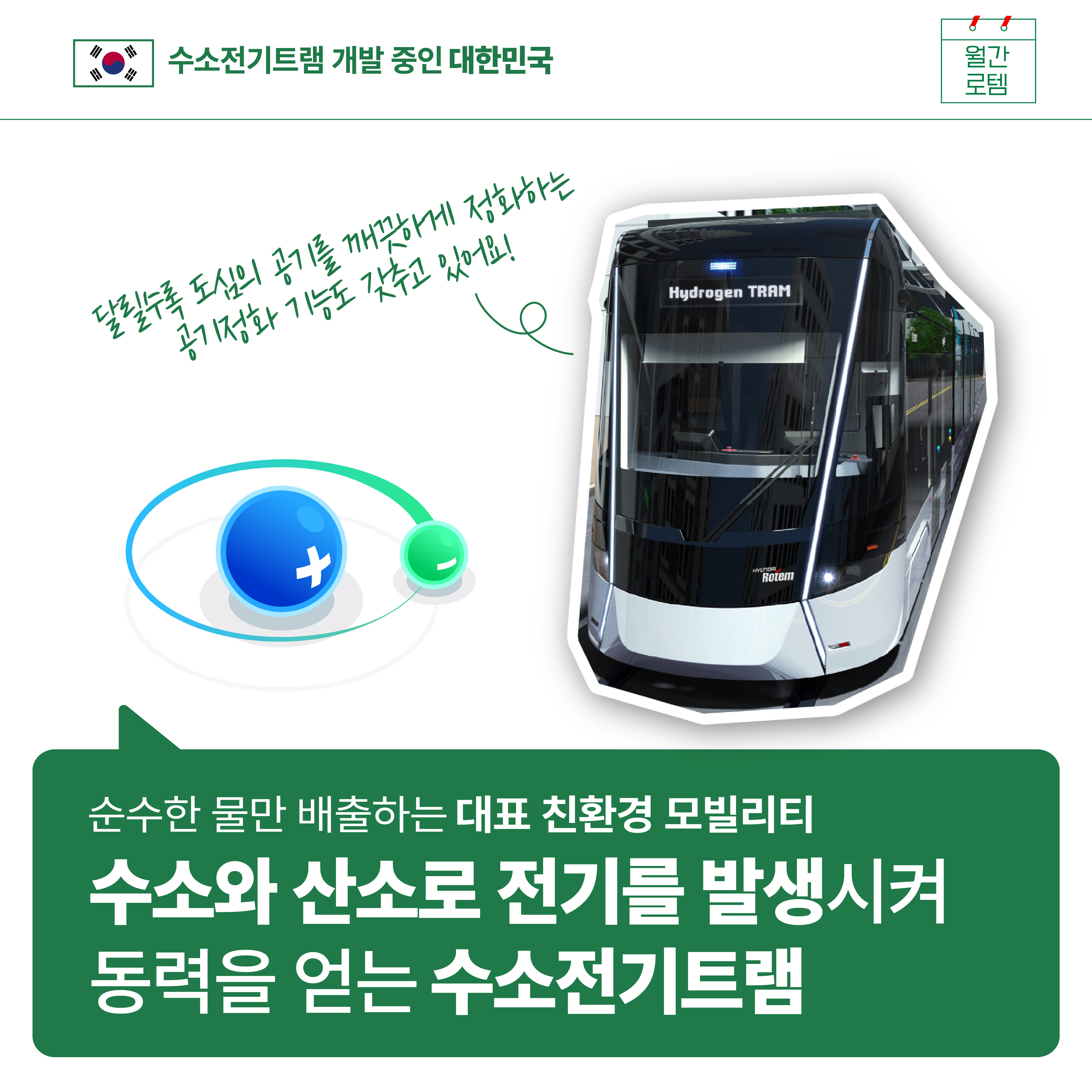 우리나라에서 트램이라는 모빌리티는 다소 생소하신 분도 계실텐데요. 바로 현대로템이 개발 중인 수소전기트램이에요. 수소전기트램은 수소와 산소로 전기를 발생시켜 동력을 얻어 운행됩니다. 전기를 생산하는 과정에 오염물질 대신 순수한 물만 배출하는 대표 친환경 모빌리티에요.