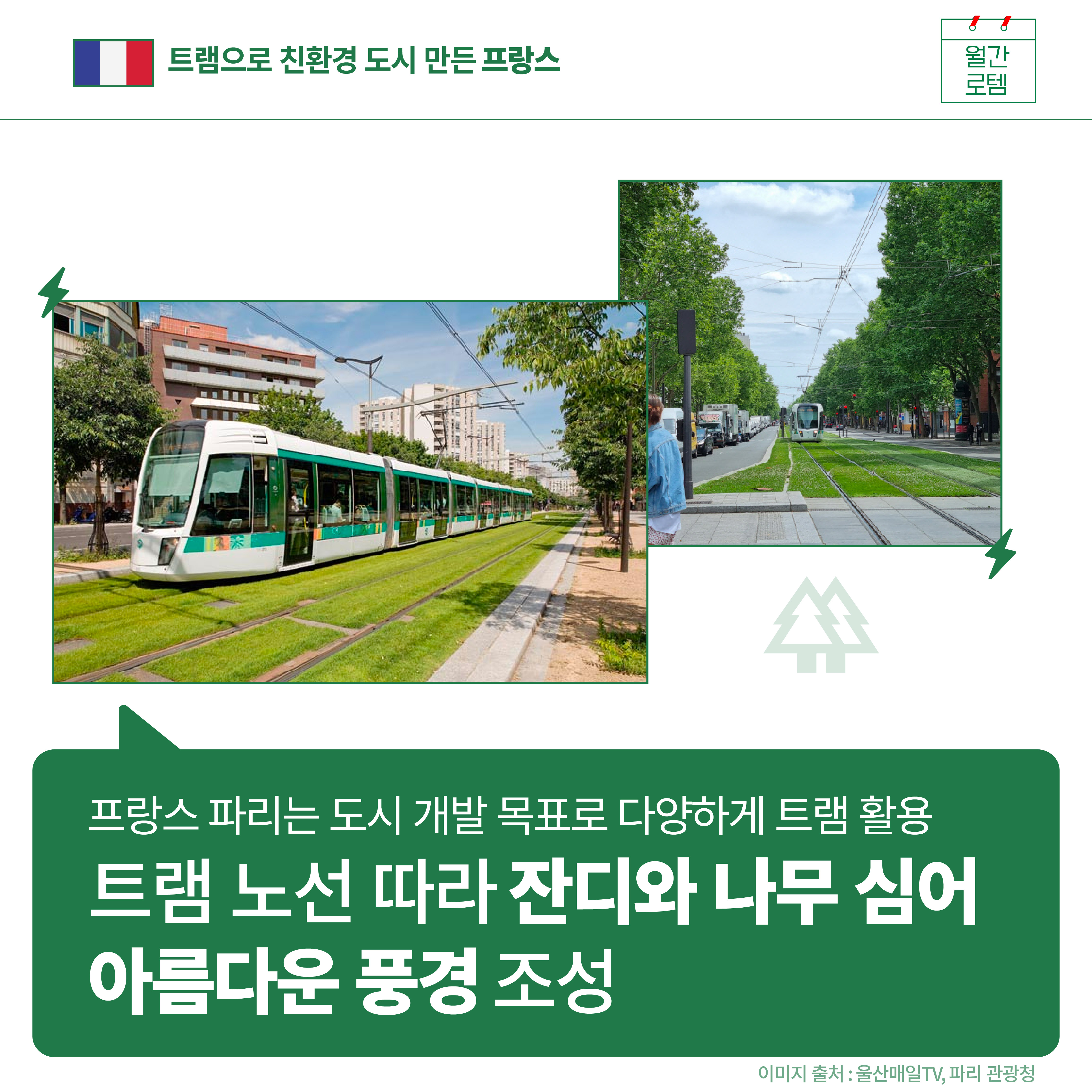 프랑스 파리는 도시 개발을 목표로 다양하게 트램을 활용했습니다. 복잡했던 교통 흐름을 개선하고, 트램 노선을 따라 잔디와 나무를 심어 도시 풍경을 아름답게 만들었어요.