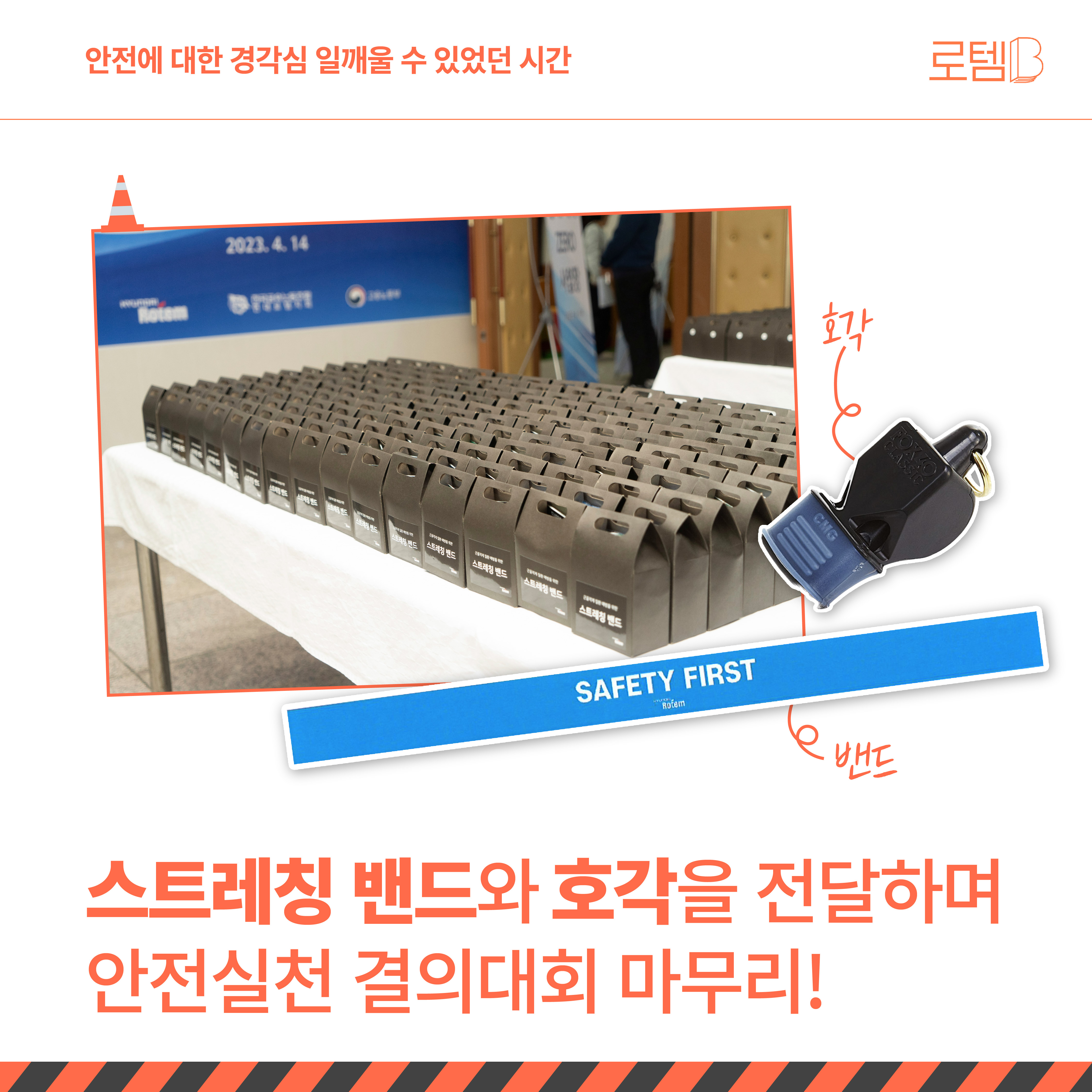 행사는 임직원에게 스트레칭 밴드와 관리감독자용 호각을 전달하며 성공적으로 마무리되었어요.