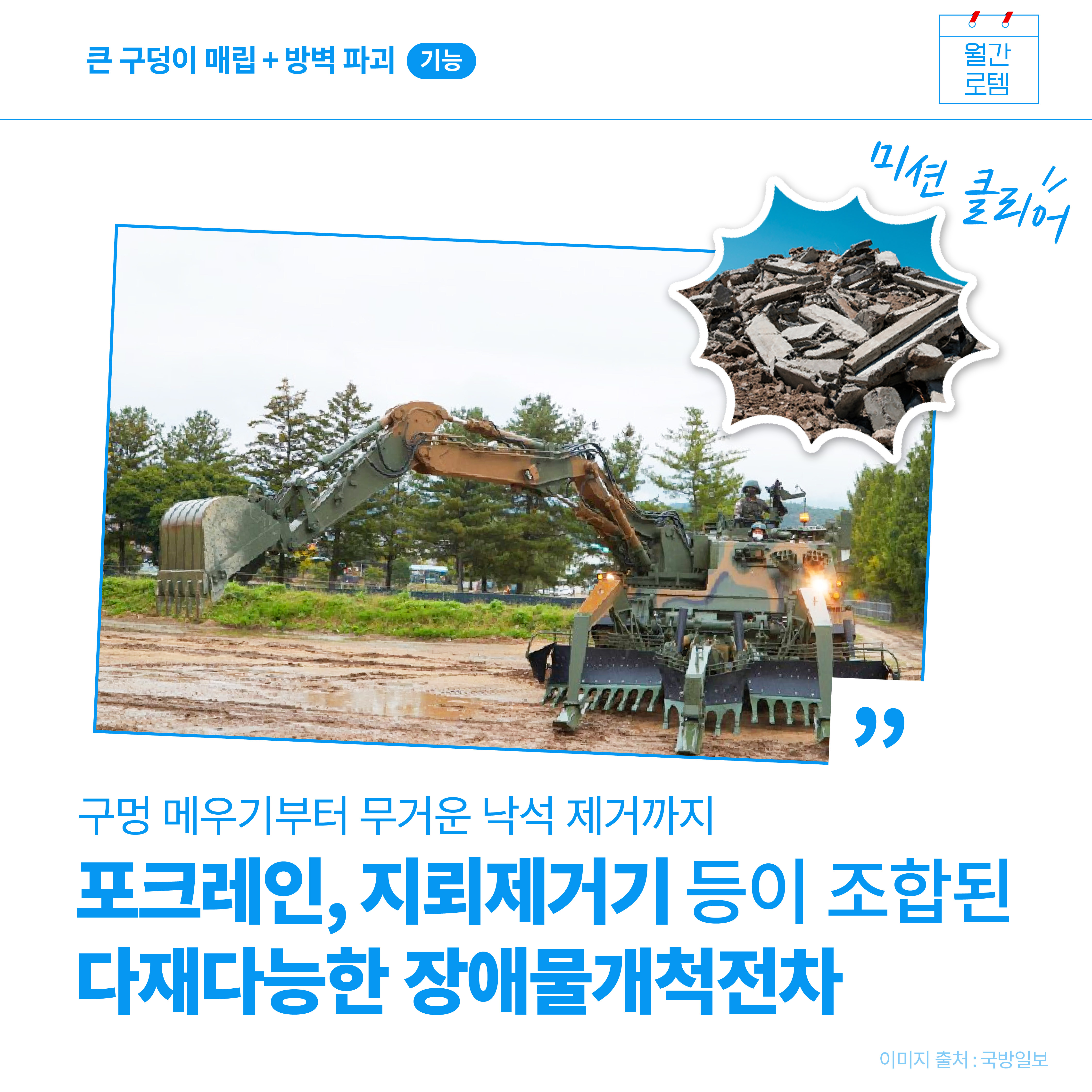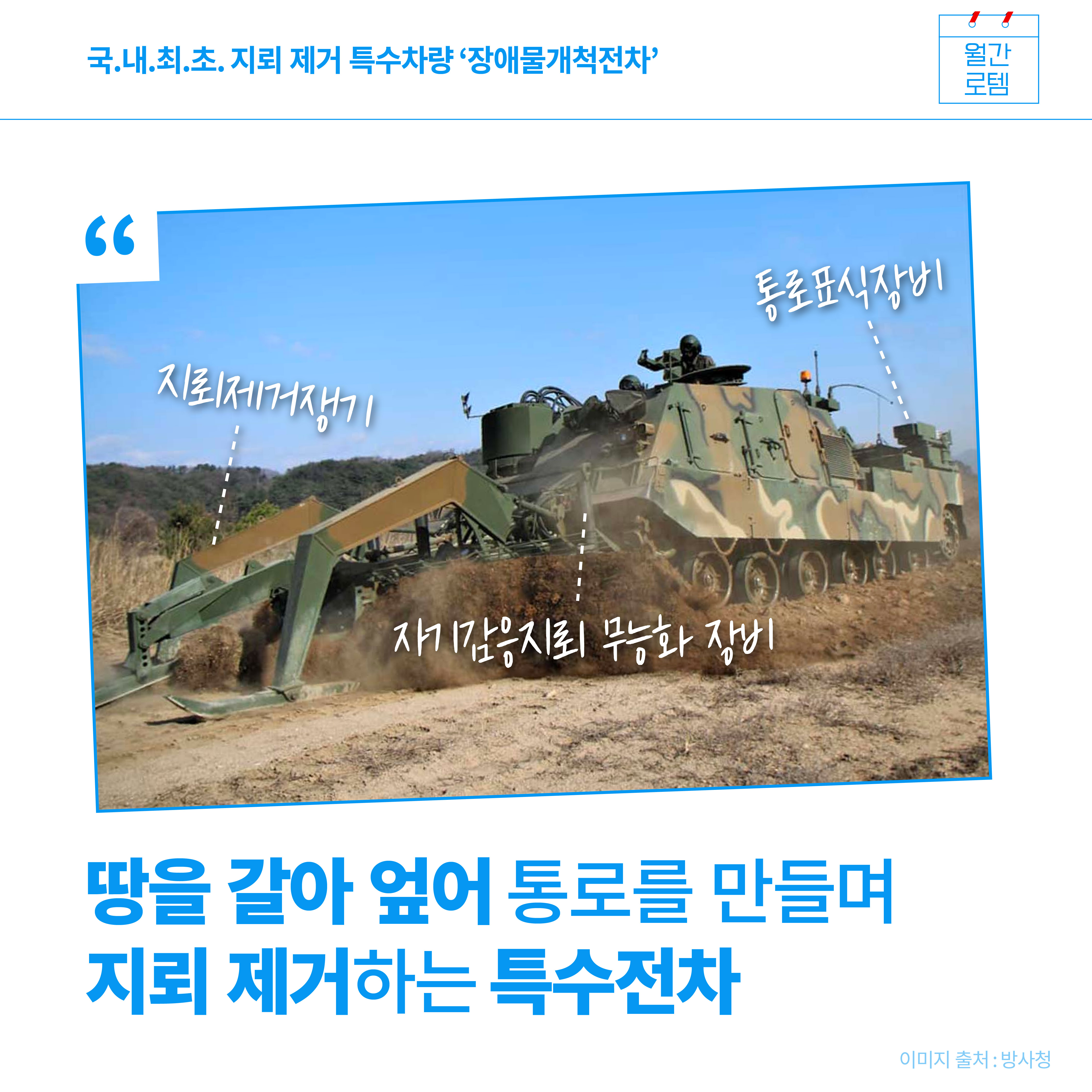 6월은 여느 때보다 마음이 먹먹해집니다. 한국전쟁이 있었고, 우리나라를 위해 몸바쳐 희생하신 순국선열을 기리는 달이기 때문입니다. 전쟁 후 70여 년이 흘렀지만 비무장지대(DMZ)에는 지뢰가 여전히 많이 묻혀 있다고 합니다. 모두 제거하는 데에도 꽤 긴 시간이 걸린다고 하는데요. 6월 월간로템에서는 지뢰 제거 등 다양한 임무를 수행할 수 있는 장애물개척전차를 소개합니다.