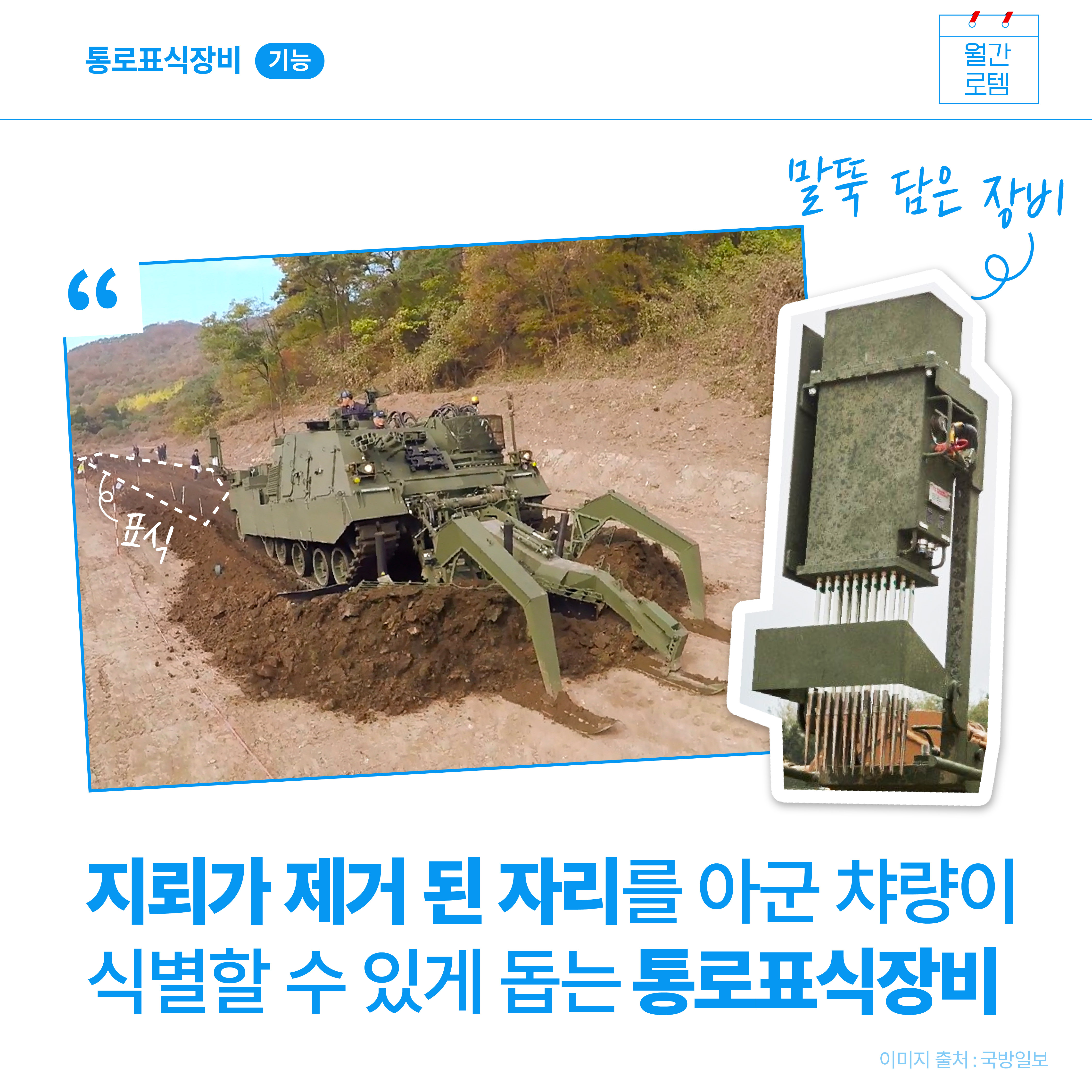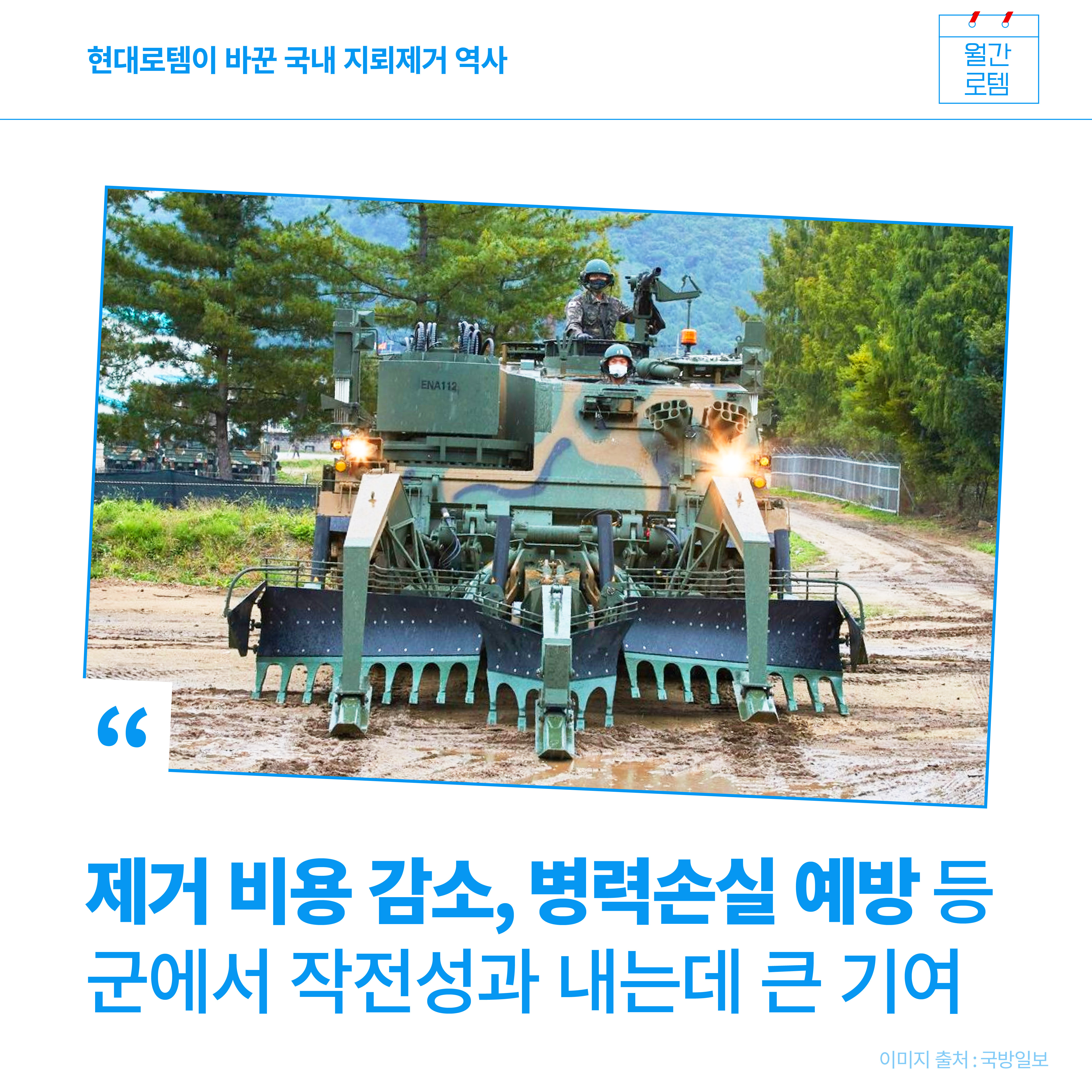 6월은 여느 때보다 마음이 먹먹해집니다. 한국전쟁이 있었고, 우리나라를 위해 몸바쳐 희생하신 순국선열을 기리는 달이기 때문입니다. 전쟁 후 70여 년이 흘렀지만 비무장지대(DMZ)에는 지뢰가 여전히 많이 묻혀 있다고 합니다. 모두 제거하는 데에도 꽤 긴 시간이 걸린다고 하는데요. 6월 월간로템에서는 지뢰 제거 등 다양한 임무를 수행할 수 있는 장애물개척전차를 소개합니다.