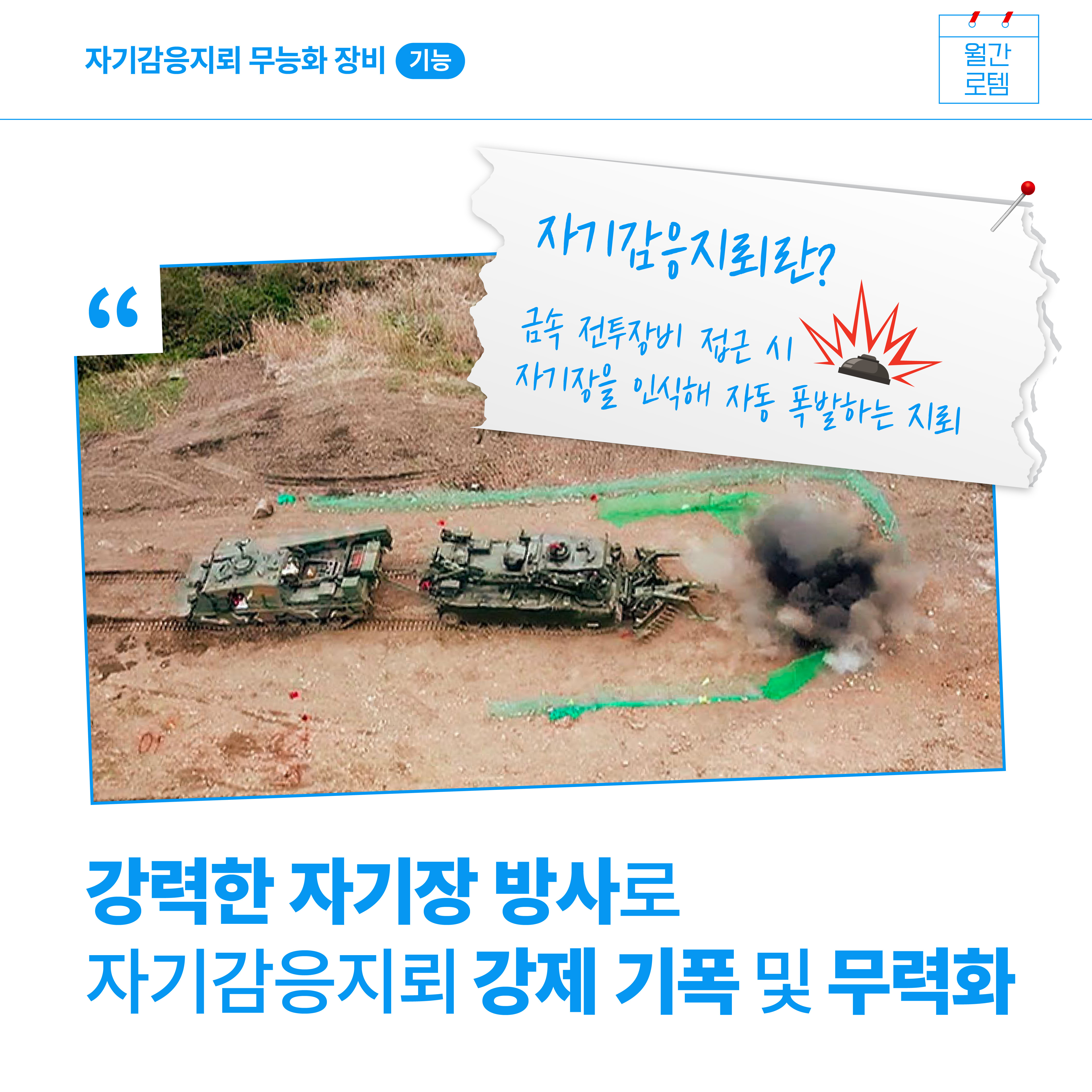 장애물개척전차는 일반지뢰뿐만 아니라, 자기감응지뢰 무능화장치를 통해 자기감응지뢰도 함께 제거할 수 있는 장치를 가지고 있는데요. 자기감응지뢰 무능화장치는 금속 전투장비가 접근할 시 장기장을 인식해 자기감응지뢰를 자동으로 폭발시키는 장치입니다. 장애물개척전차는 이처럼 전방 5m에 강력한 자기장을 방사해 자기감응지뢰가 강제로 기폭, 무력화 되도록 하므로 모든 지뢰에 대해 개척이 가능한 차량이라고 볼 수 있습니다.