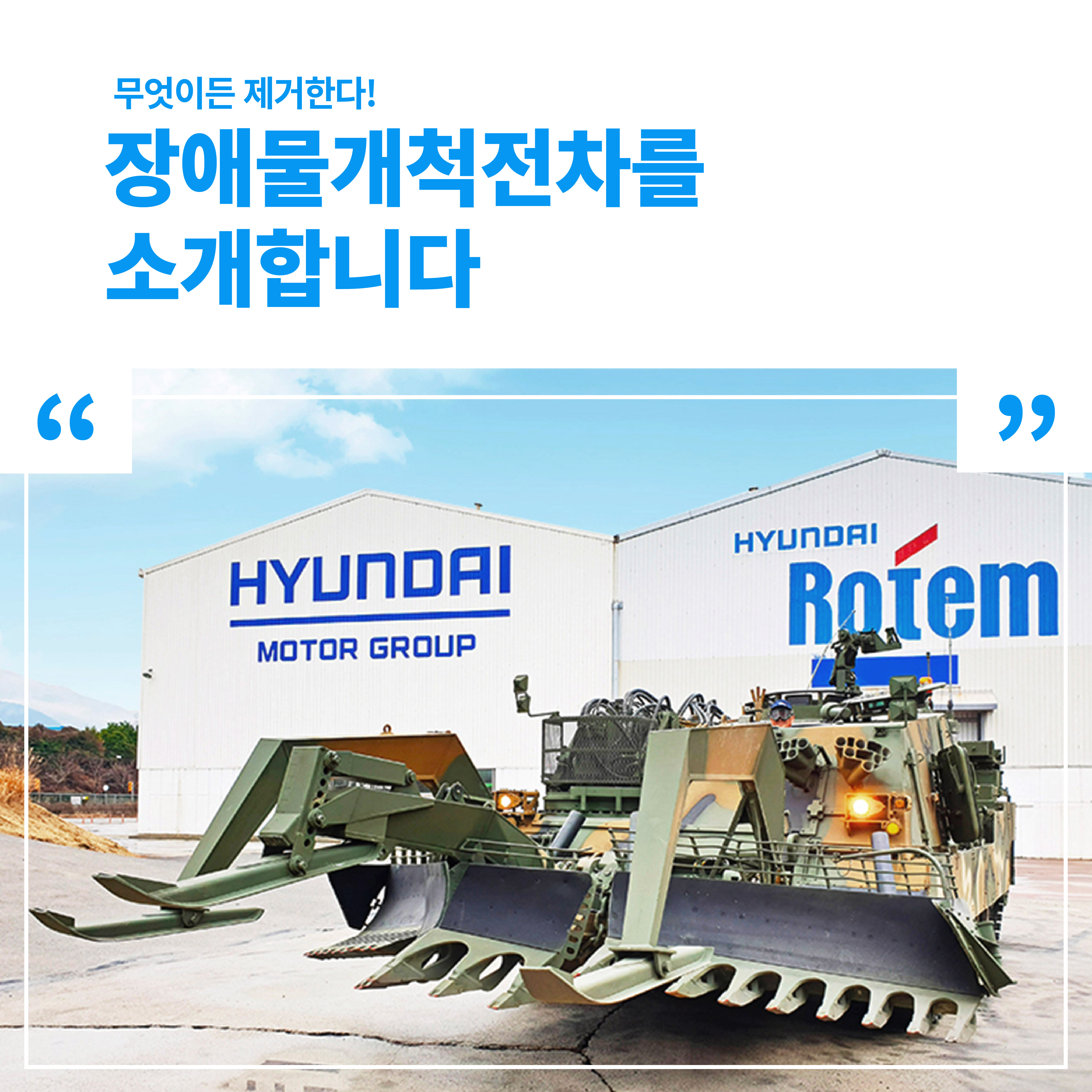 이를 보안할 수 있는 현대로템의 ‘장애물개척전차’의 개발로 인해 기존보다 18배 이상 신속하게 통로를 개척할 수 있게 되었으며, 제거 비용의 감소와 병력손실 예방 등 군에서 작전성과를 내는데 큰 기여를 하게 되었습니다.