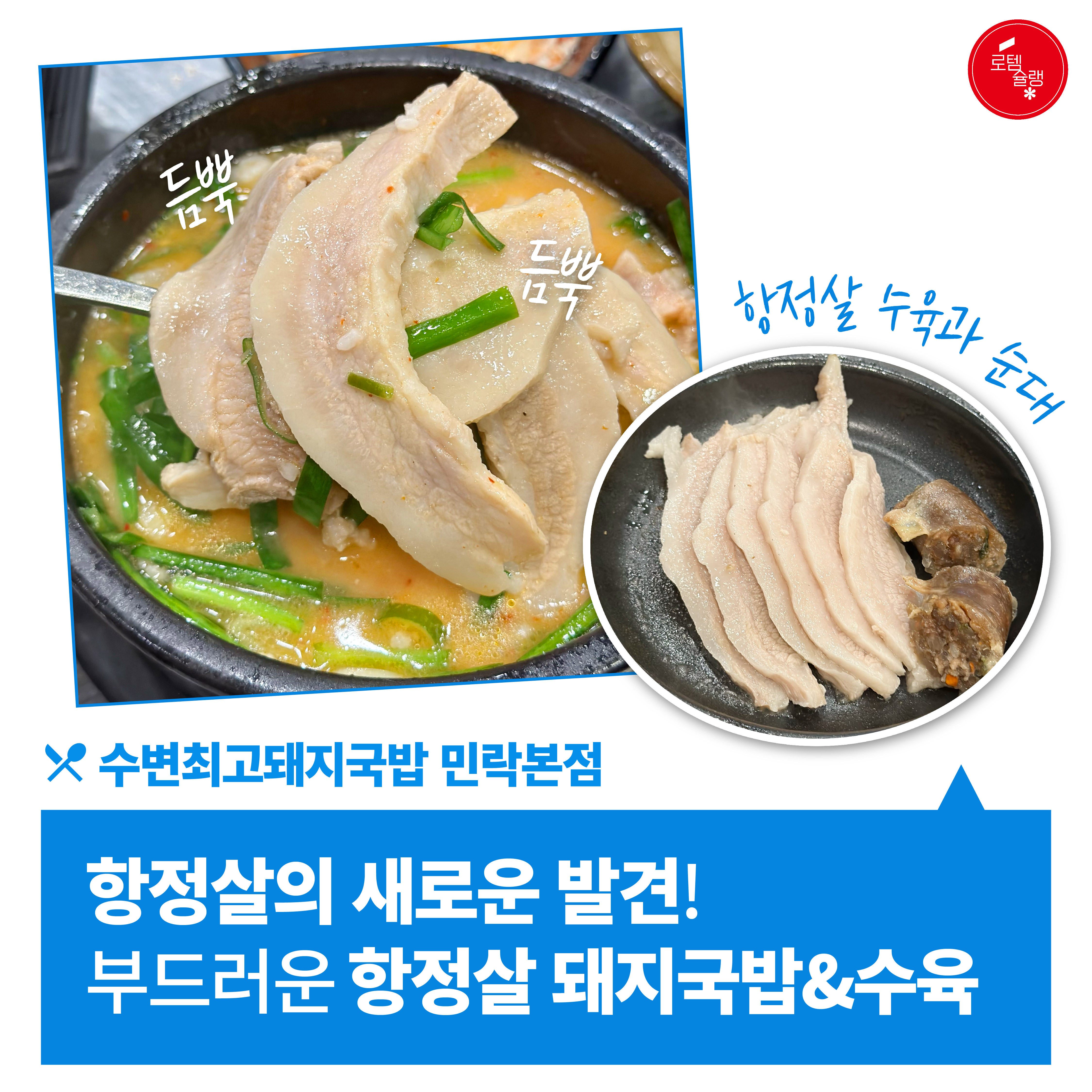부산하면 가장 먼저 떠오르는 음식은 첫번째 맛집은 돼지 항정살로 만든 돼지국밥과 수육, 촉촉한 순대가 유명한 ‘수변최고돼지국밥'입니다.
