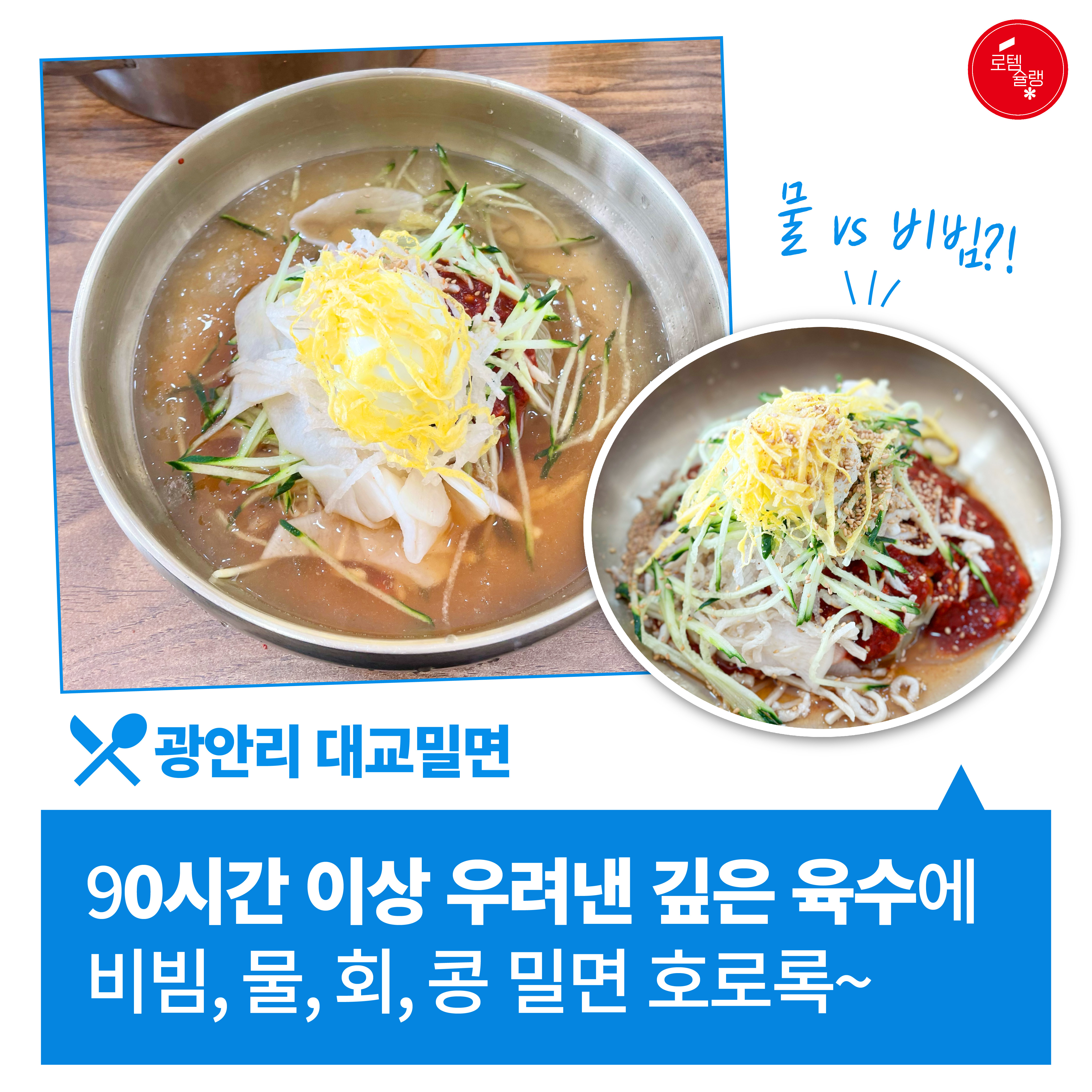 광안리 대교밀면에서는 비빔, 물, 회, 콩 등 밀면을 다양하게 만날 수 있는데요. 밀면 육수는 갖가지 한약재와 소고기, 채소 등을 90시간 이상 끓여 만들었다고 해요. 그래서인지 깊지만 담백한 육수를 넣은 물밀면은 아주 특별했습니다. 보통 물밀면은 하얀 육수인데 이곳은 다대기를 넣어 붉은 물밀면입니다. 시원해서 계속해서 들이켜게 되더라고요.