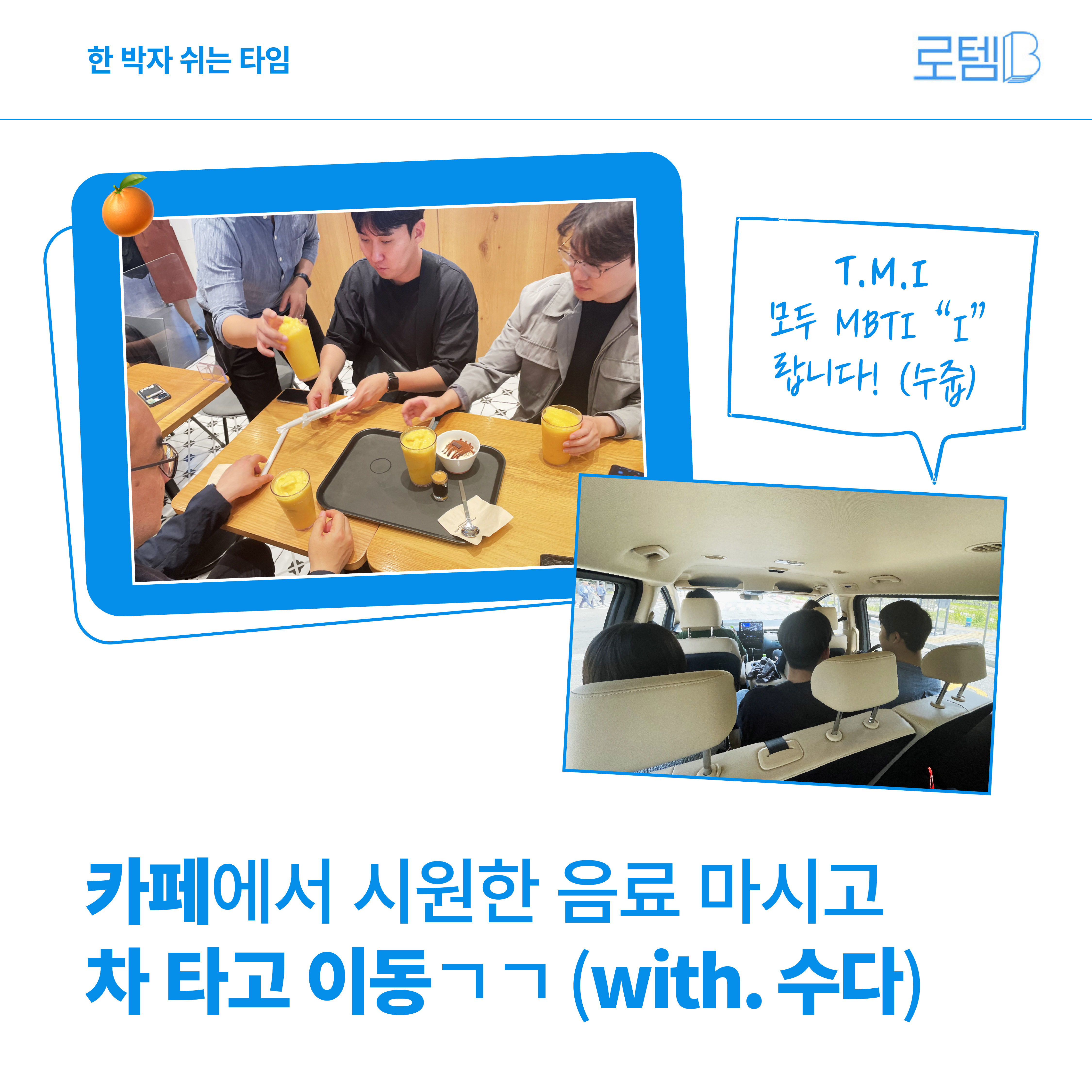 카페로 이동해서 한숨 돌린 뒤 다음 장소로 이동했는데요. 이동하는 동안 각자의 취미, 좋아하는 드라마 등 평소 회사에서 하지 못했던 이야기를 나누니 서로의 거리가 조금 줄어든 것 같았어요. 이야기를 하다 보니 이번 2조 멤버들은 MBTI가 I로 시작한다는 것도 이번 기회에 알게 되었고요.