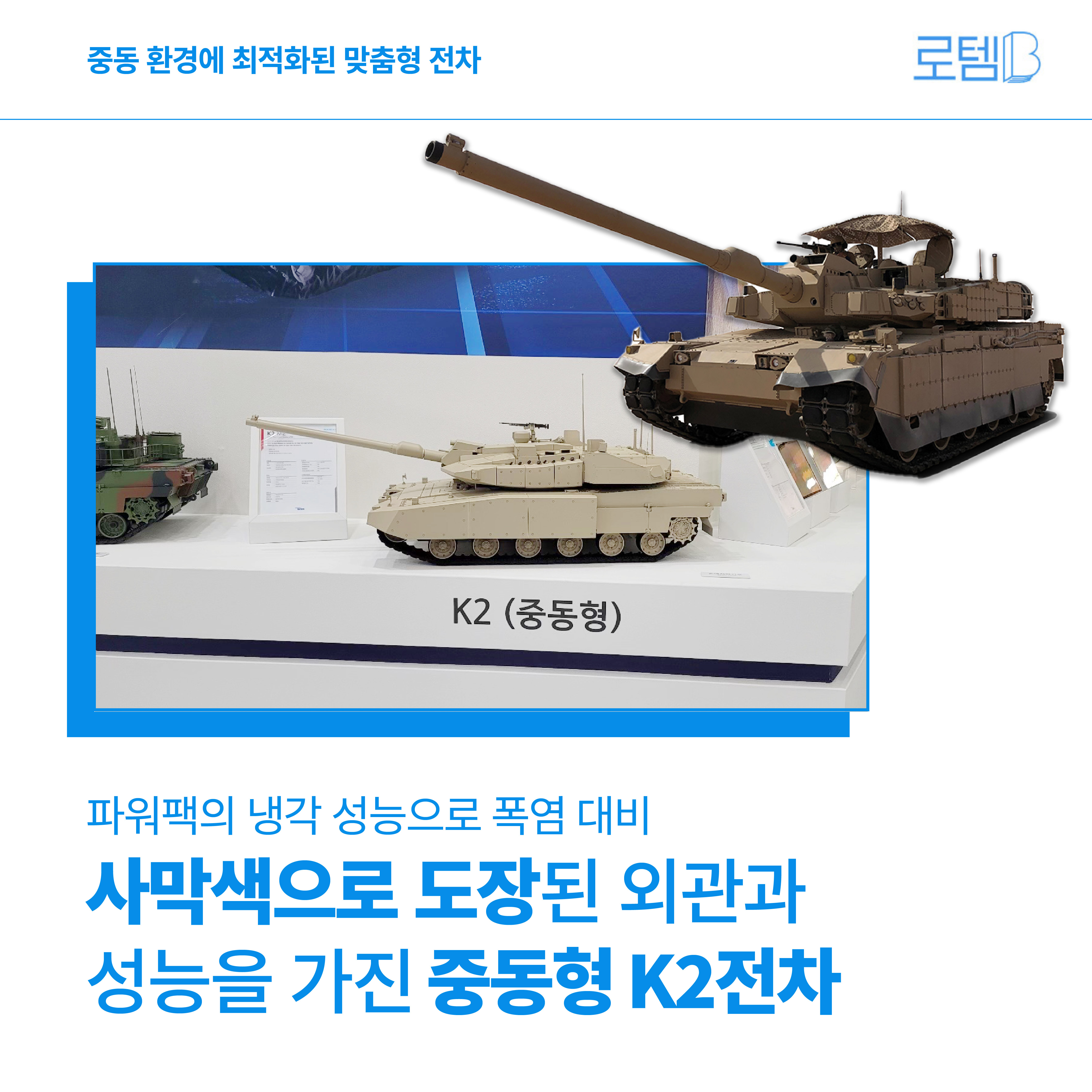 중동형 K2전차는 현지 특성상 엄청난 폭염에 대비할 수 있도록 제작됐어요. 특수 고무 재질의 궤도가 장착돼 파워팩의 냉각 성능 사양이 한층 강화된 차량인데요. 중동 환경에 최적화된 맞춤형 전차라고 볼 수 있습니다.