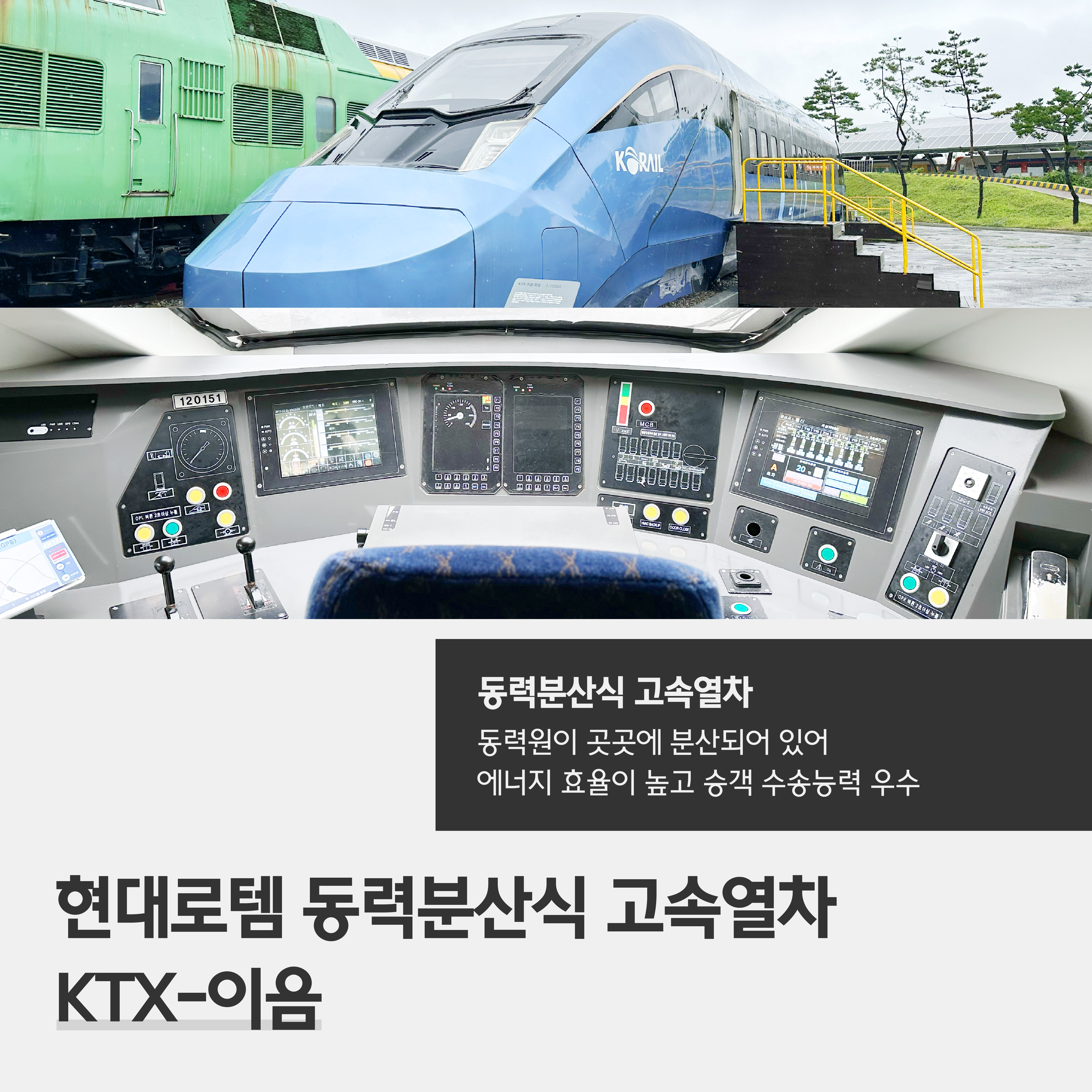 마지막으로 현대로템의 동력분산식 고속열차 KTX-이음 목업도 전시되어 있습니다. 현대로템은 최고 운행 속도 260km/h와 320km/h로 달릴 수 있는 EMU-260/320 고속열차를 생산 출고한 바 있는데요. KTX-이음은 최고속도 260㎞/h 로 운행이 가능한 고속열차예요. 동력원이 곳곳에 분산되어 있어 에너지 효율이 높고 승객 수송능력 또한 우수한 것이 특징인데요.