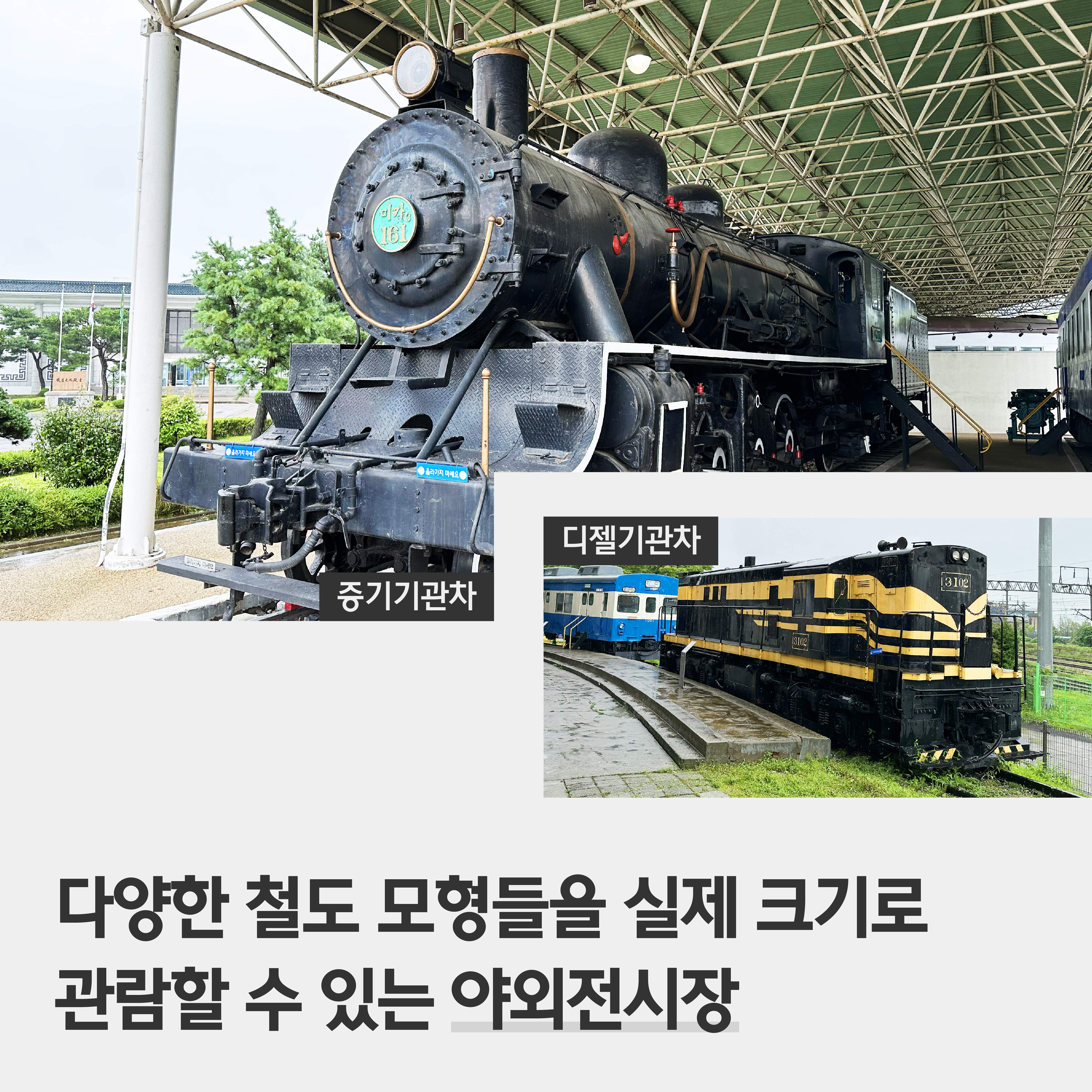 야외 전시장에는 우리나라에서 운행됐던 통일호객차, 협궤객차 등 다양한 철도 모형들이 실제 크기로 전시돼 있어요. 1970, 80년대를 대표했던 디젤기관차와 증기기관차가 단연 눈에 띕니다.