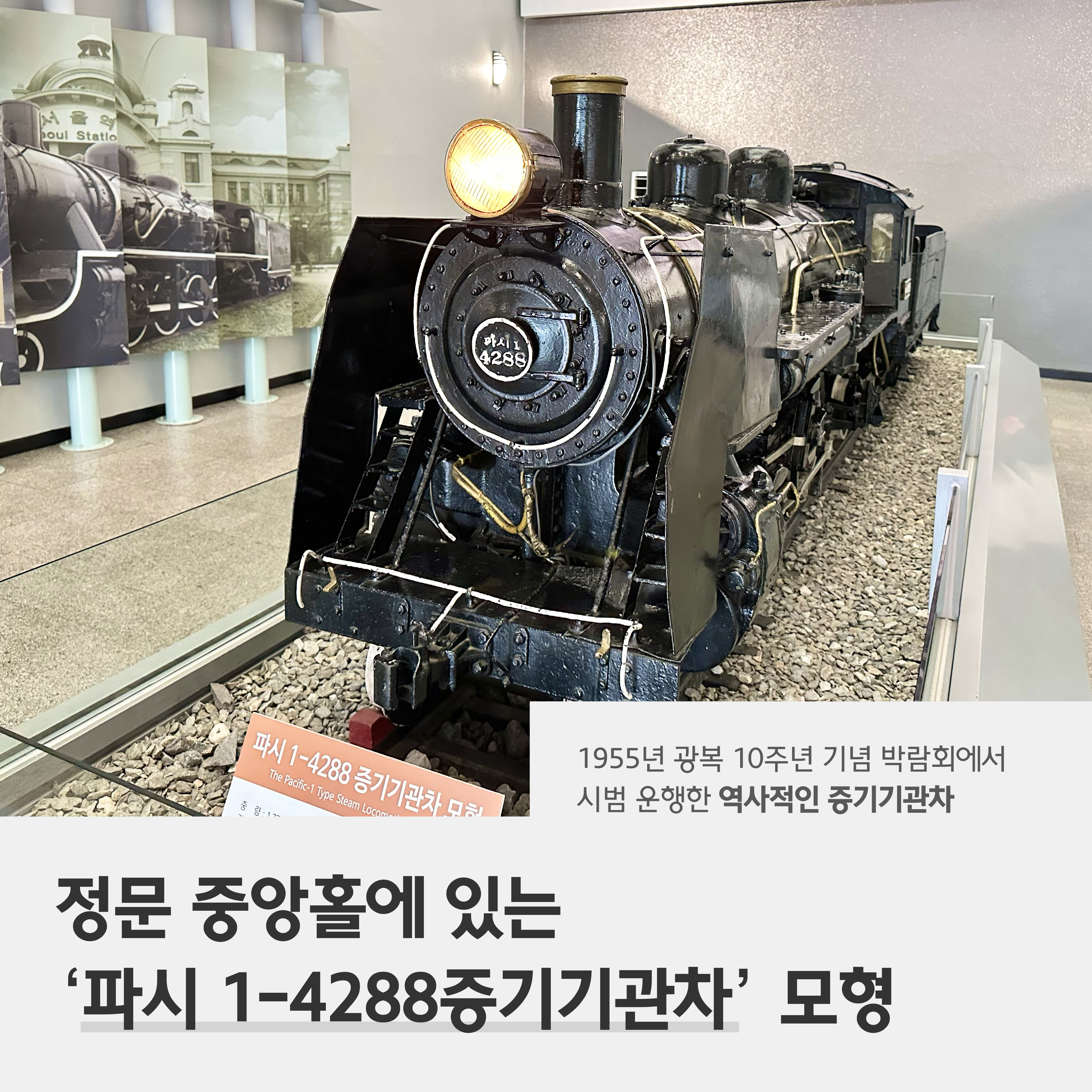 1층 전시실에는 역사실, 차량실, 철도체험실 등이 있는데요. 정문으로 들어서면 중앙홀에 있는 ‘파시 1-4288증기기관차’ 모형을 가장 먼저 만나볼 수 있습니다. 이 기관차는 1930년에 제작, 1955년 광복 10주년 기념 박람회에서 창경궁 구내를 시범 운행하는 등 역사적 의미가 있어요.