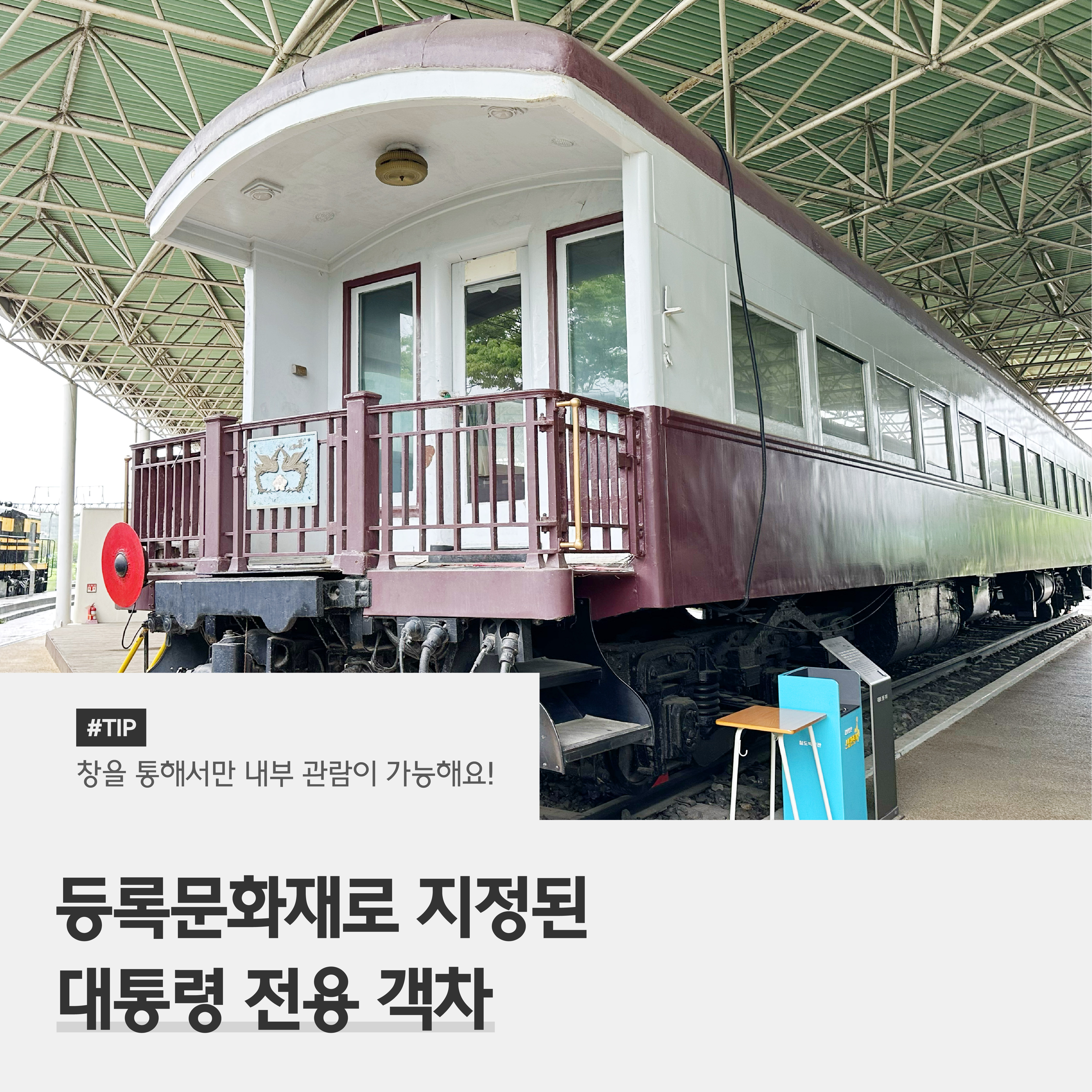 대통령 전용 객차 역시 이색적인 볼거리인데요. 고(故) 이승만 대통령부터 고(故) 박정희 대통령까지 장기간 이용한 철도 차량이에요. 내부에는 주방, 침실, 샤워실 등 왠만한 편의시설이 마련돼 있어 일반 객차보다 훨씬 편리하게 제작됐다고 해요. 다만 등록문화재로 지정돼 창을 통해서만 내부를 관람할 수 있답니다.