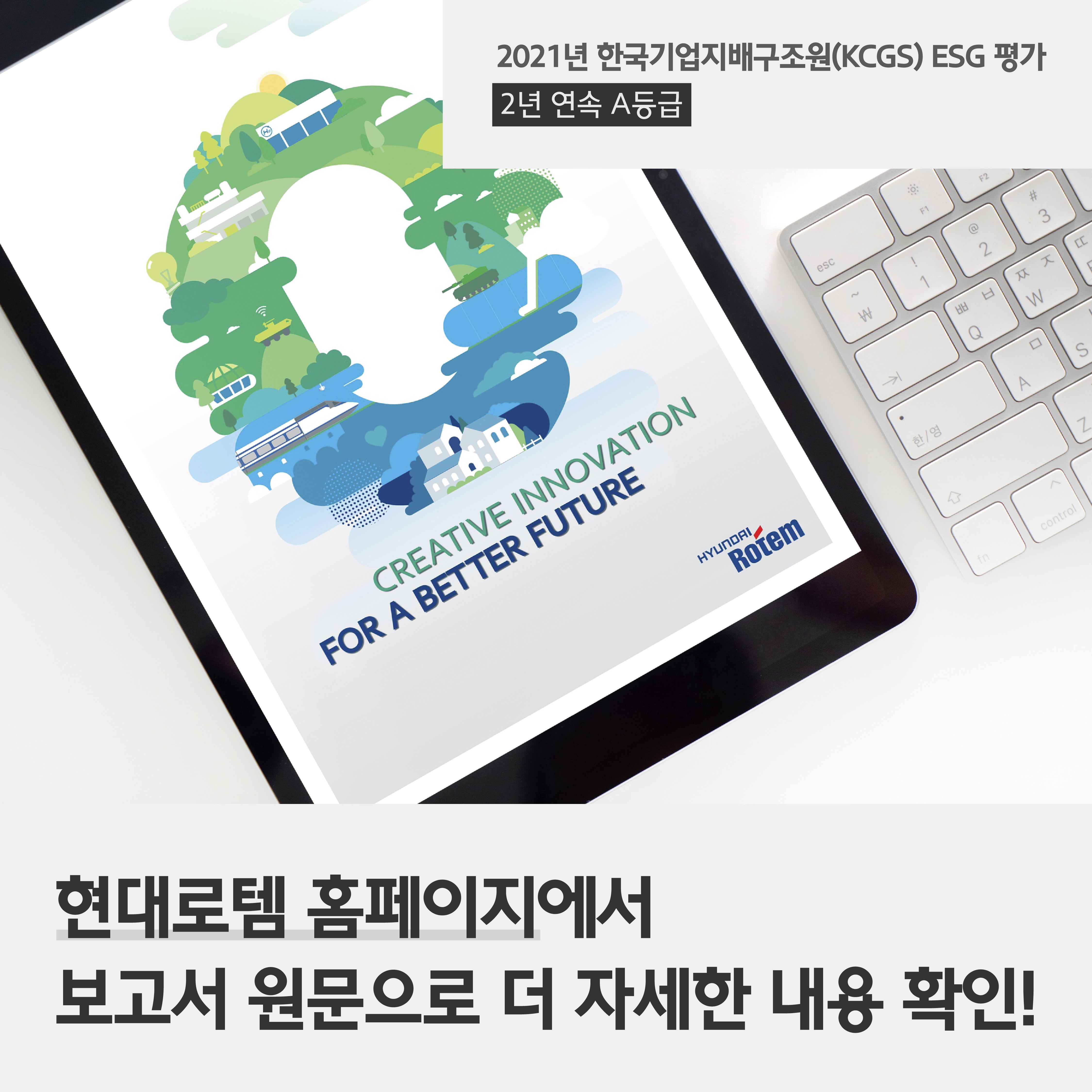 현대로템은 2021년도부터 한국기업지배구조원(KCGS) ESG 평가에서 2년 연속 A등급을 받은 만큼 앞으로도 당사 활동과 성과를 투명하게 공개하고 적극적으로 소통해 나갈 예정입니다.